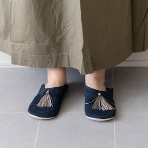 柔らかなスエード革をセレクト。深いブルーグレーの羊革に、グレー寄りの光沢感があるシルクタッセルを組み合わせました。