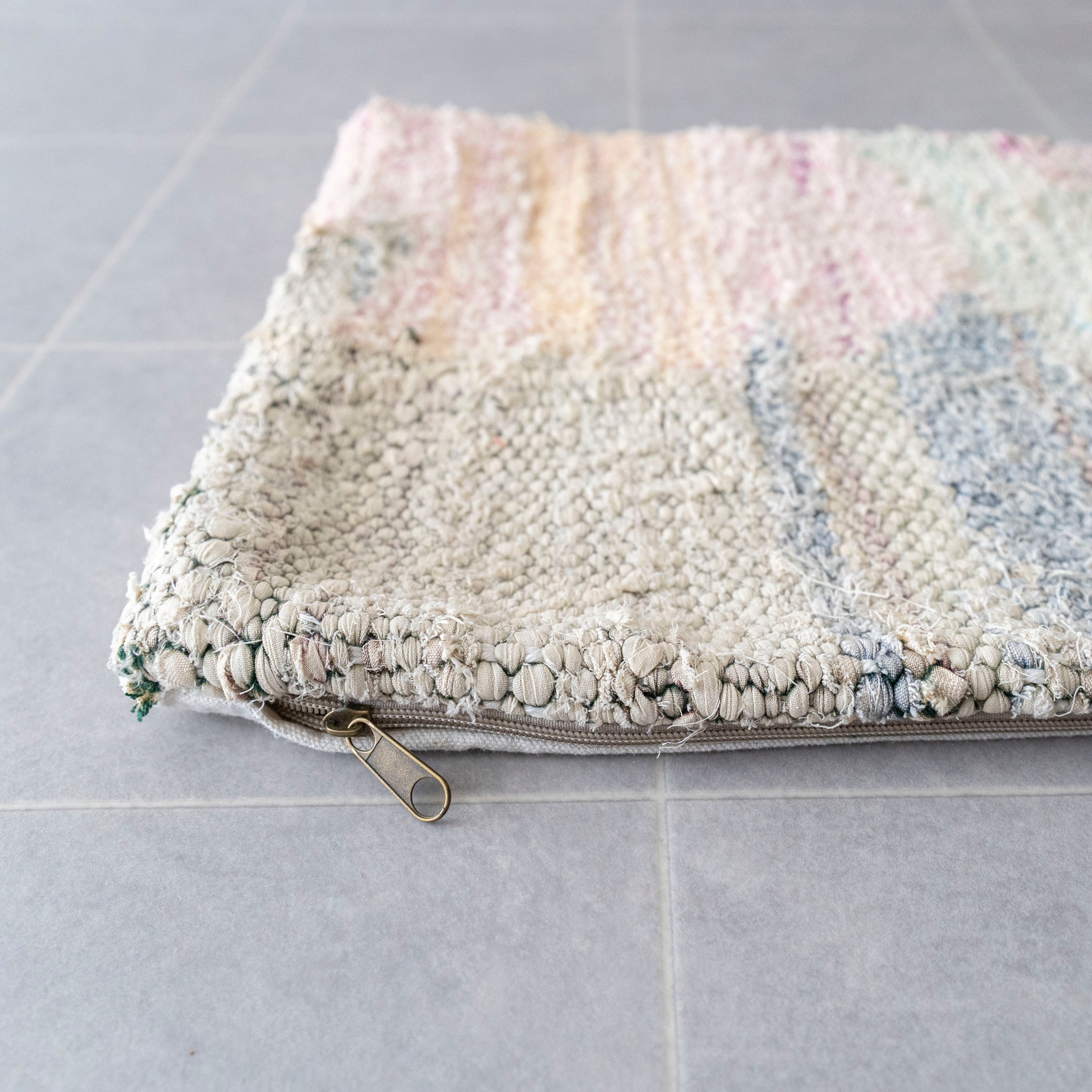数あるヴィンテージラグの中から柄が綺麗なものを選んで、何度も洗いを掛けて褪色加工を施しクッションカバーに加工。コットン素材のさらっとしたタッチとランダムに飛び出した糸が特徴です。