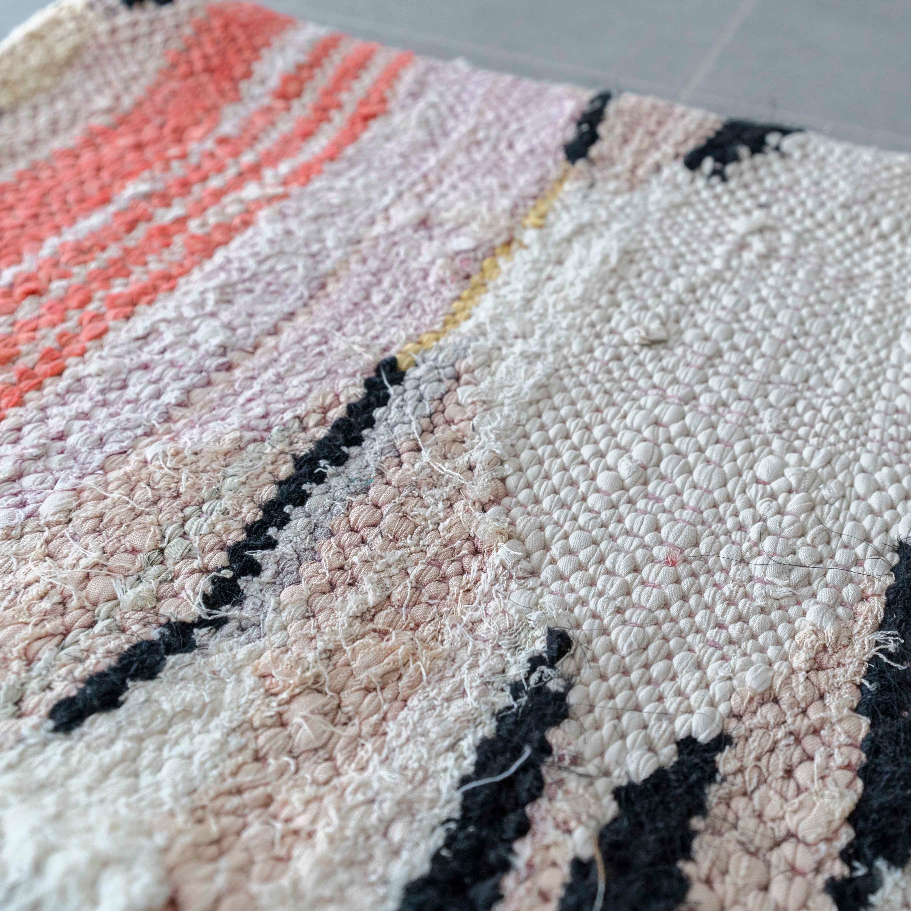 アトラス山脈をはじめ、モロッコ各地のベルベル村の女性達によって織られる絨毯、ボ・シャルウィット。素材は全て服の端切でできたリサイクル絨毯で、「シャルウィット」はベルベル語で端切れという意味です。遊牧生活から定住生活に変わったことで、羊を買う必要性がなくなったことから、リサイクルが得意なベルベルの女性たちは羊の毛の代わりに自分たちの着なくなった服を裂いて織り始めました。ウールのラグよりも歴史が浅いため、「家のために」「嫁入り道具として」織られた古いボ・シャルウィットは今では見つかりにくくなりました。