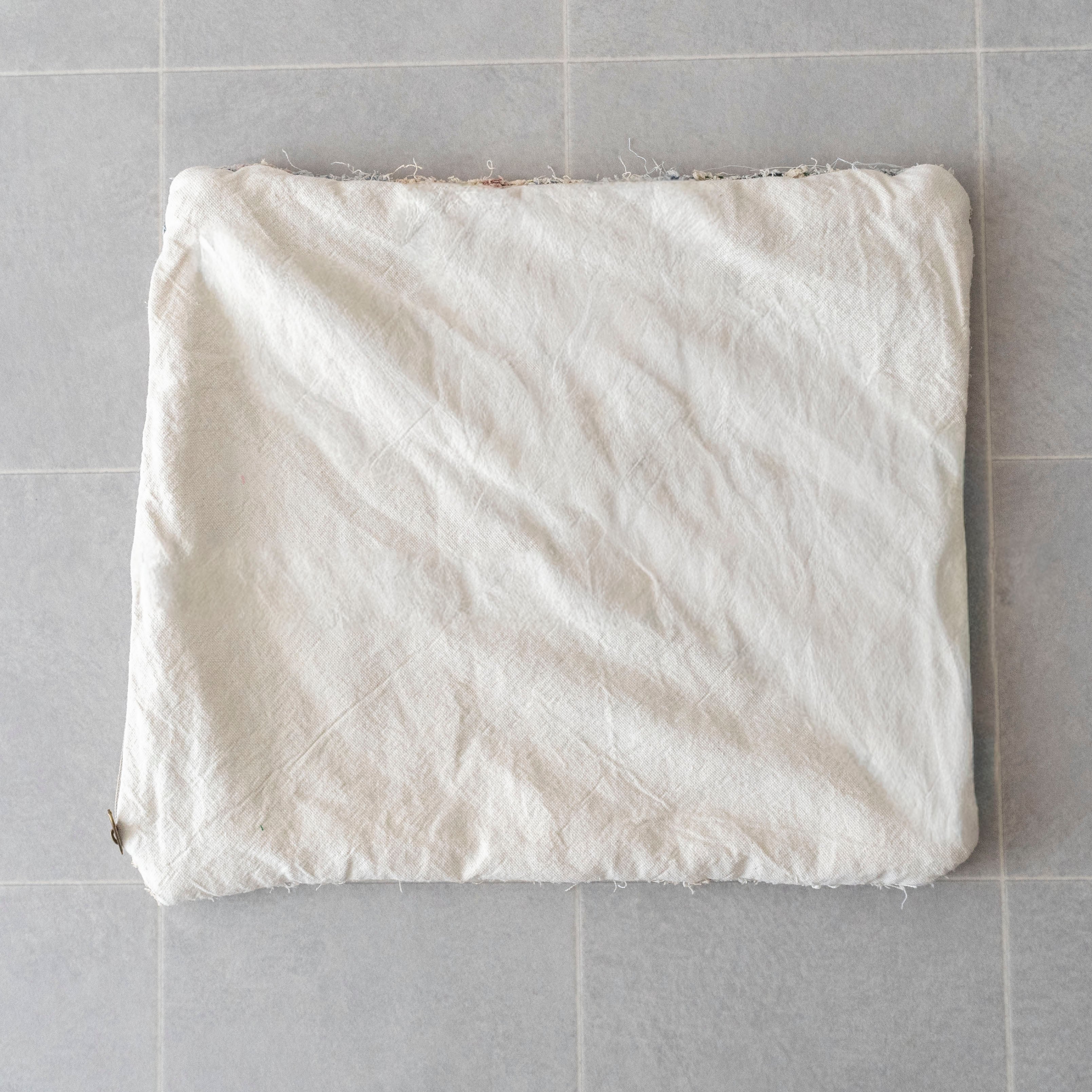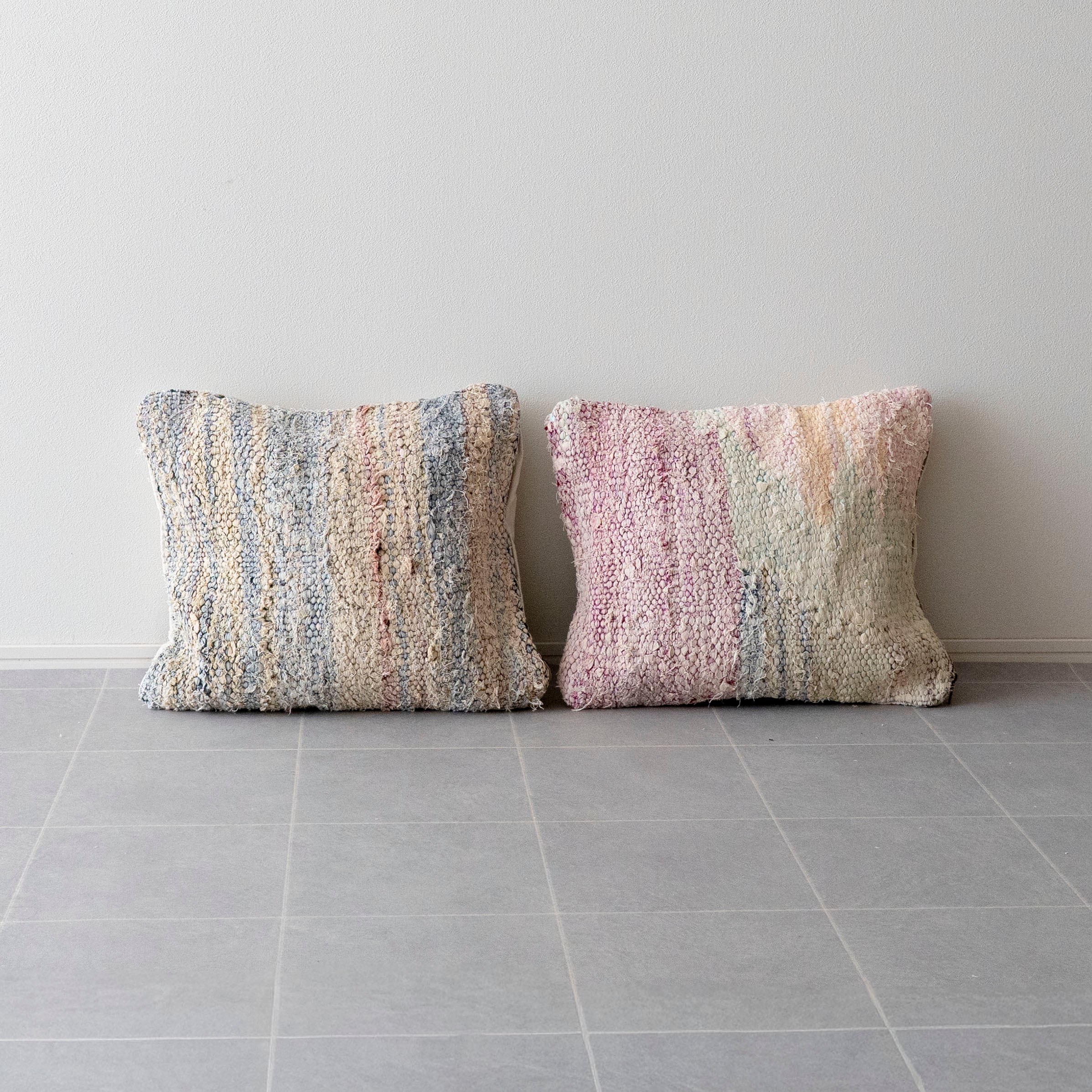 数あるヴィンテージラグの中から柄が綺麗なものを選んで、何度も洗いを掛けて褪色加工を施しクッションカバーに加工。コットン素材のさらっとしたタッチとランダムに飛び出した糸が特徴です。