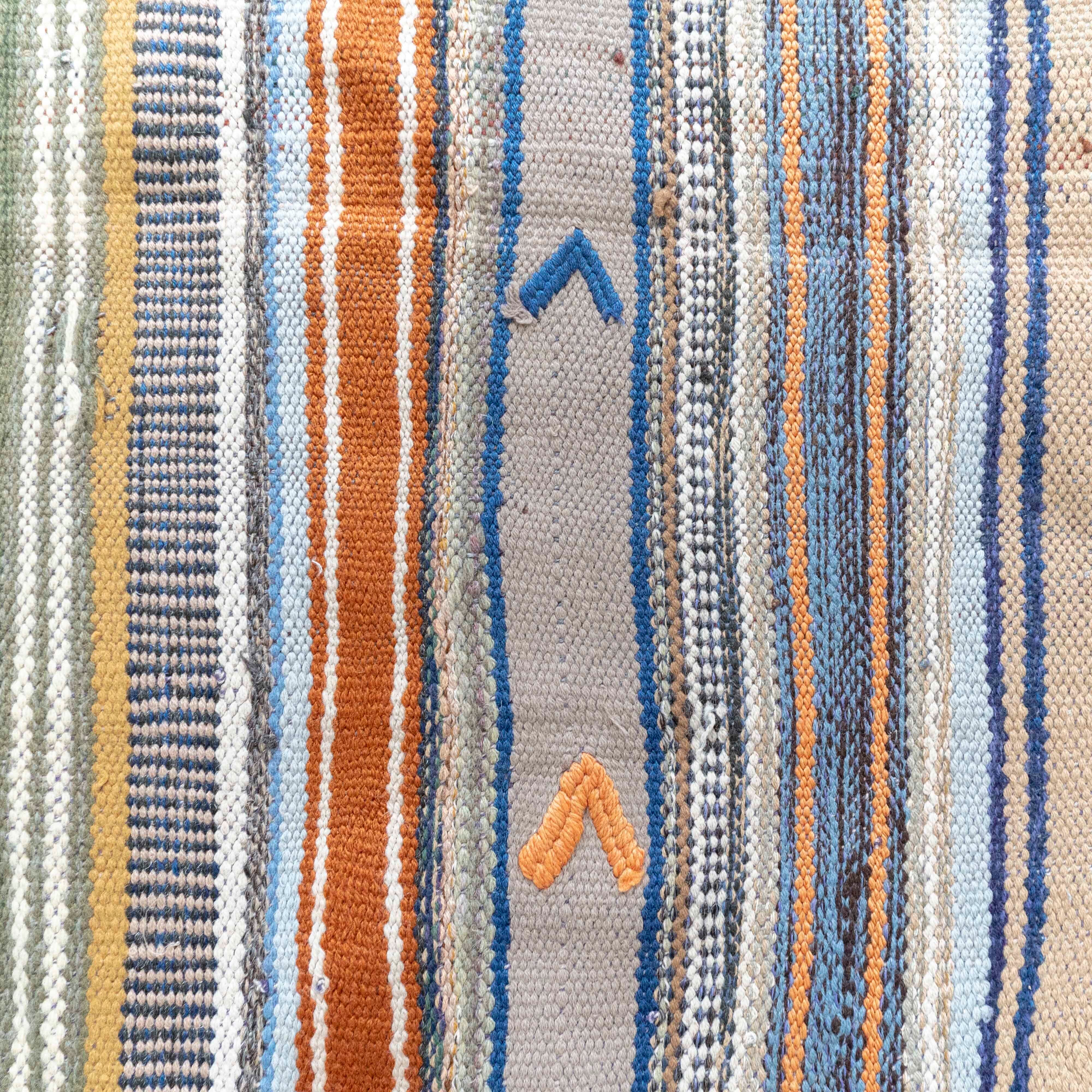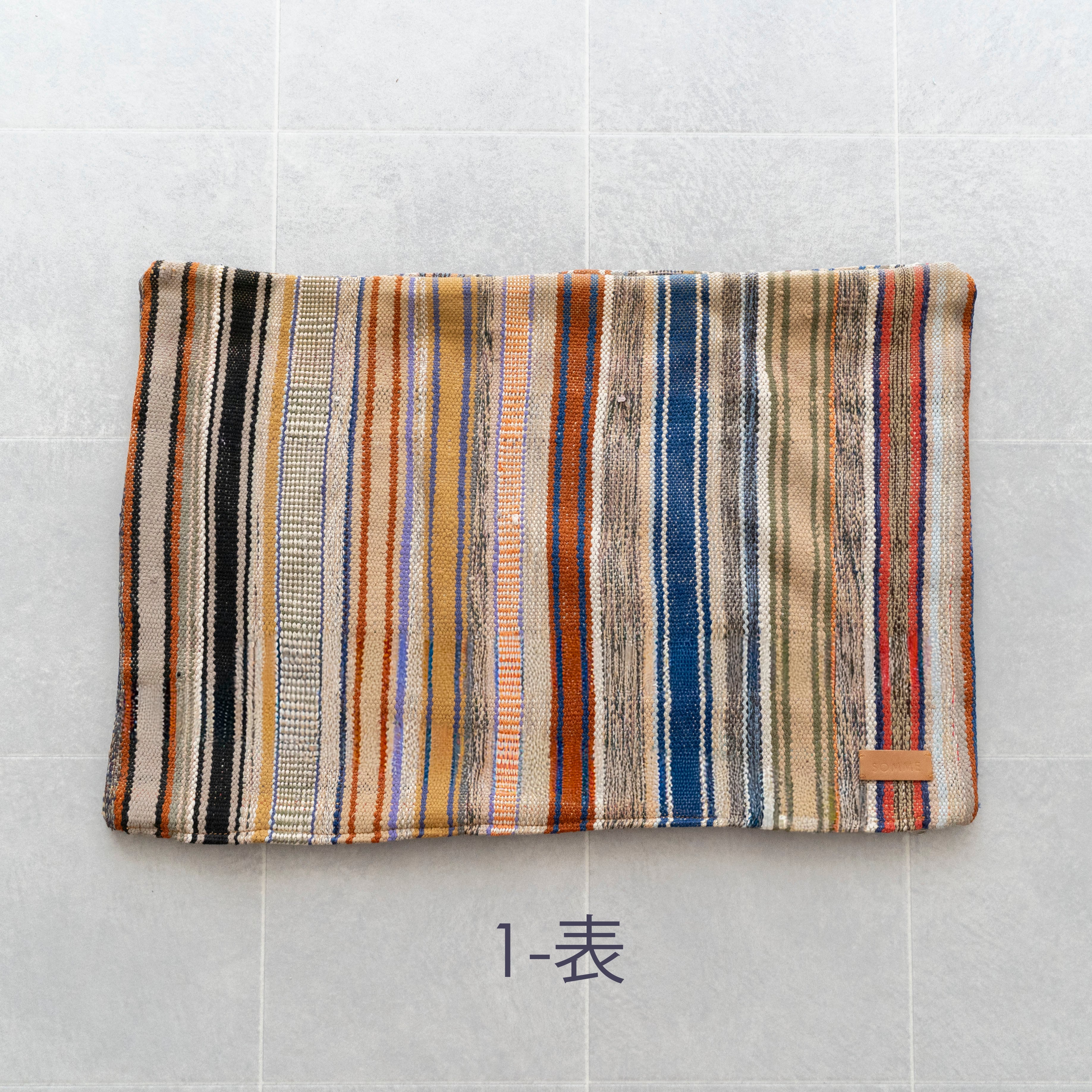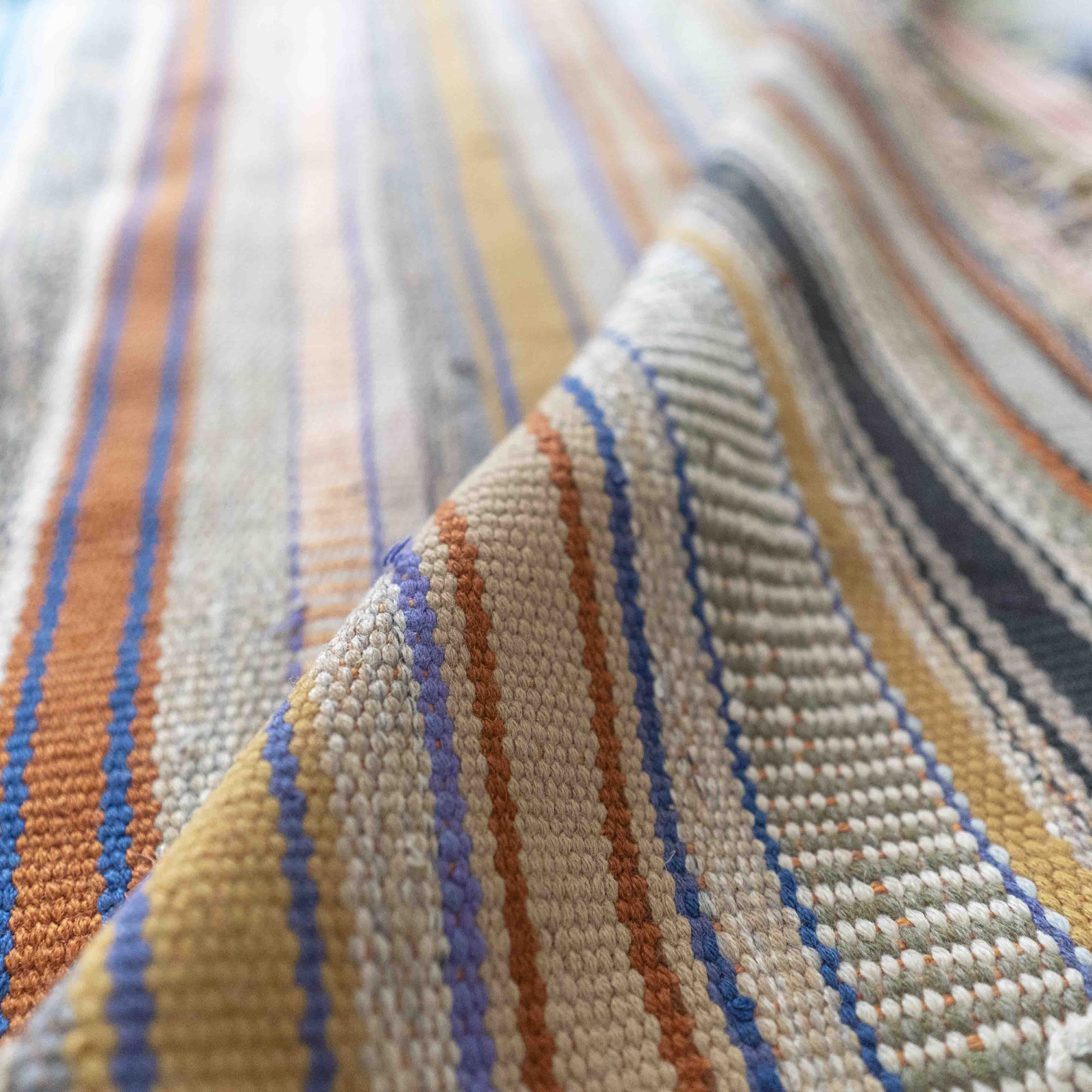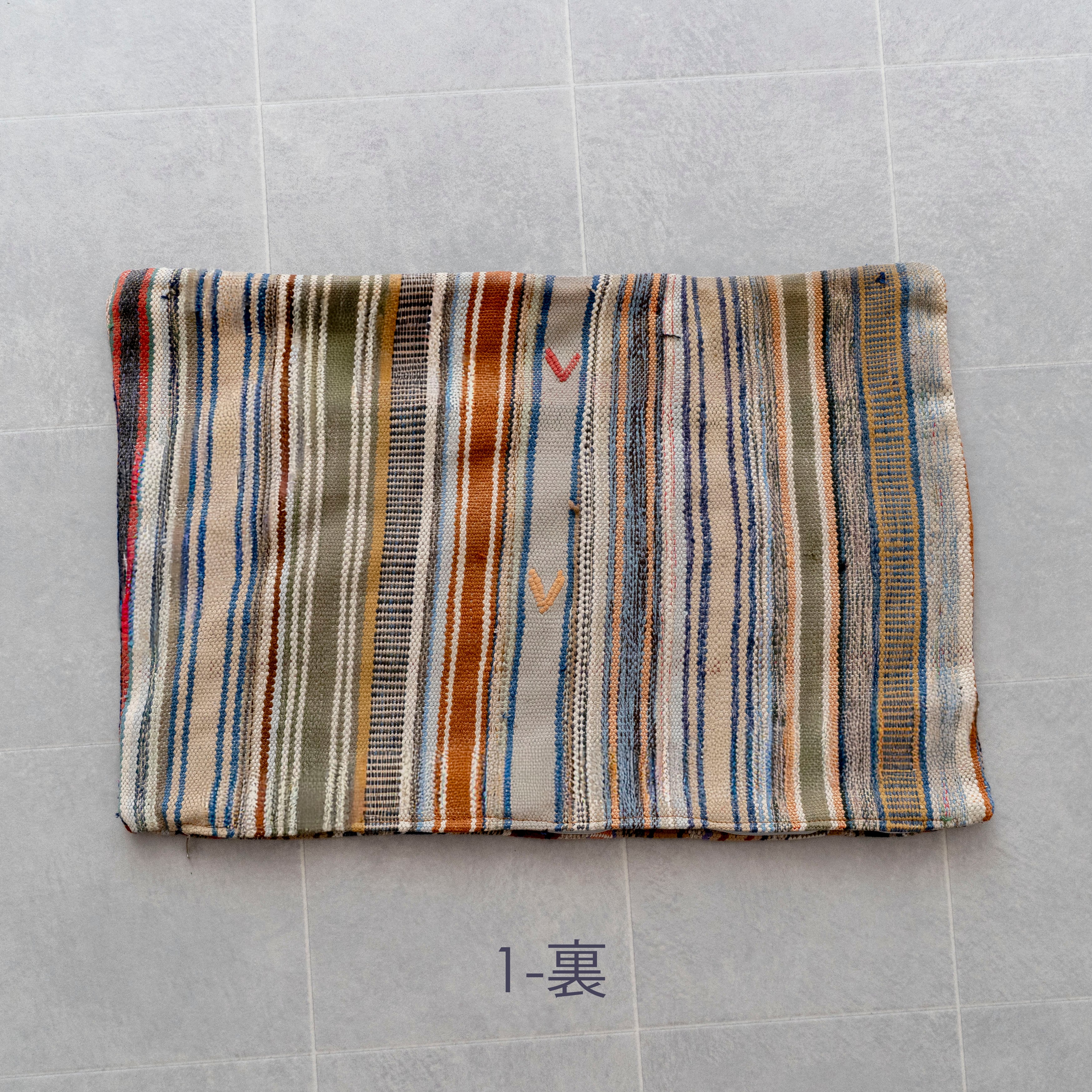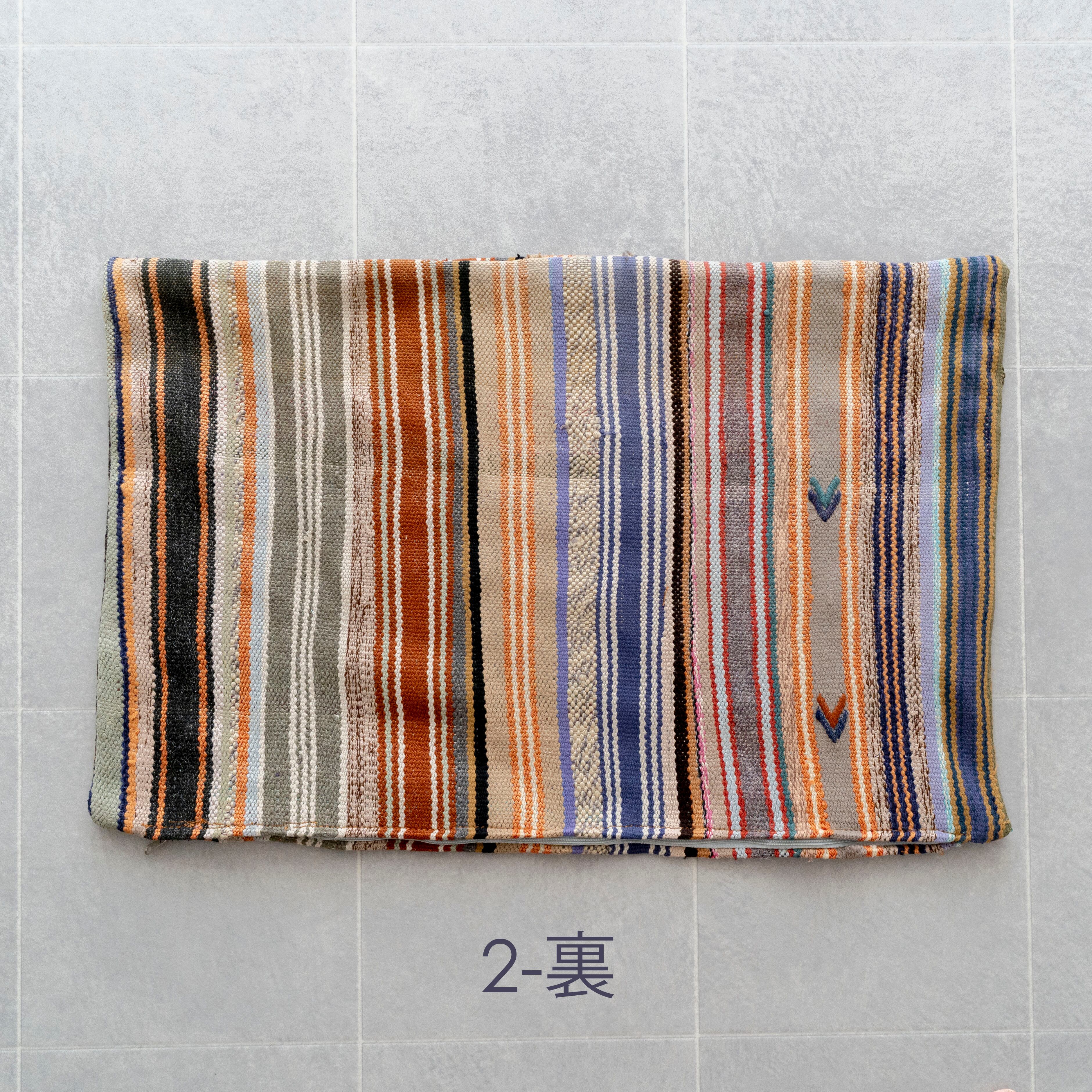 おしゃれなブラウントーンのマルチスカラーが素敵な1枚。多色使いのボーダー柄ですが子供っぽくなく洗練された印象なのもHYKE(ハイク)ならでは。所々に入った刺繍がポイント。ヴィンテージならではの色褪せ感が新品にはない小慣れ感を出してくれます。ヴィンテージ家具などとも好相性。両面で異なる表情が楽しめるダブルフェイス仕様仕上げました。
