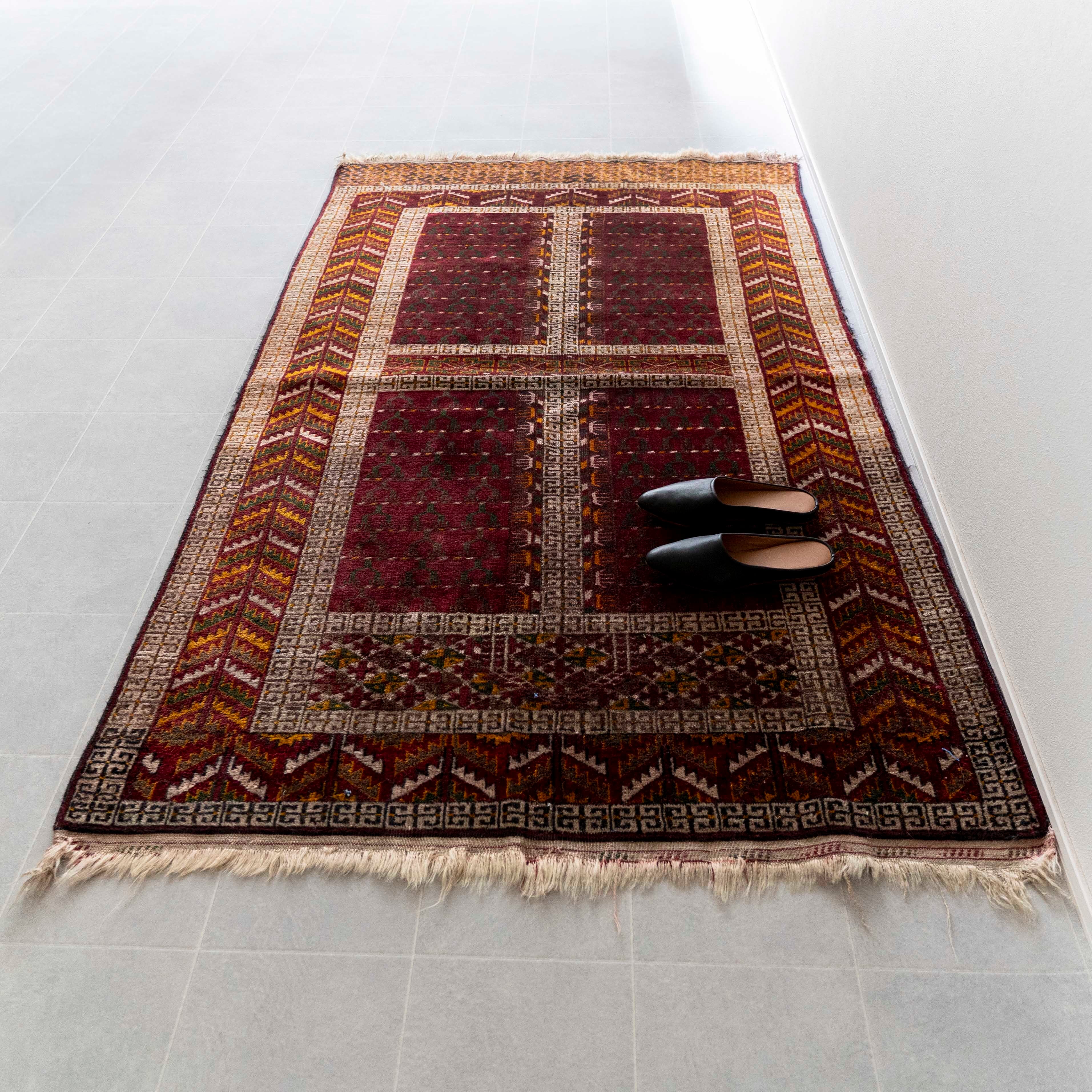 ボルドー色を基調とした美しいヴィンテージのウールラグ。通常よりも番手の細いウール糸を使った繊細な織りから生み出される手仕事は圧巻で出来栄え。経年でウールに艶が出てヴェルベットのような表情を浮かべます。