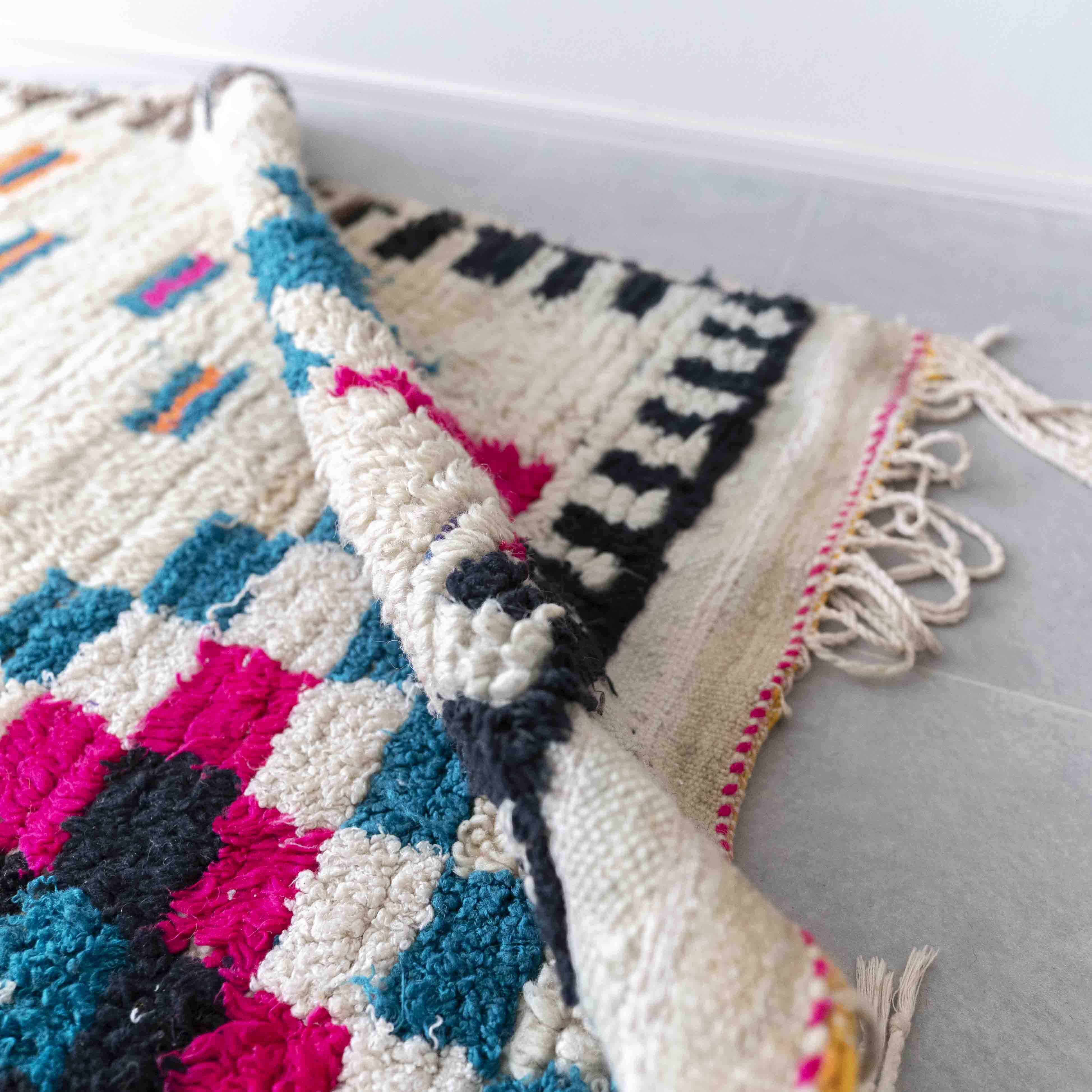 ヴィンテージのブジャド。部分的にボシャルウィットのテクニックを用いた織り柄が取り入れられています。明るいカラーのモチーフに、落ち着いたベージュのベースカラーがお洒落な印象に。ぐるりと四方を囲んだダークブラウンが全体を引き締めています。毛足のあるボシャルウィットの織り柄がアクセントに。絶妙な配色と織り柄が魅力的なラグです。