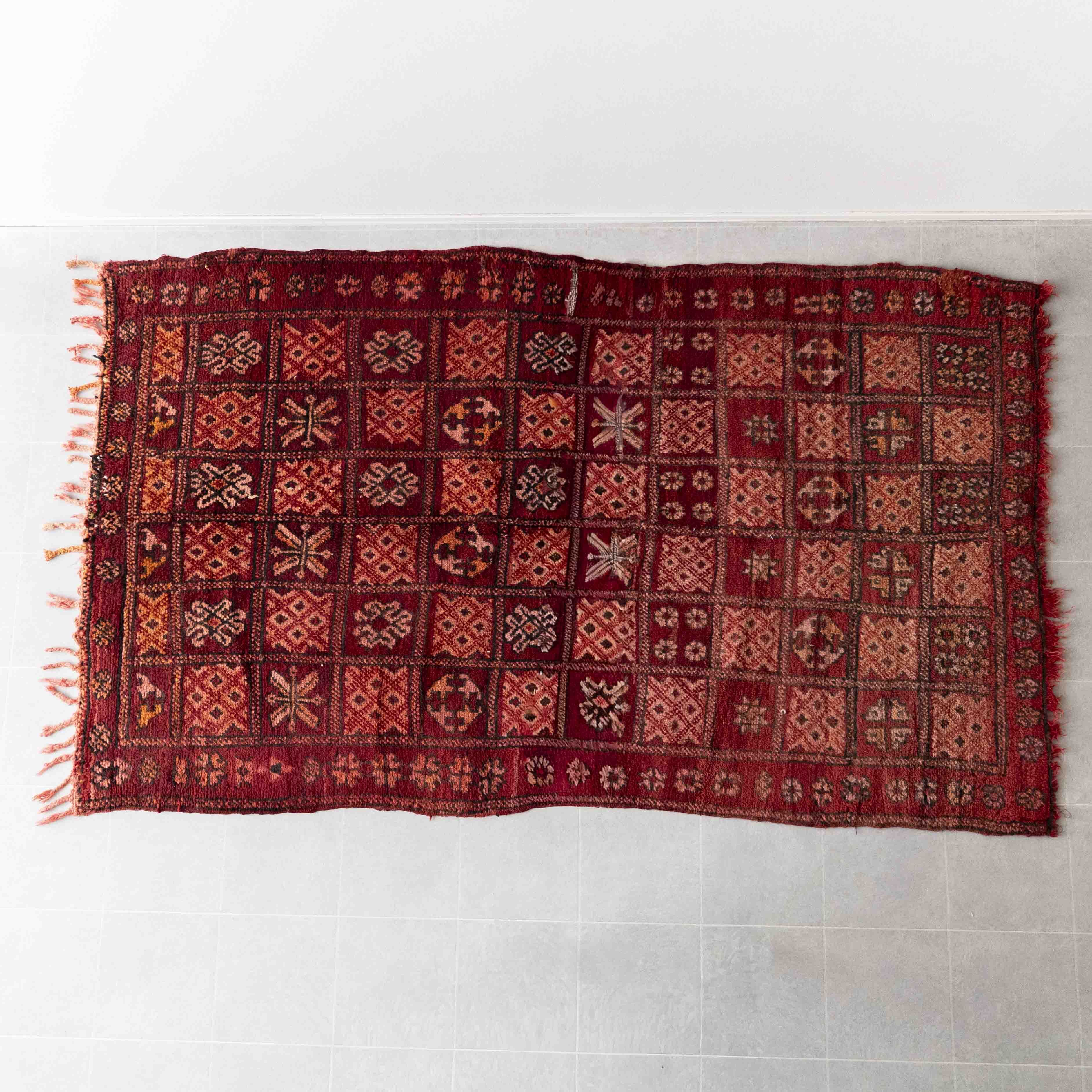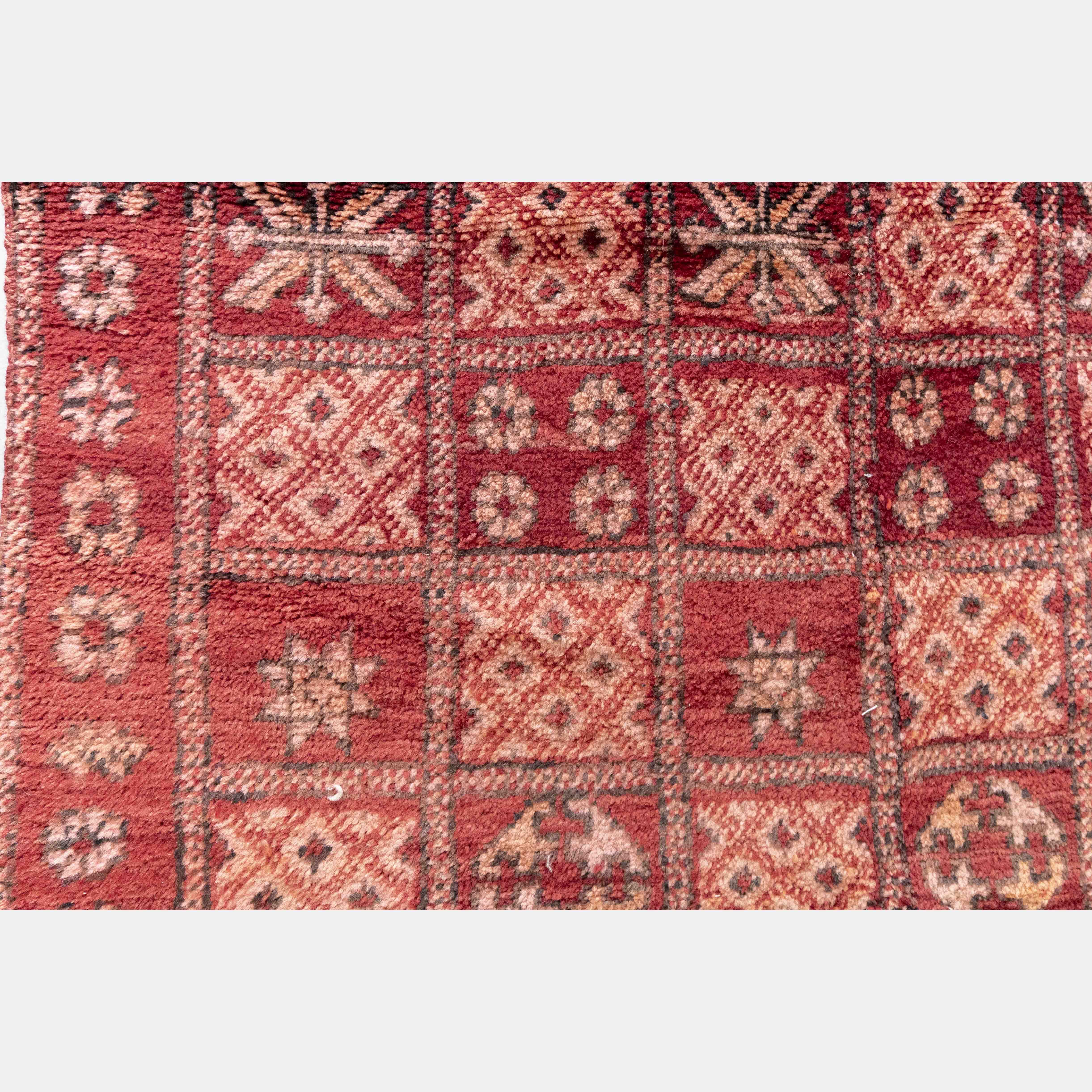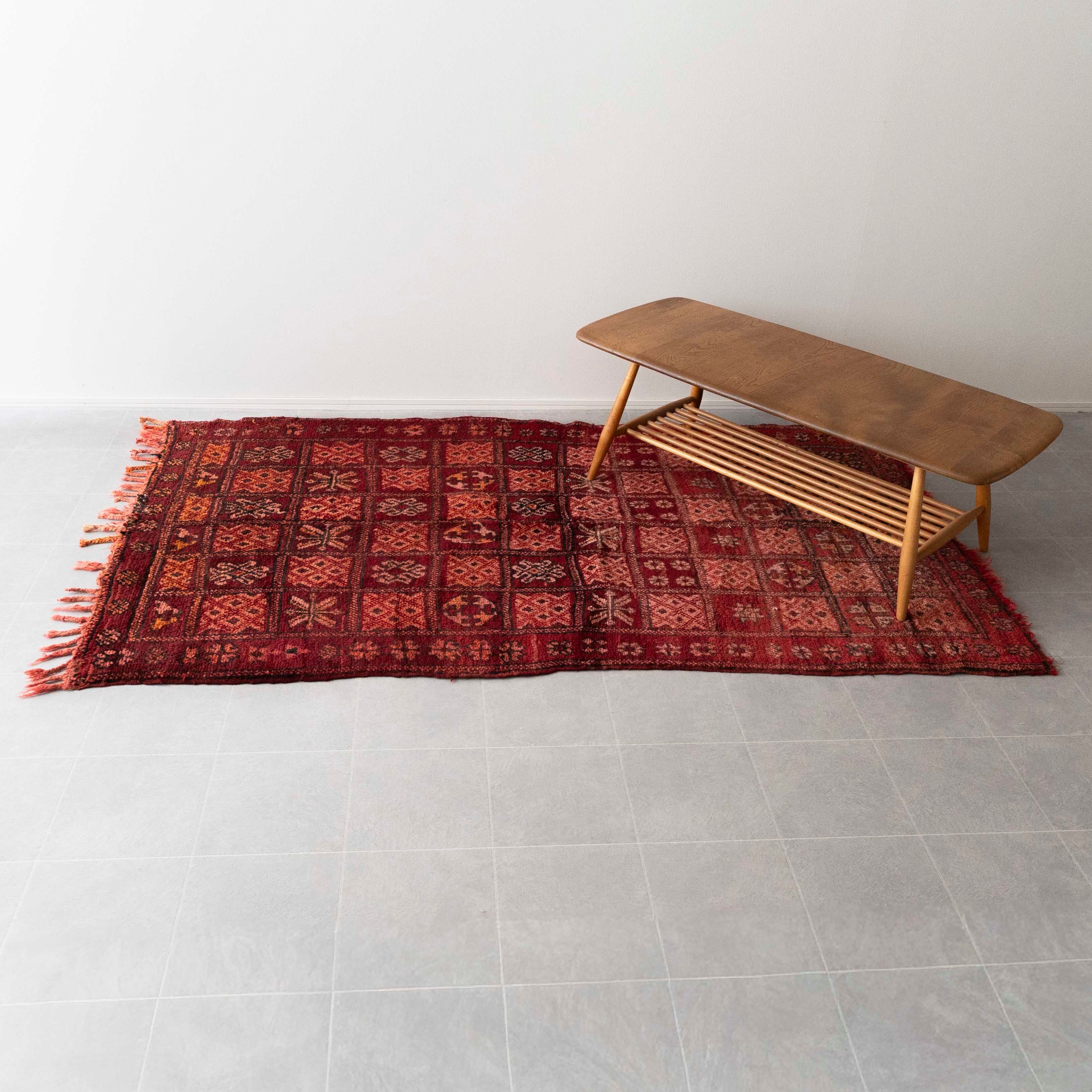 ザムールというマラケシュ近郊の街で織られたヴィンテージラグ。褪色した赤が印象的なラグです。全体に散りばめられた同系色の幾何学模様がモダンな印象に。綿密な織りと織り柄のコントラストが秀逸な1枚です。経年による褪色で全体的に色が馴染んでモダンな印象に。チークやオークなどのヴィンテージ家具と好相性のカラーと雰囲気です。
