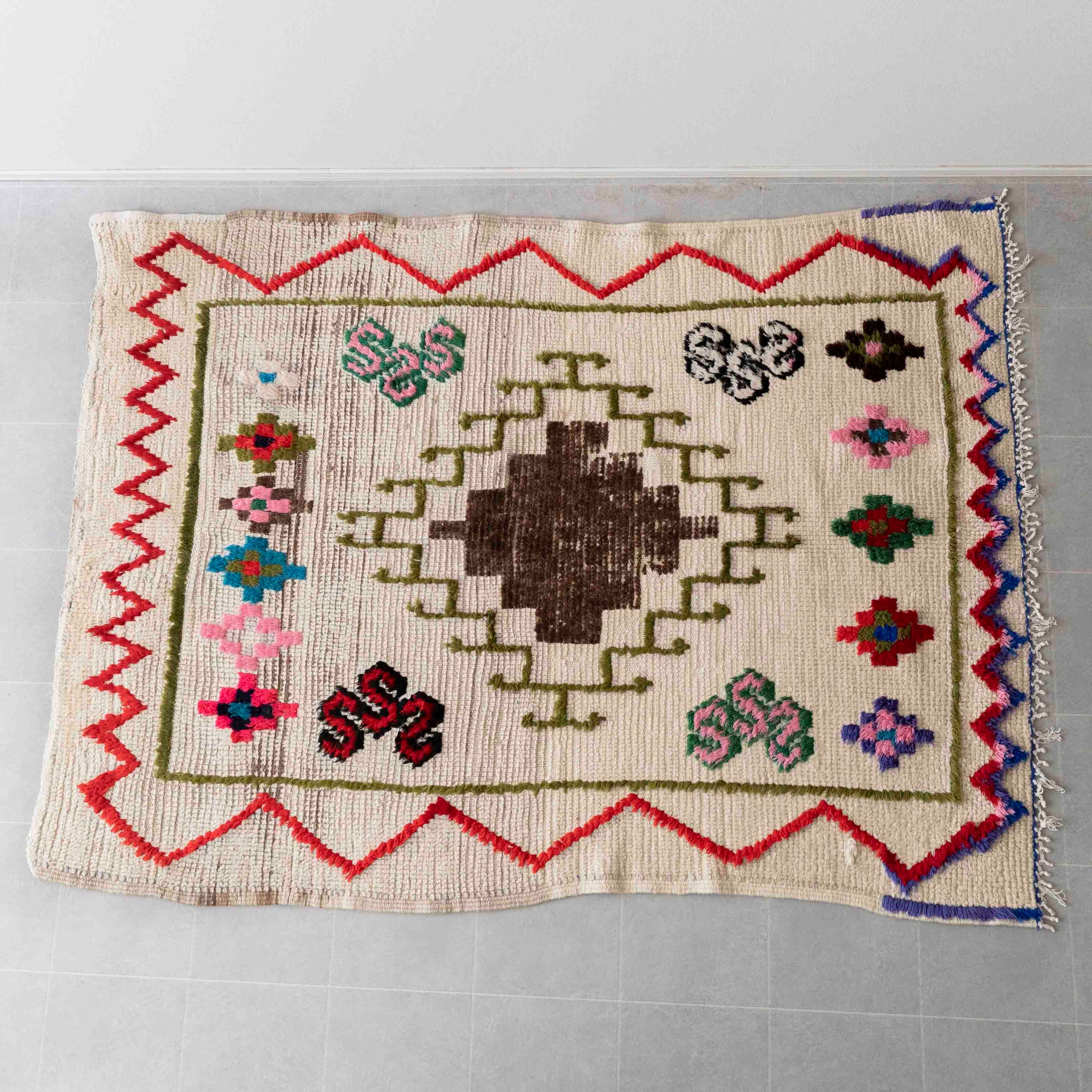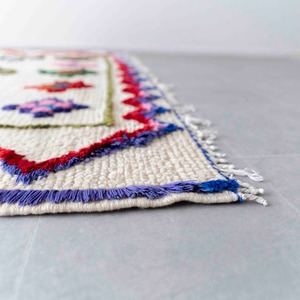 ヴィンテージのブジャドのあまり市場に出て来ない貴重なラグです。ベージュの落ち着いたトーンにモチーフが散りばめられたアート作品のような1枚。よく見ると複数の色の糸を使用してあり絶妙な色味を表現。経年によって色あせてモダンな印象に。細やかで繊細な手仕事の魅力がたっぷり詰まったアイテム。ウールですがコットン糸も使用されているため重すぎず季節問わずお使いいただけます。
