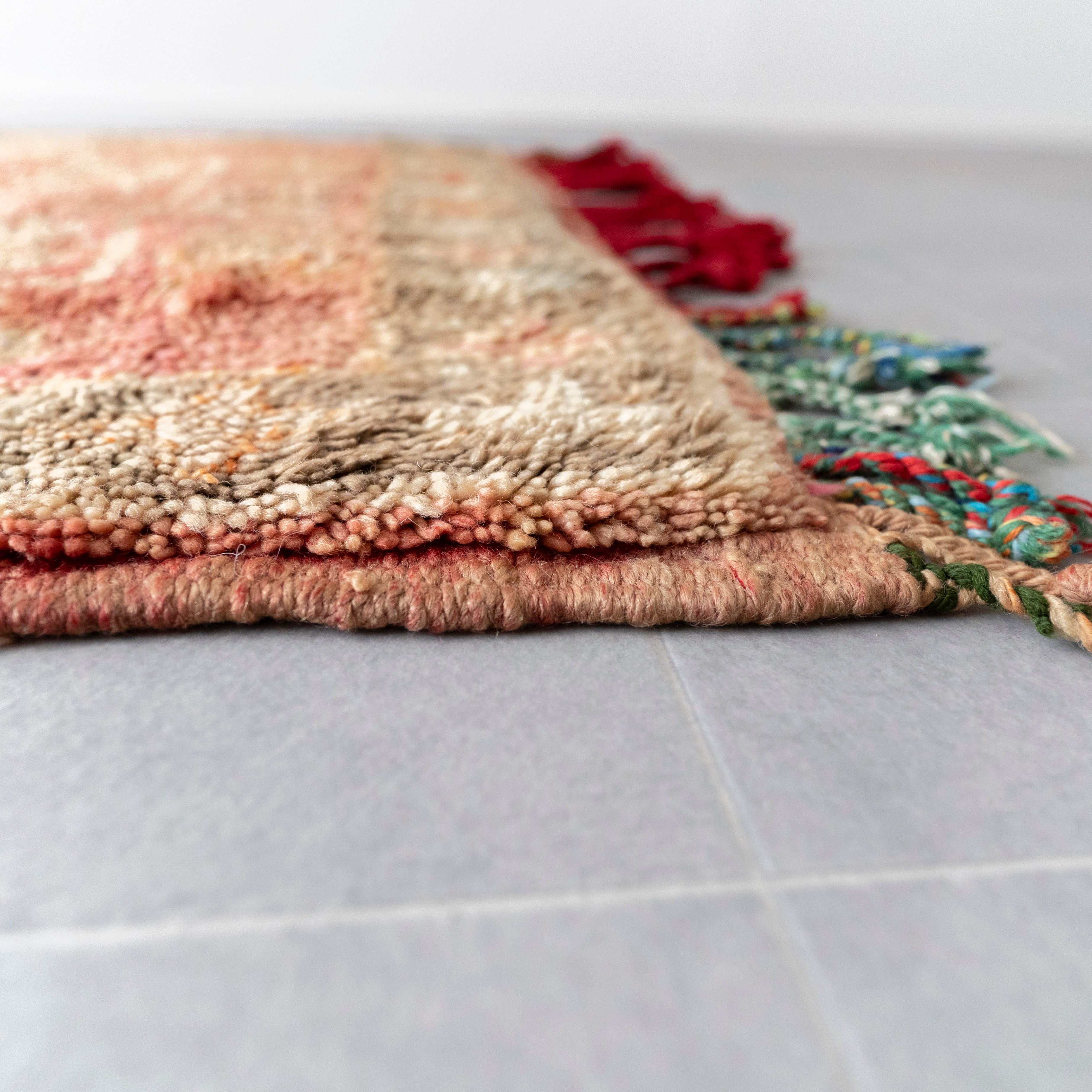 褪せた朱赤が素敵なヴィンテージのブジャド。水彩画のような退色したボディにサイドのグリーンとレッドのフリンジによるアクセントが絶妙です。まるでアート作品のようなモダンな1枚。主張しすぎずインテリアにスッと馴染むのも魅力です。