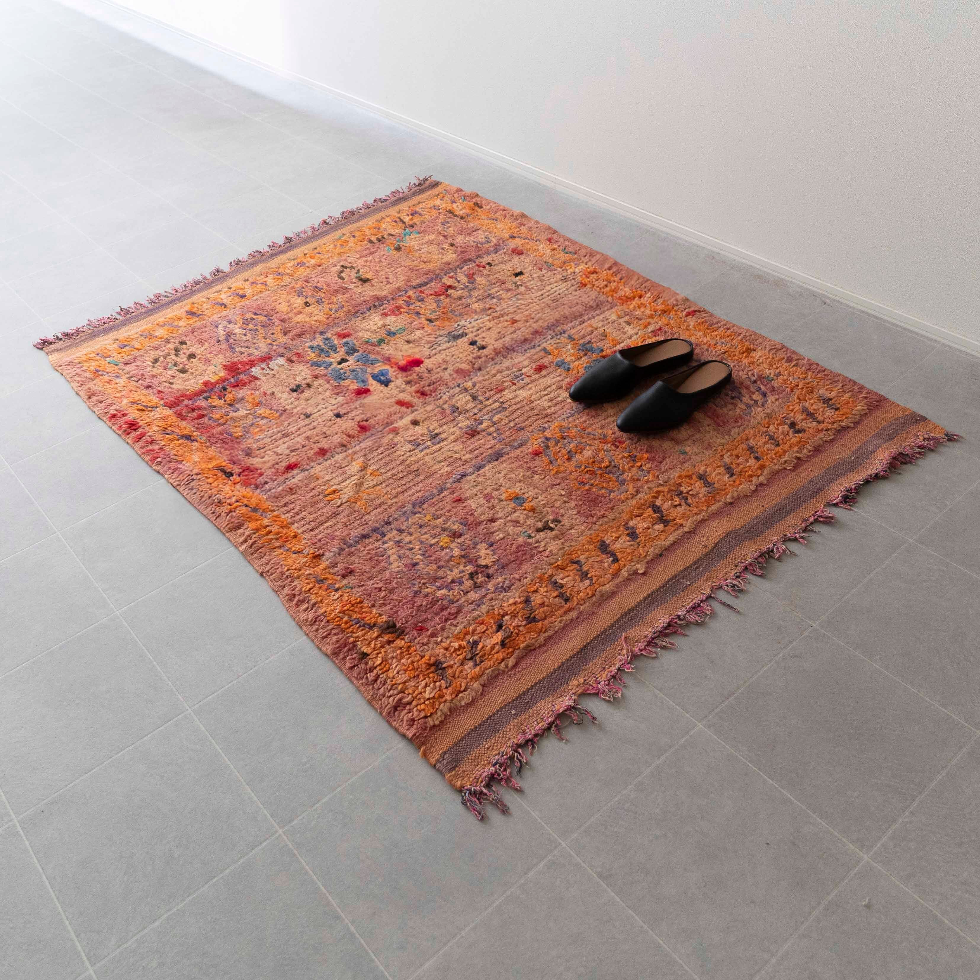 ブジャドの織りにサイドにキリムの織りを混ぜたヴィンテージラグです。褪色したベージュピンクに全体に散りばめられた同系色の模様がモダンな印象に。程よいアクセントになりつつも経年による色褪せで全体に馴染んで主張は抑え目。チークやオークなどのヴィンテージ家具と好相性のカラーと雰囲気です。