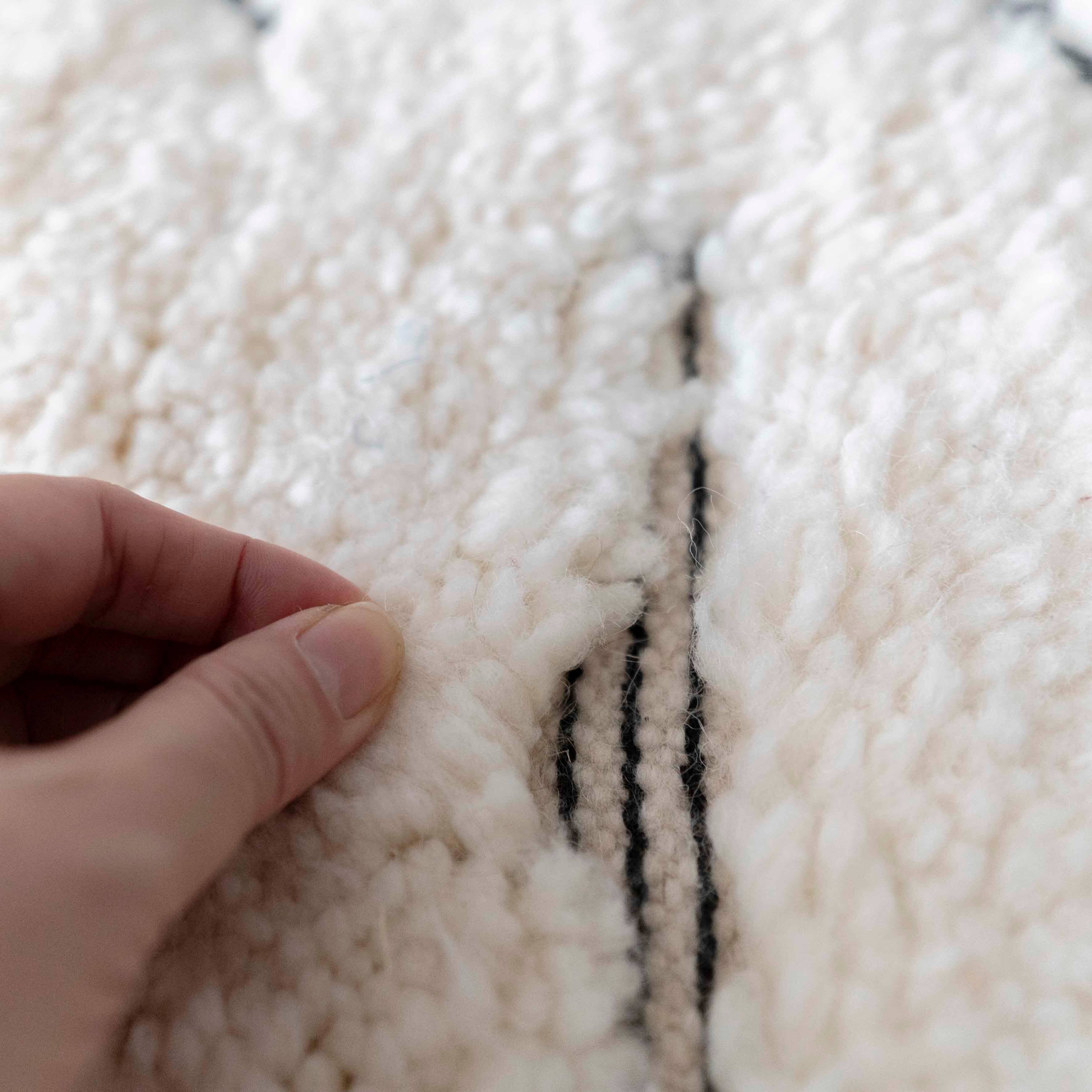 アートのような透かし柄。ベースにブラック×ホワイトのストライプ柄を忍ばせて。ホワイトの柄の切れ目からチラリとのぞくモダンなデザインのラグです。やや白寄りのオフホワイト。柔らかかな手触りが魅力です。