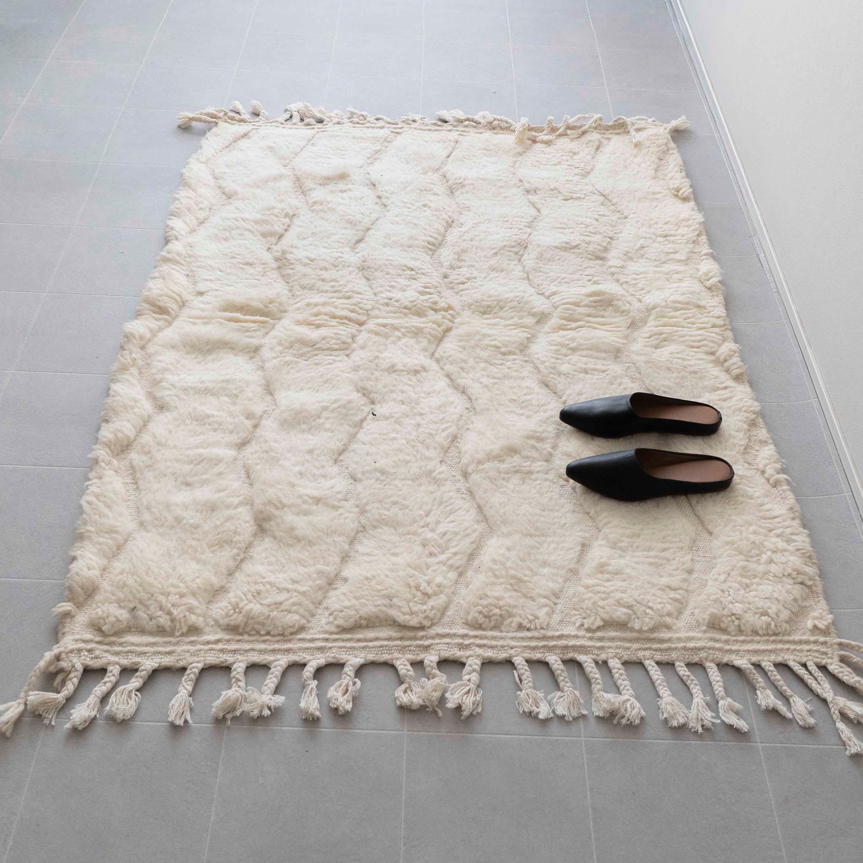 中アトラス北東部にある、ベニワレンという村で織られるラグです。染めなどを一切行わず、ウール本来のベージュやブラウンを生かしたナチュラルな色使いと、ふかふかとリッチな毛足の長さが特徴。モダンで魅力的なラグです。1960年代〜1970年代にかけて作られたものが多く、歴史のあるものについては、今では状態の良いものは希少となってしまいました。新しく作られているものには、美しい色に染めたスタイルも見られます。