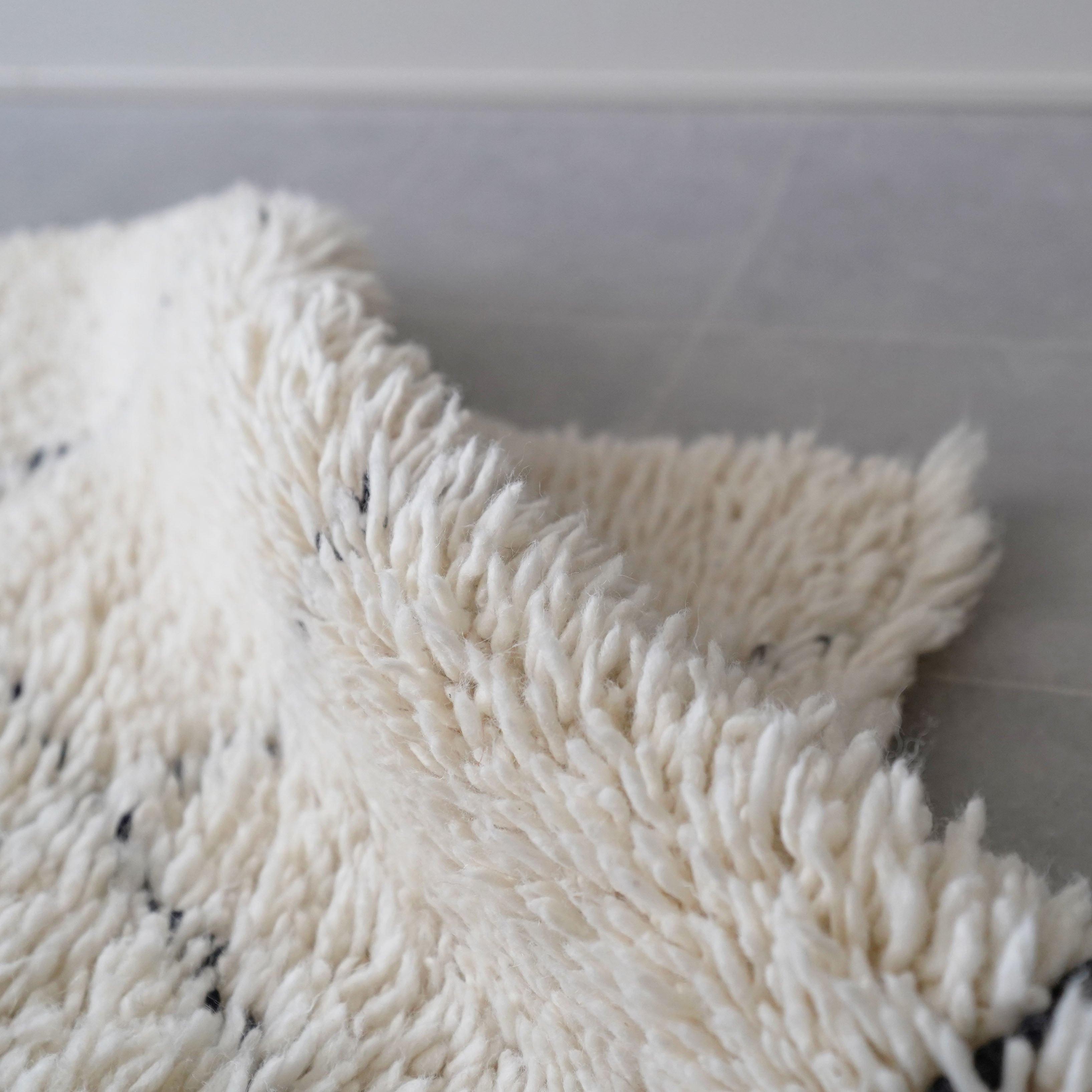 中アトラス北東部にある、ベニワレンという村で織られるラグです。染めなどを一切行わず、ウール本来のベージュやブラウンを生かしたナチュラルな色使いと、ふかふかとリッチな毛足の長さが特徴。モダンで魅力的なラグです。1960年代〜1970年代にかけて作られたものが多く、歴史のあるものについては、今では状態の良いものは希少となってしまいました。新しく作られているものには、美しい色に染めたスタイルも見られます。