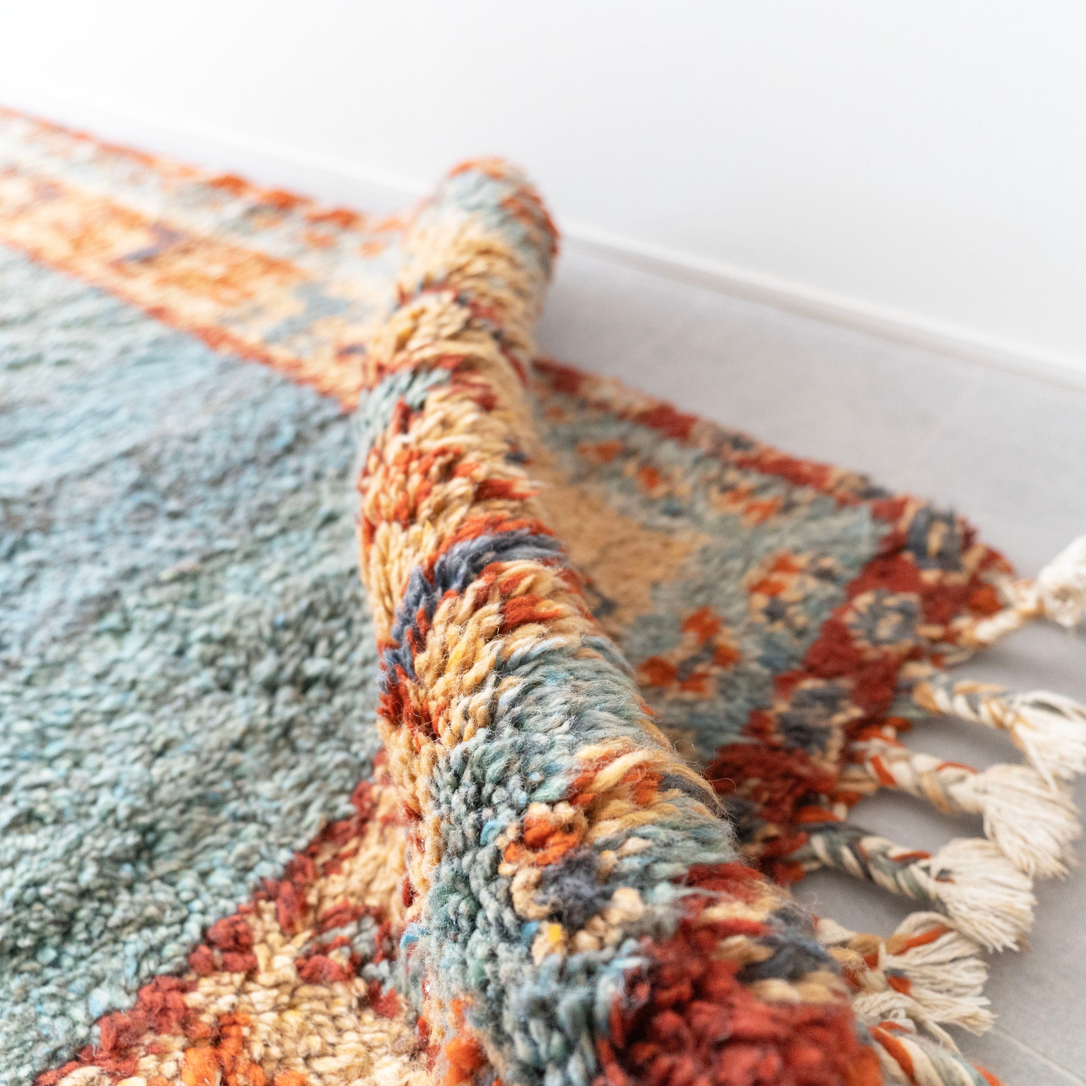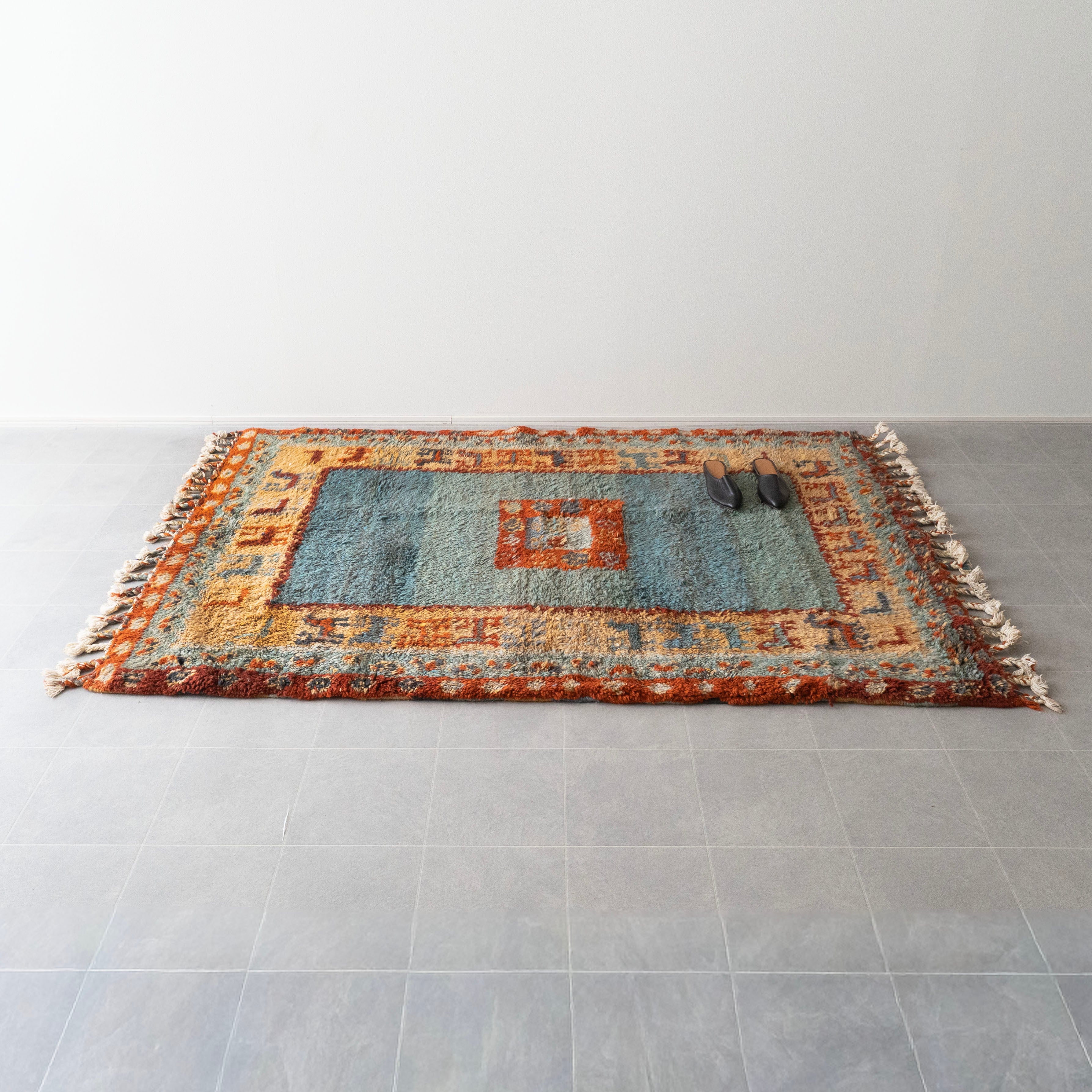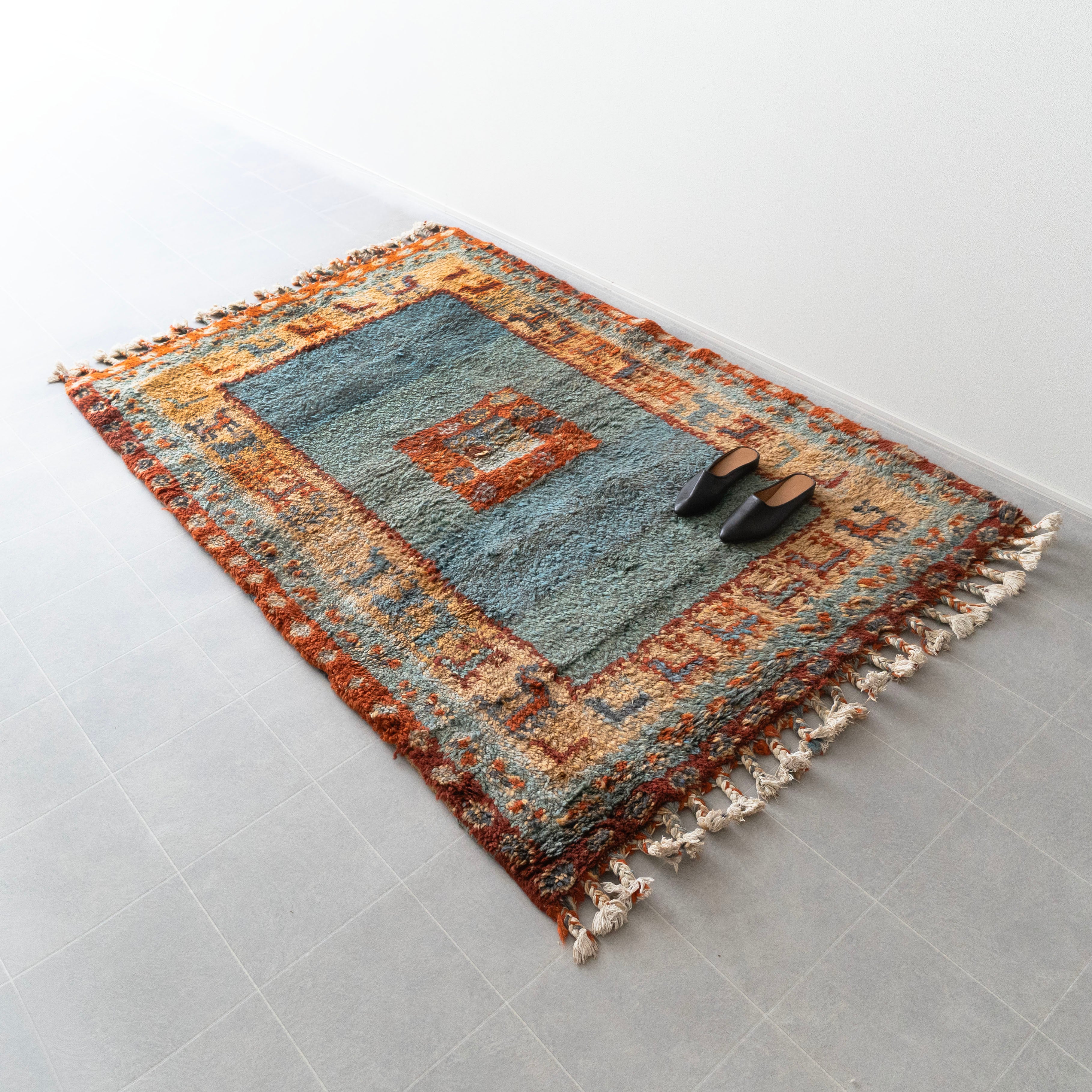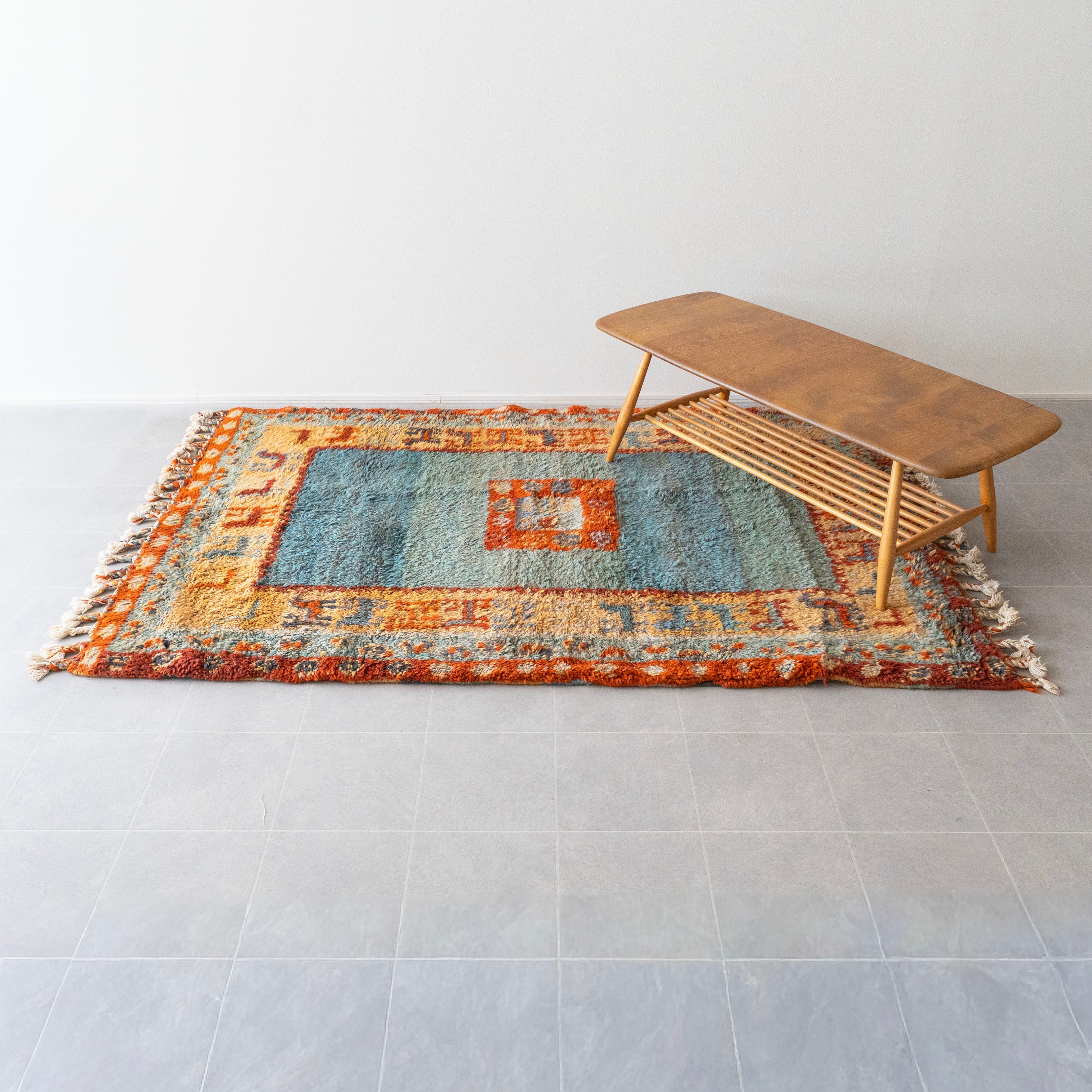 目の詰まったウールのボディにみっちりとした毛足が気持ち良い踏み心地。デットストックで保管状態がかなりよく、ヴィンテージに抵抗がある方にもおすすめ。リビングのメインラグにおすすめです。同じ時期に織られた玄関サイズもございます。サイズ違いでリビング、玄関と敷いていただいても素敵です。
