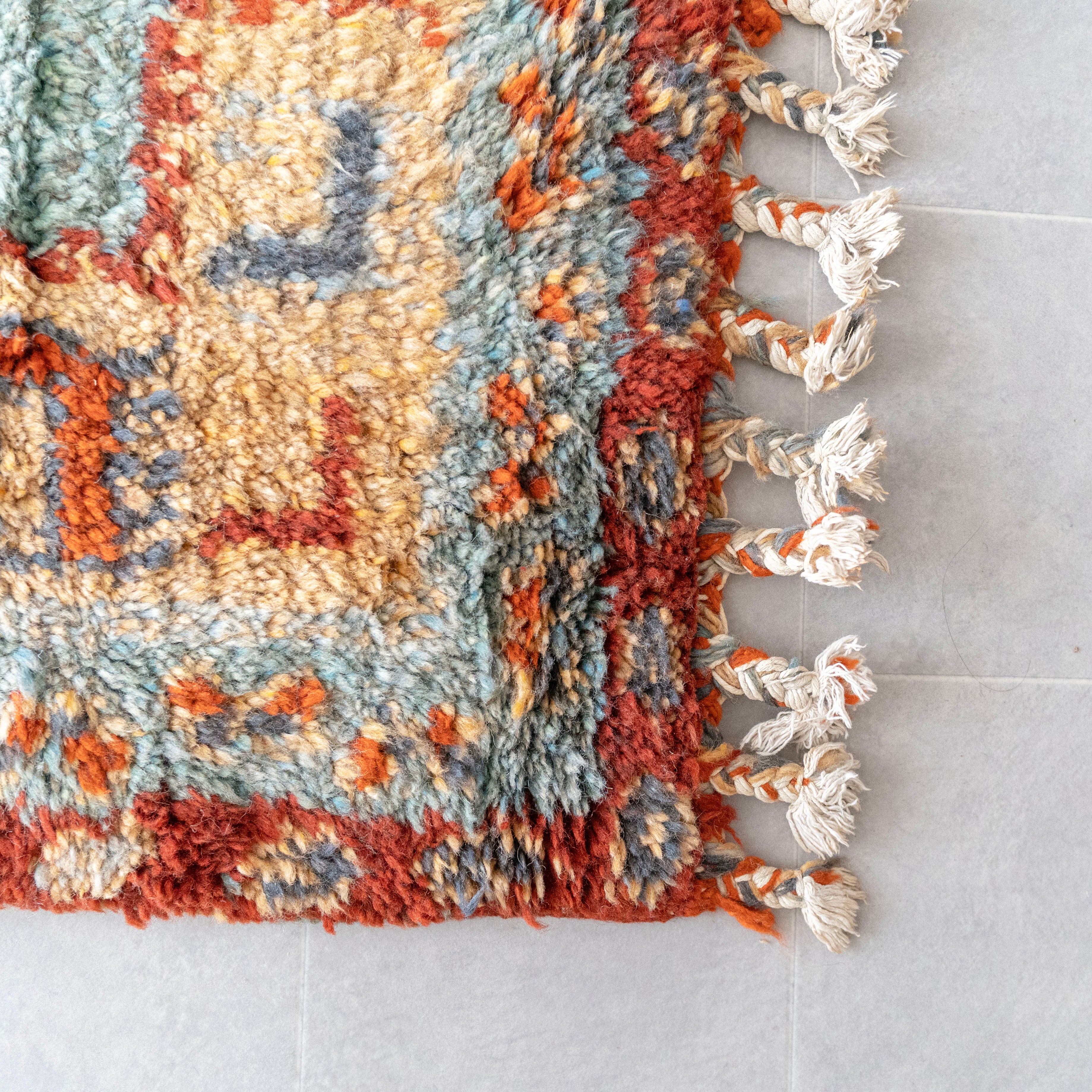 モロッコの首都ラバト近郊の村で織られたウールラグのヴィンテージ。全体に施されたモチーフデザインと落ち着いたトーンの配色が絶妙です。