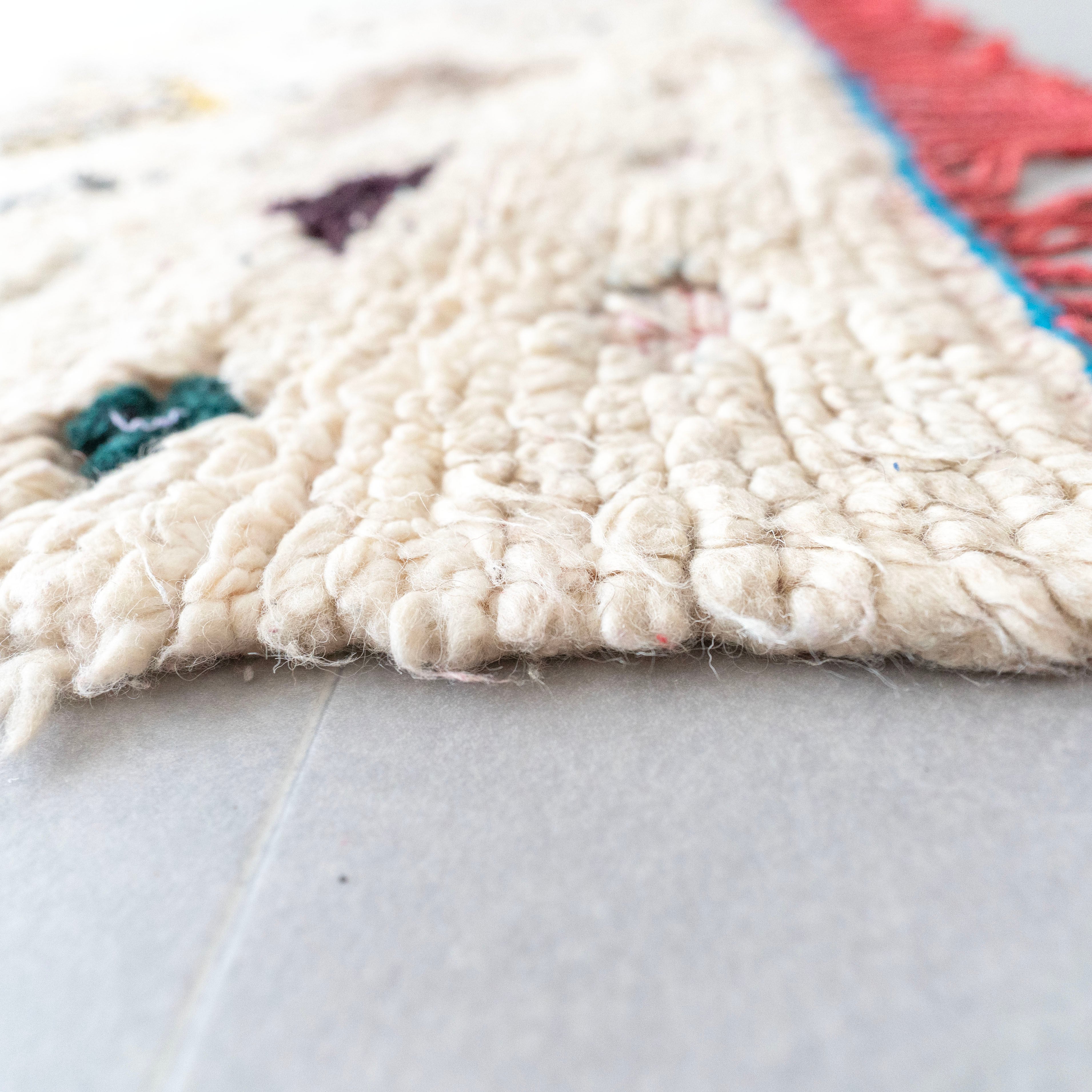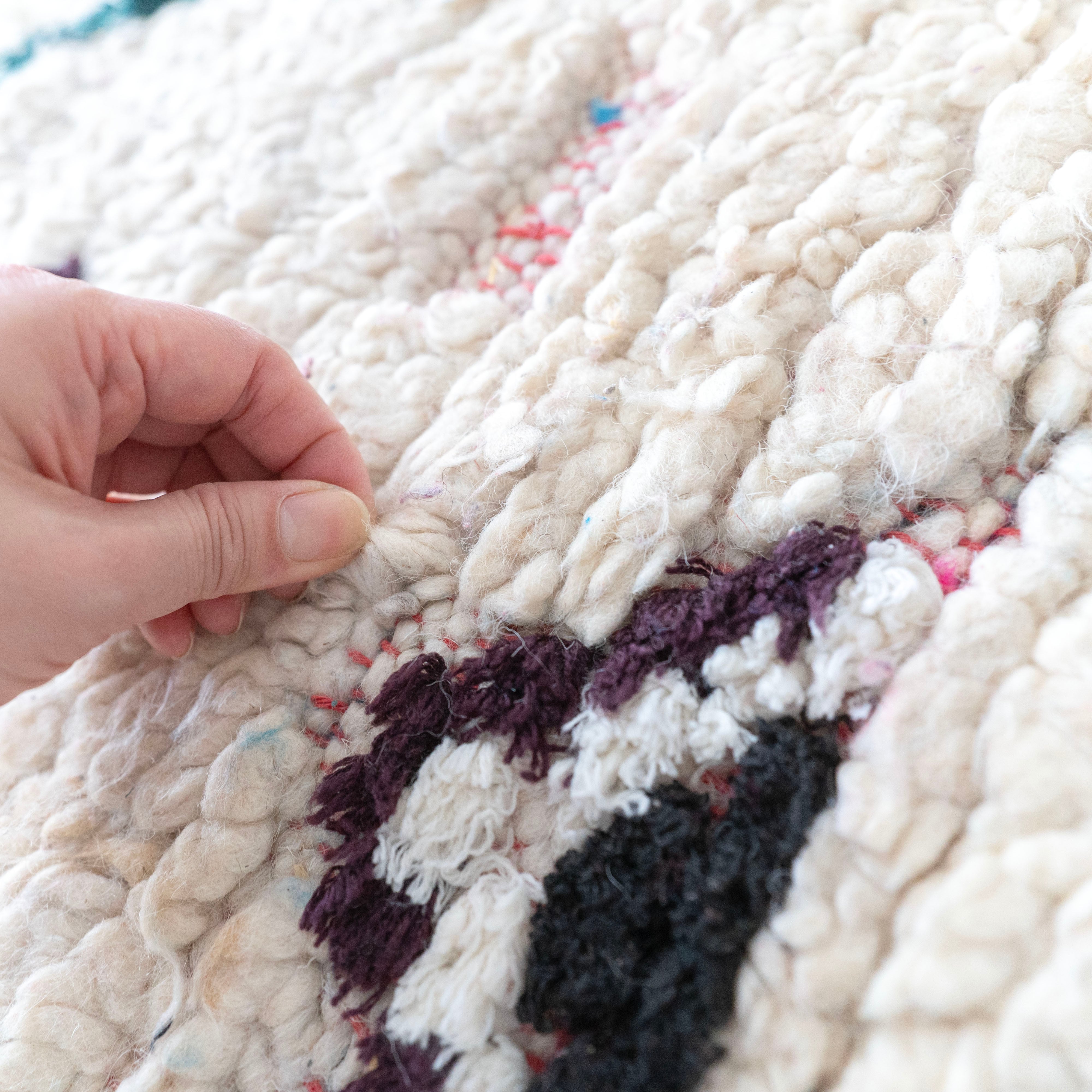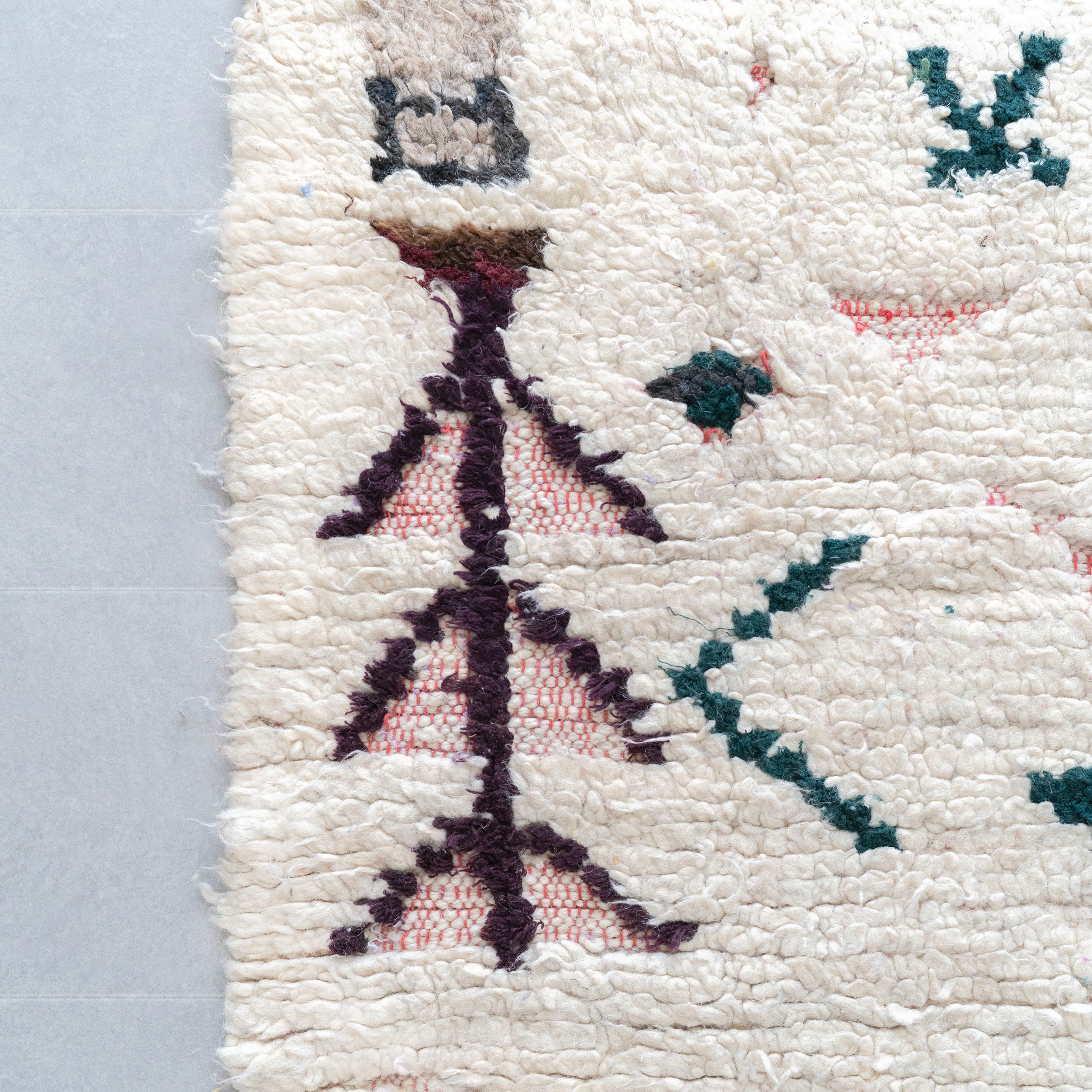 ブジャドの織りに部分的にボシャルウィットを混ぜたヴィンテージラグ。モダンな表情のある毛足が素敵なラグです。色柄を織り交ぜたモチーフが印象的な1枚。縦糸のレッドのコットン糸がお洒落なアクセントに。絶妙なバランスの配色をベースのオフホワイトが上品にまとめ上げています。程よく色褪せていることで色が強く主張しすぎず、木製ヴィンテージ家具とも馴染みの良いラグです。