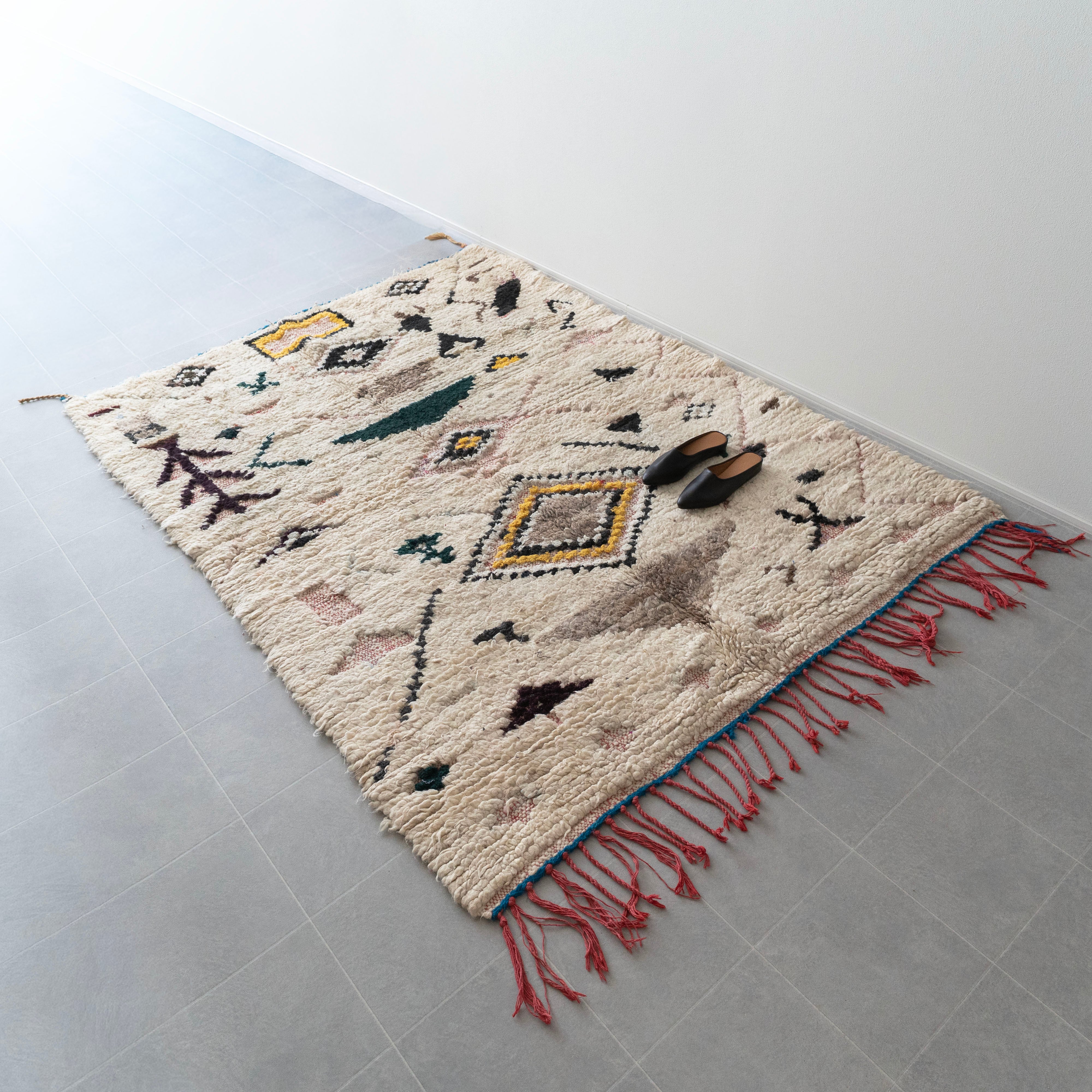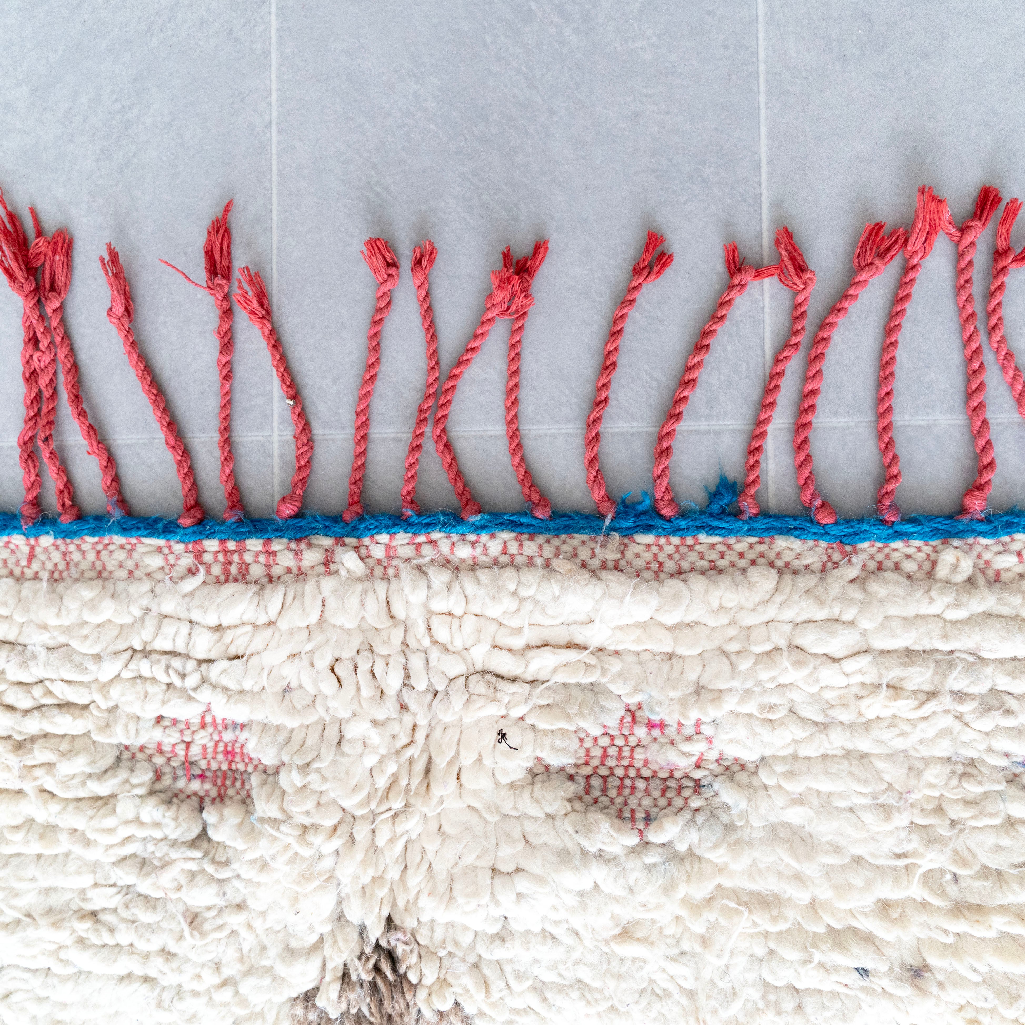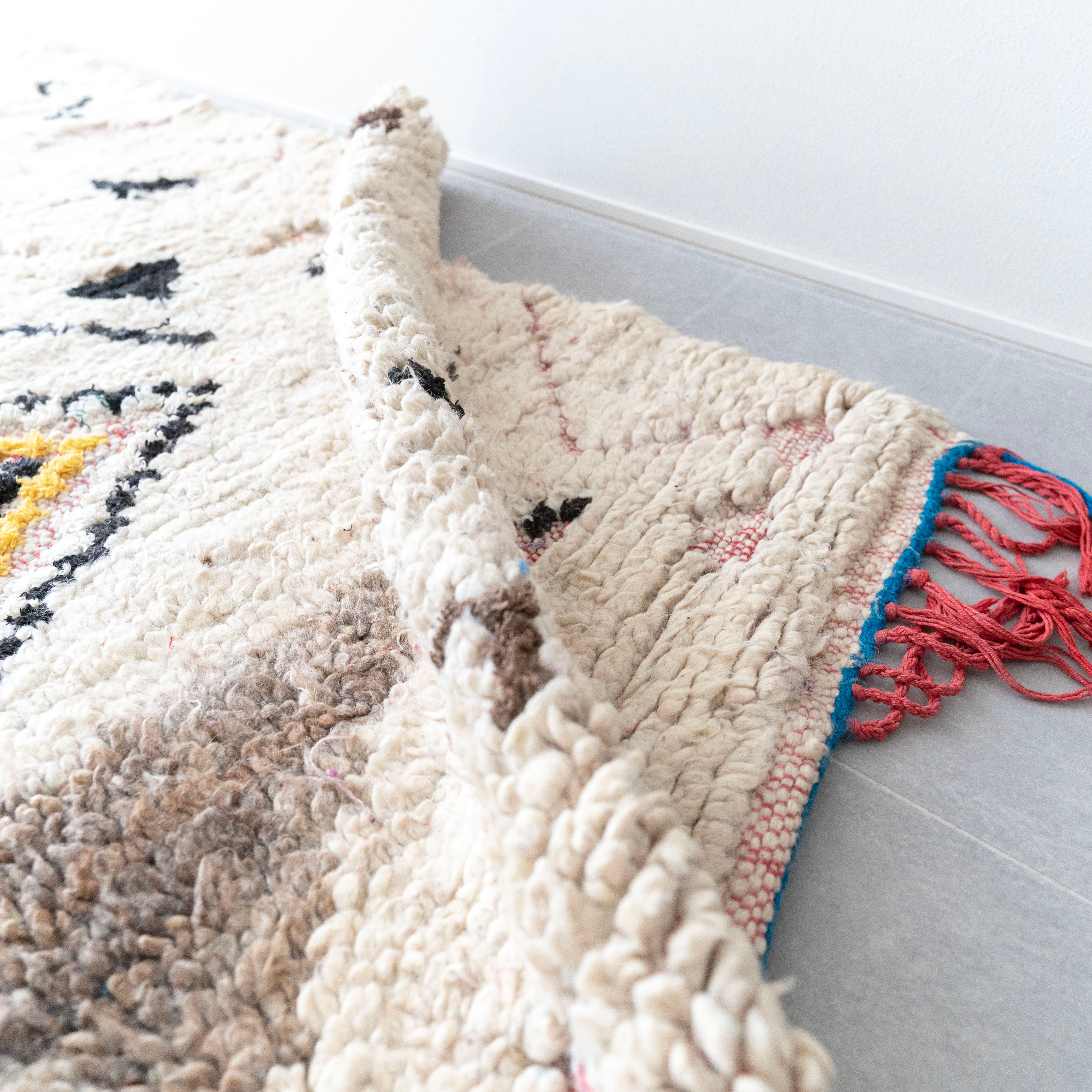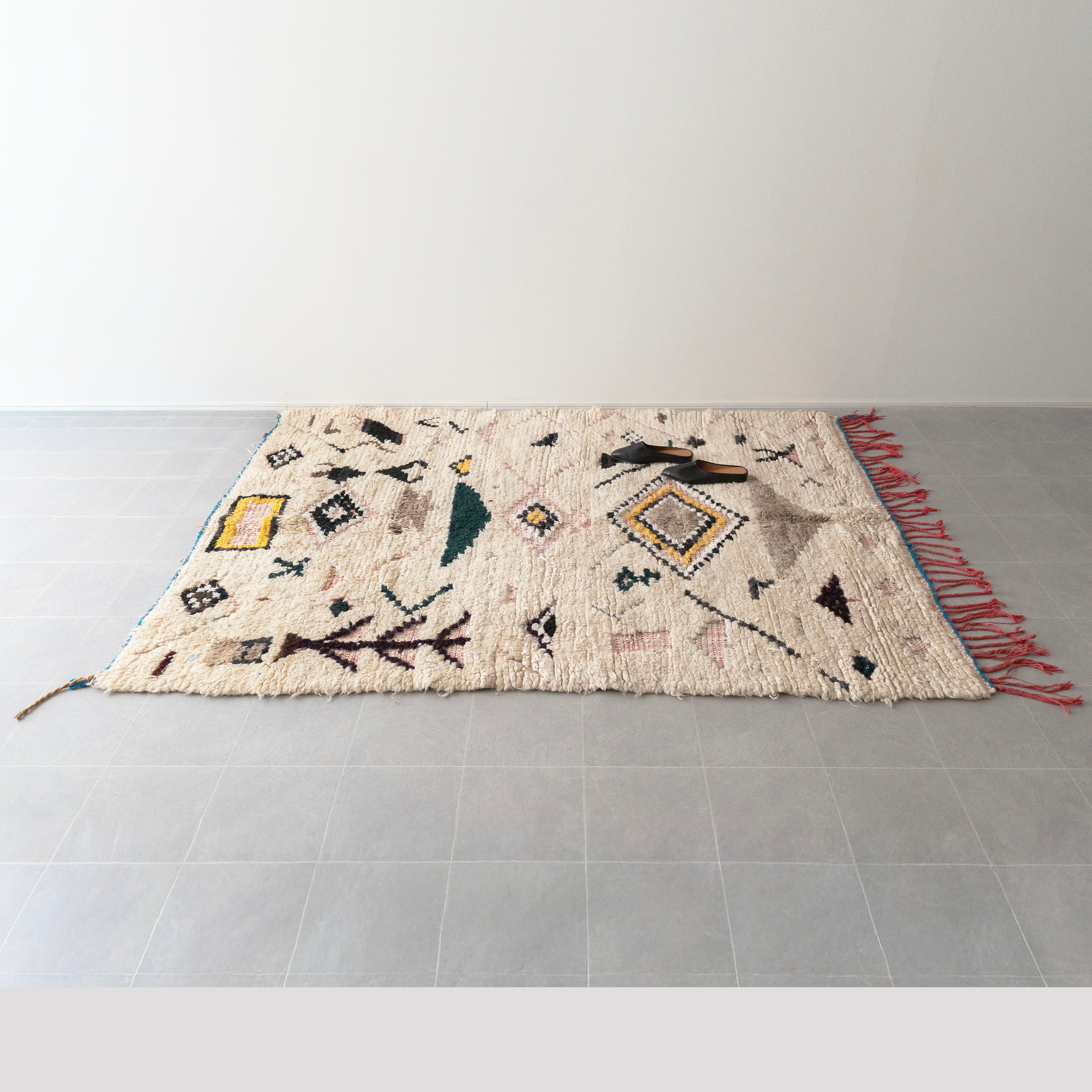 ブジャドの織りに部分的にボシャルウィットを混ぜたヴィンテージラグ。モダンな表情のある毛足が素敵なラグです。色柄を織り交ぜたモチーフが印象的な1枚。縦糸のレッドのコットン糸がお洒落なアクセントに。絶妙なバランスの配色をベースのオフホワイトが上品にまとめ上げています。程よく色褪せていることで色が強く主張しすぎず、木製ヴィンテージ家具とも馴染みの良いラグです。