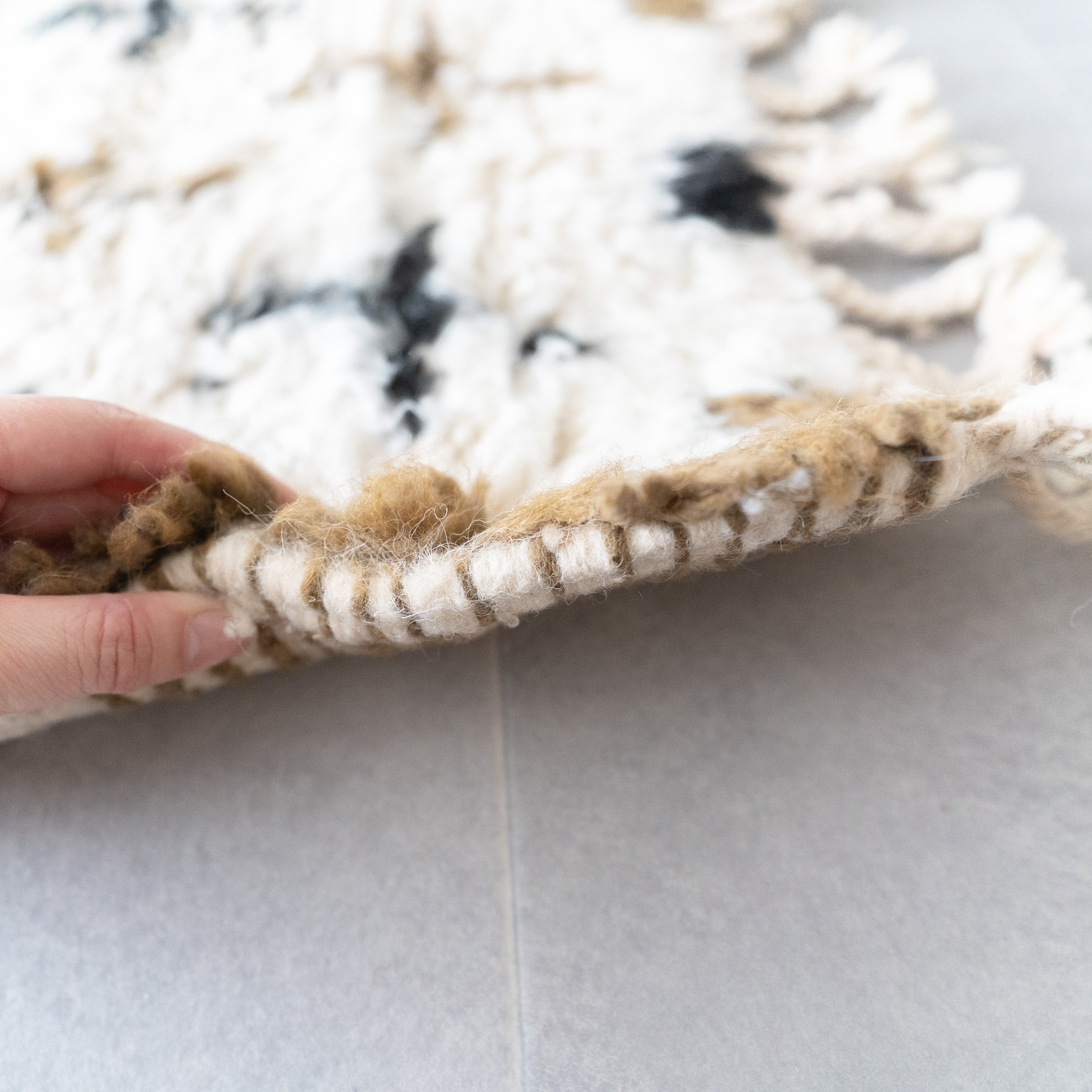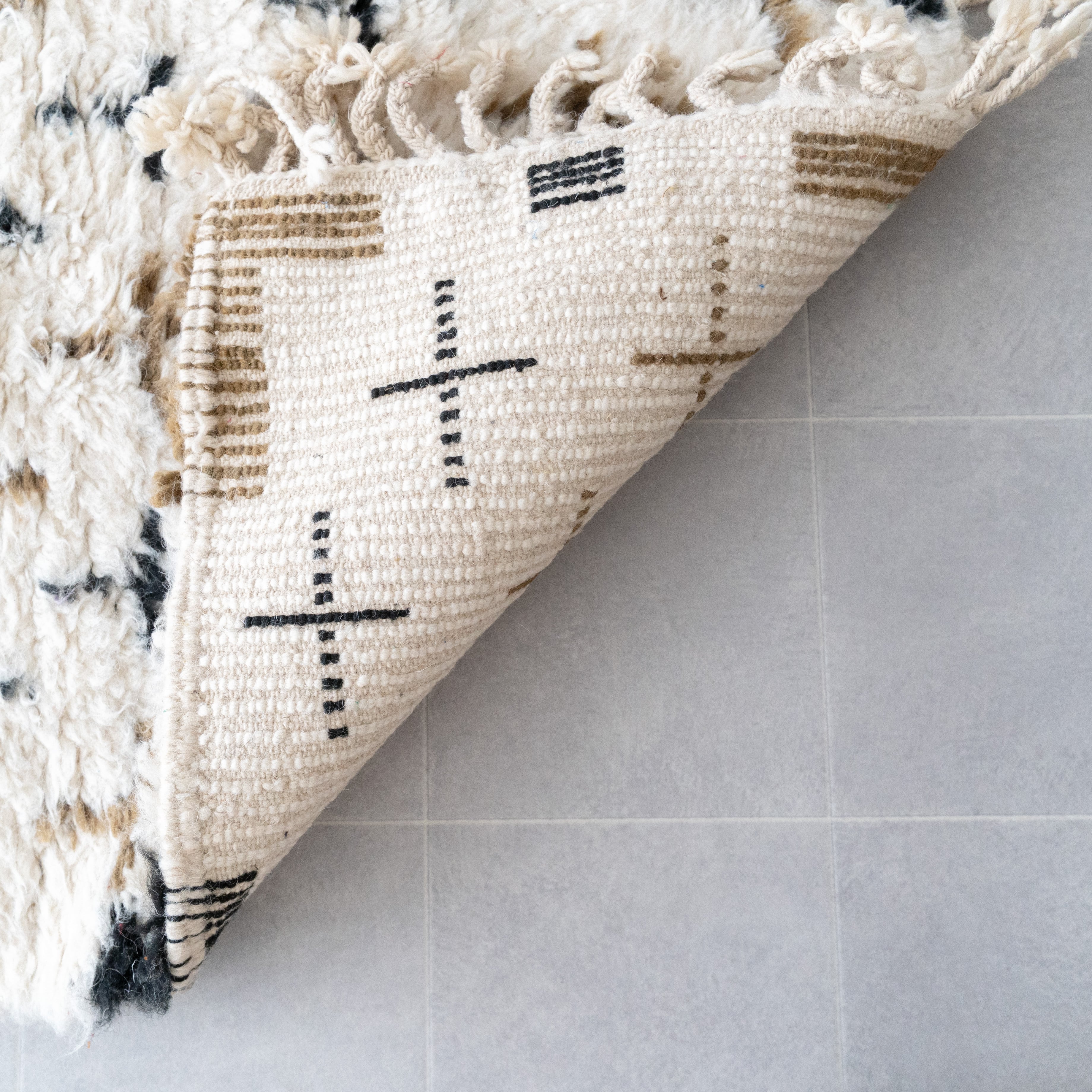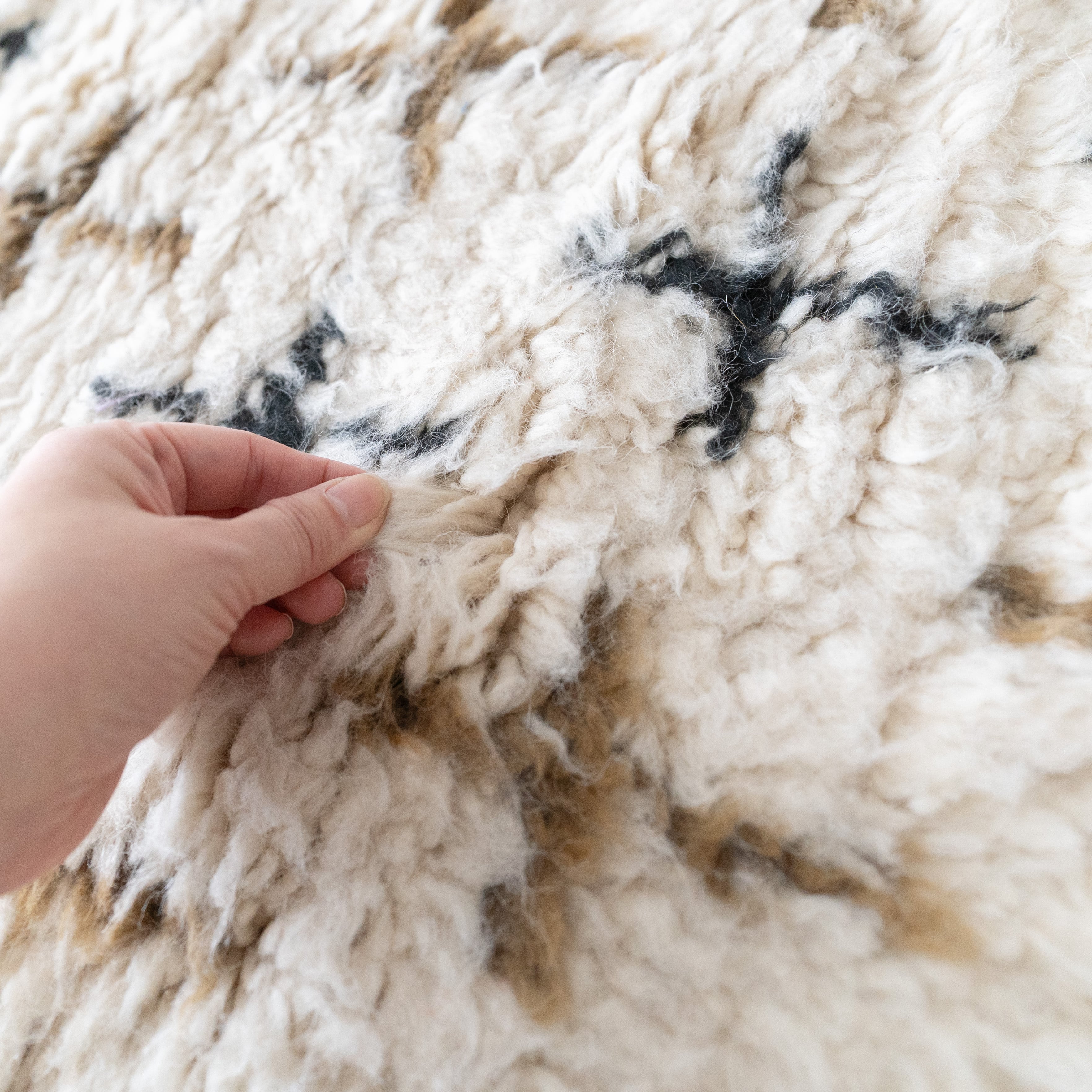 中アトラス北東部にある、ベニワレンという村で織られるラグです。染めなどを一切行わず、ウール本来のベージュやブラウンを生かしたナチュラルな色使いと、ふかふかとリッチな毛足の長さが特徴。モダンで魅力的なラグです。1960年代〜1970年代にかけて作られたものが多く、歴史のあるものについては、今では状態の良いものは希少となってしまいました。新しく作られているものには、美しい色に染めたスタイルも見られます。