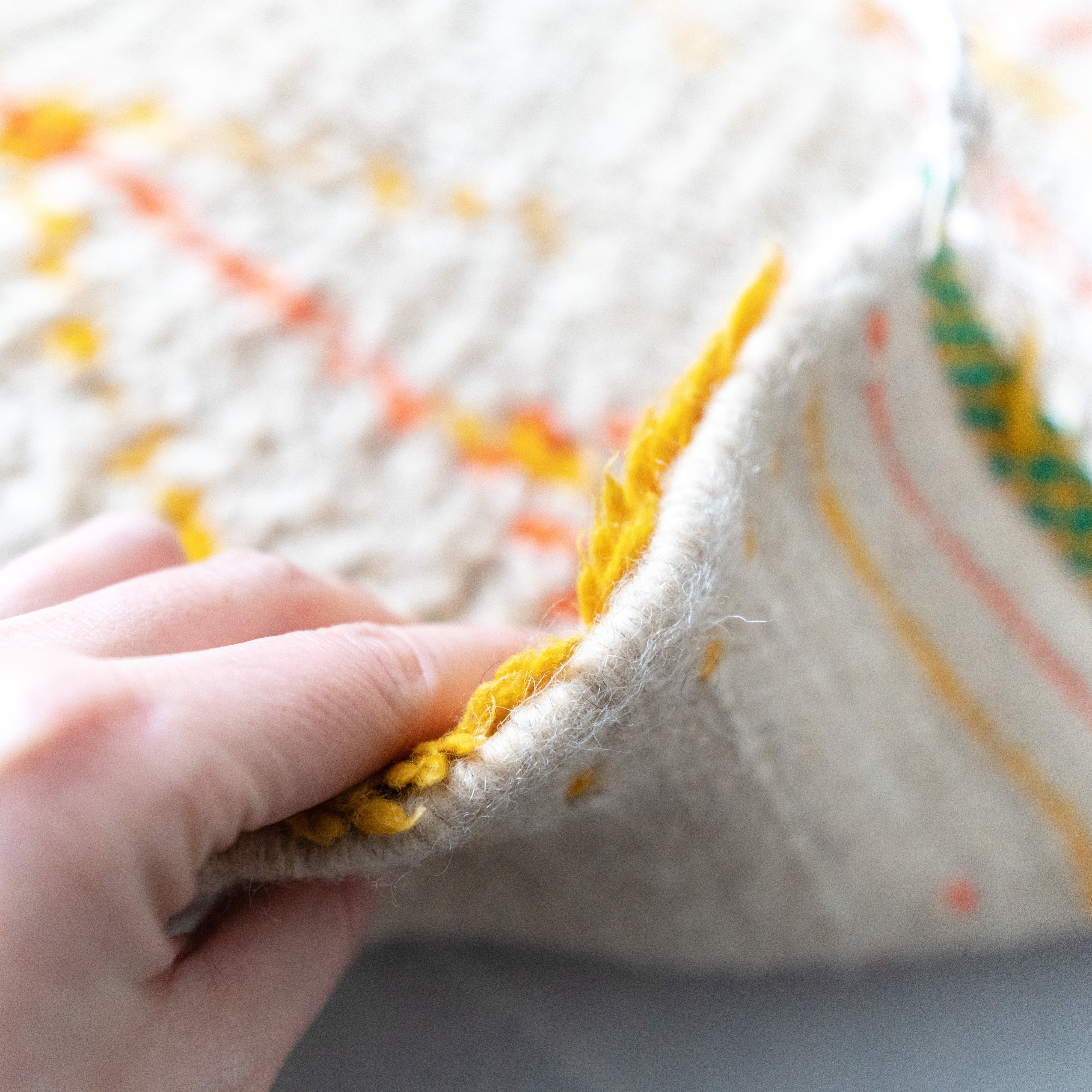 柔らかな手触りで扱いやすい厚みのラグ。ウールですがコットンが縦糸に用いられているので重くならず通年でお楽しみいただけます。