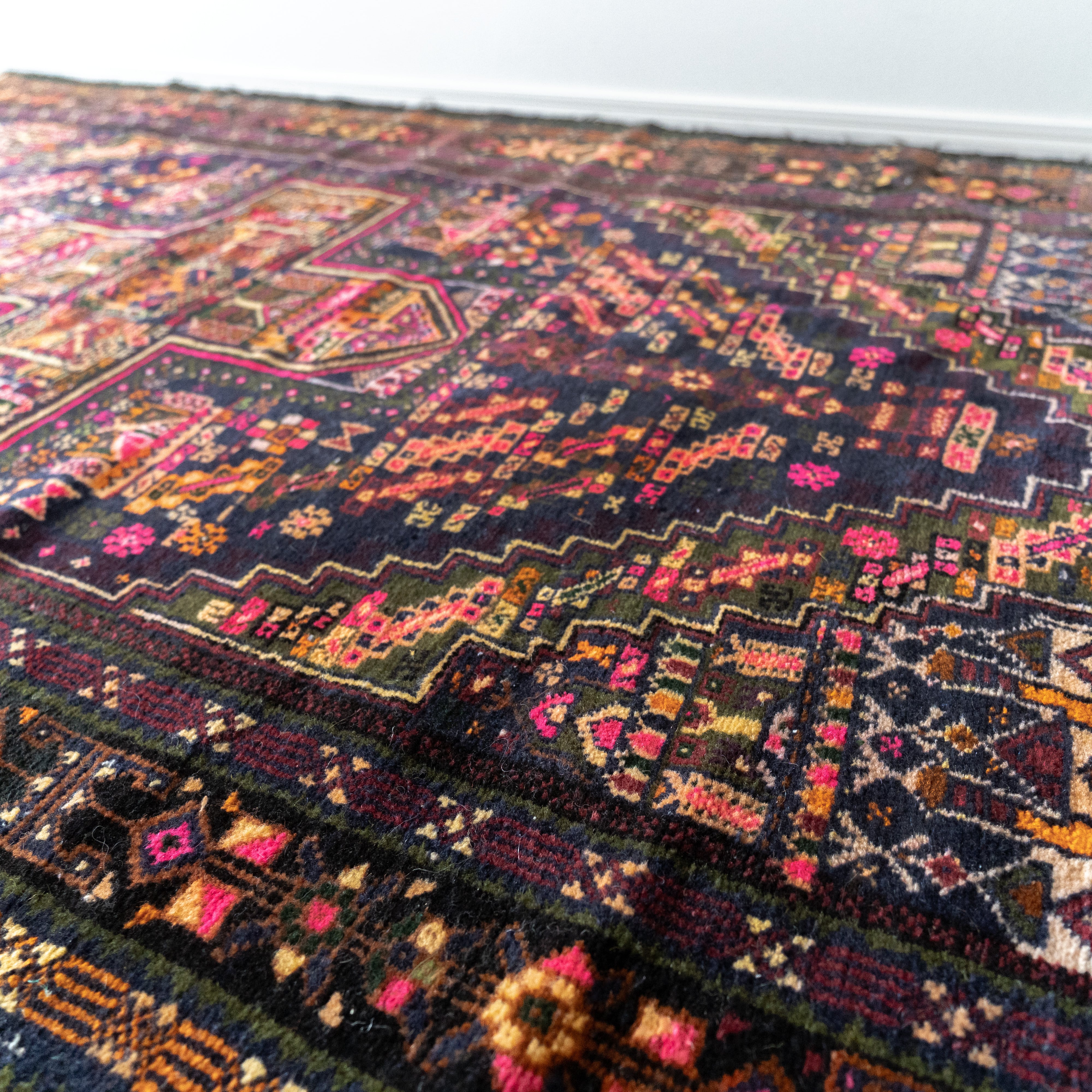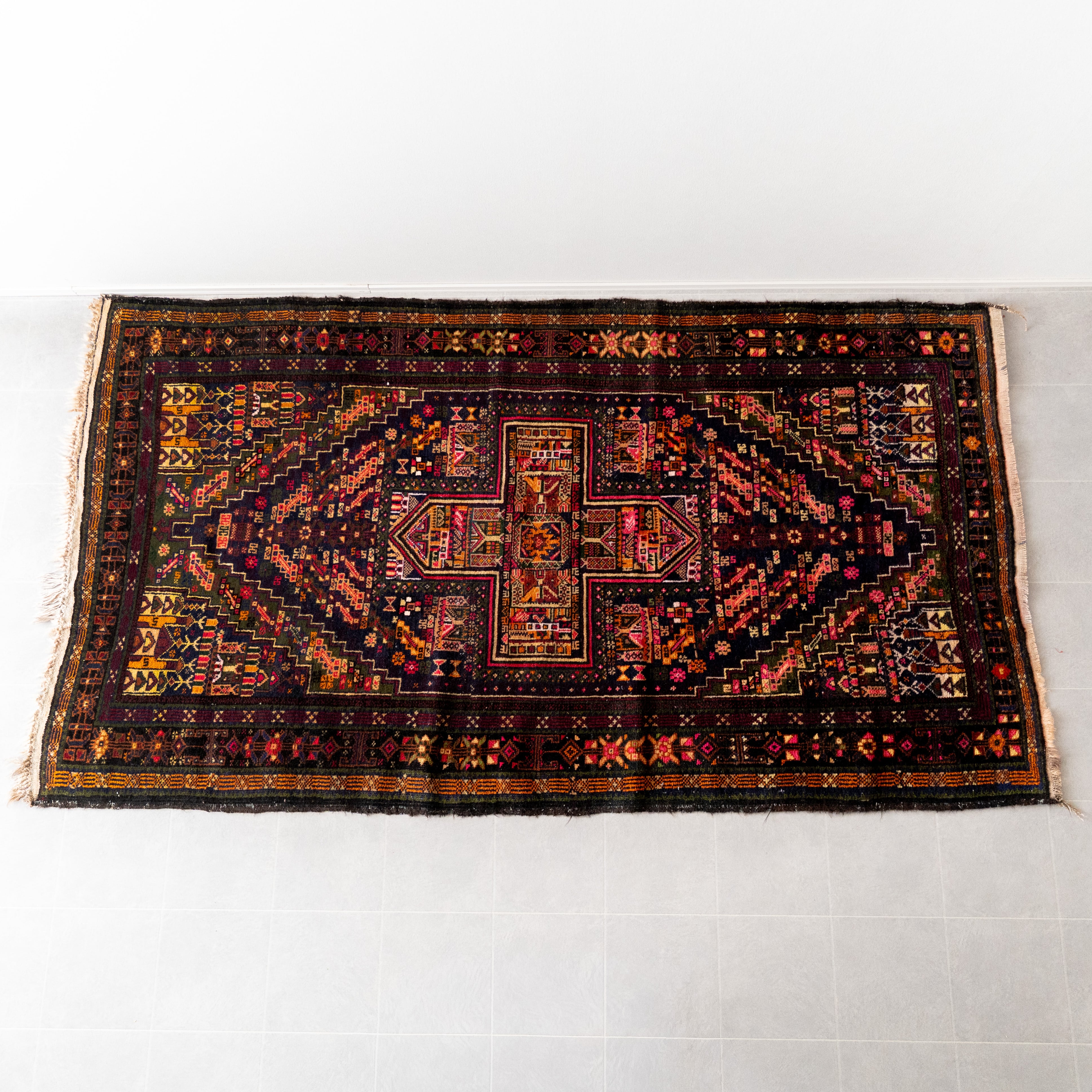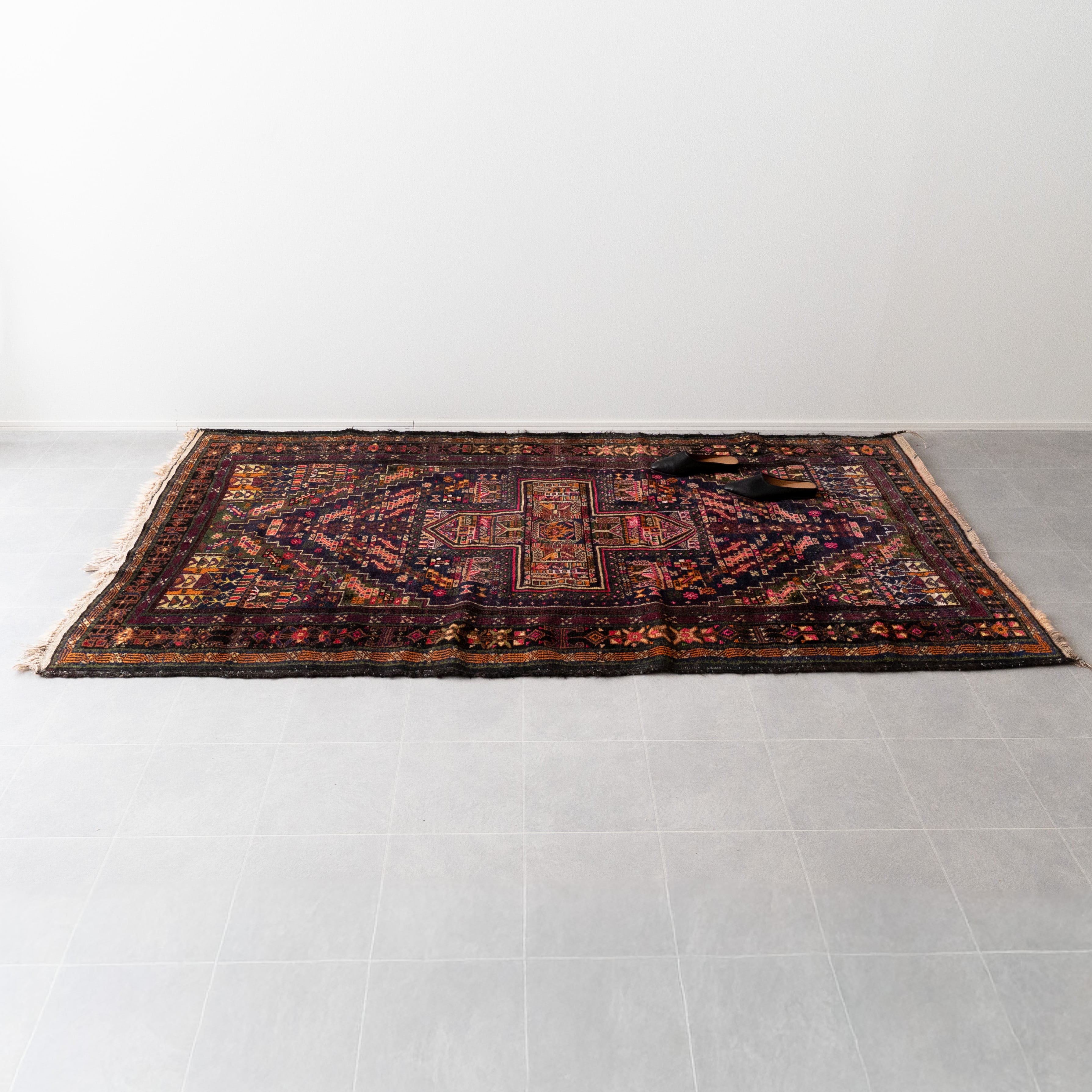 このラグの魅力はなんといっても配色のバランスが素晴らしいこと。細かなモチーフ柄と配色のハーモニーが美しくうっとりしてしまうような高級感のある見た目です。