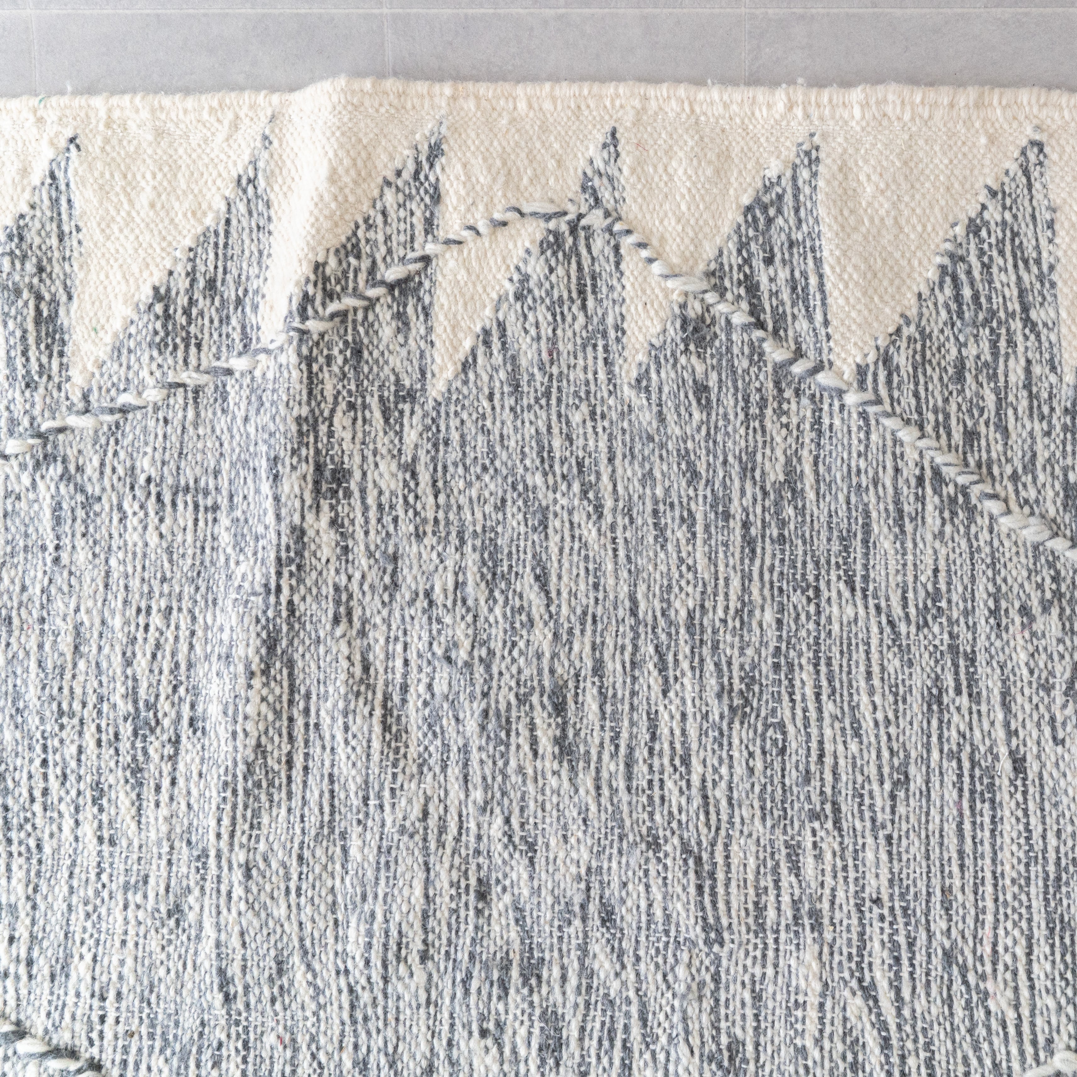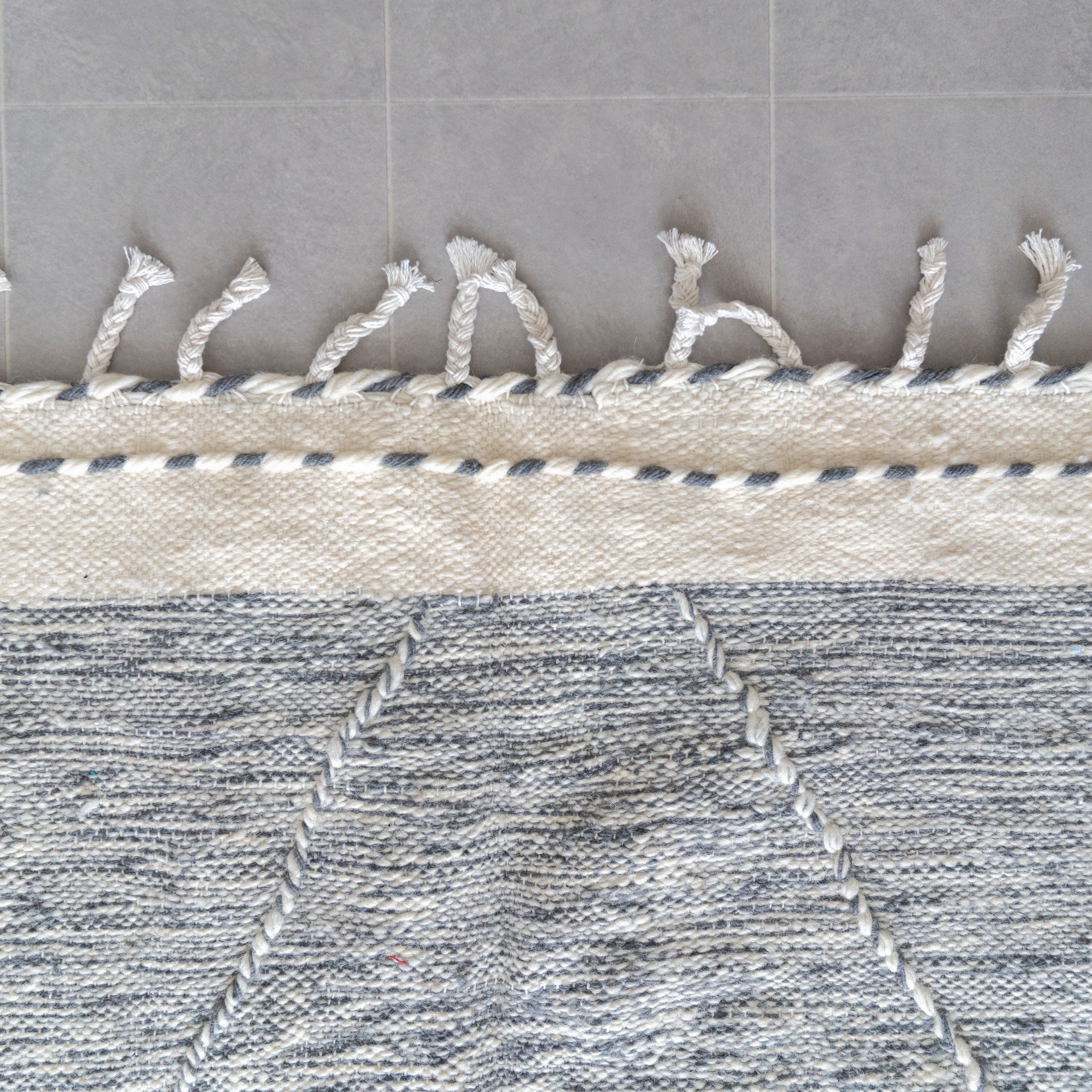 ホワイトをベースにグレーで織り柄が表現された余分な装飾は省いたシックな雰囲気。丁寧な織りから紡がれた薄っすらと浮かぶ織り柄とサイドのタッセルがアクセントになっています。