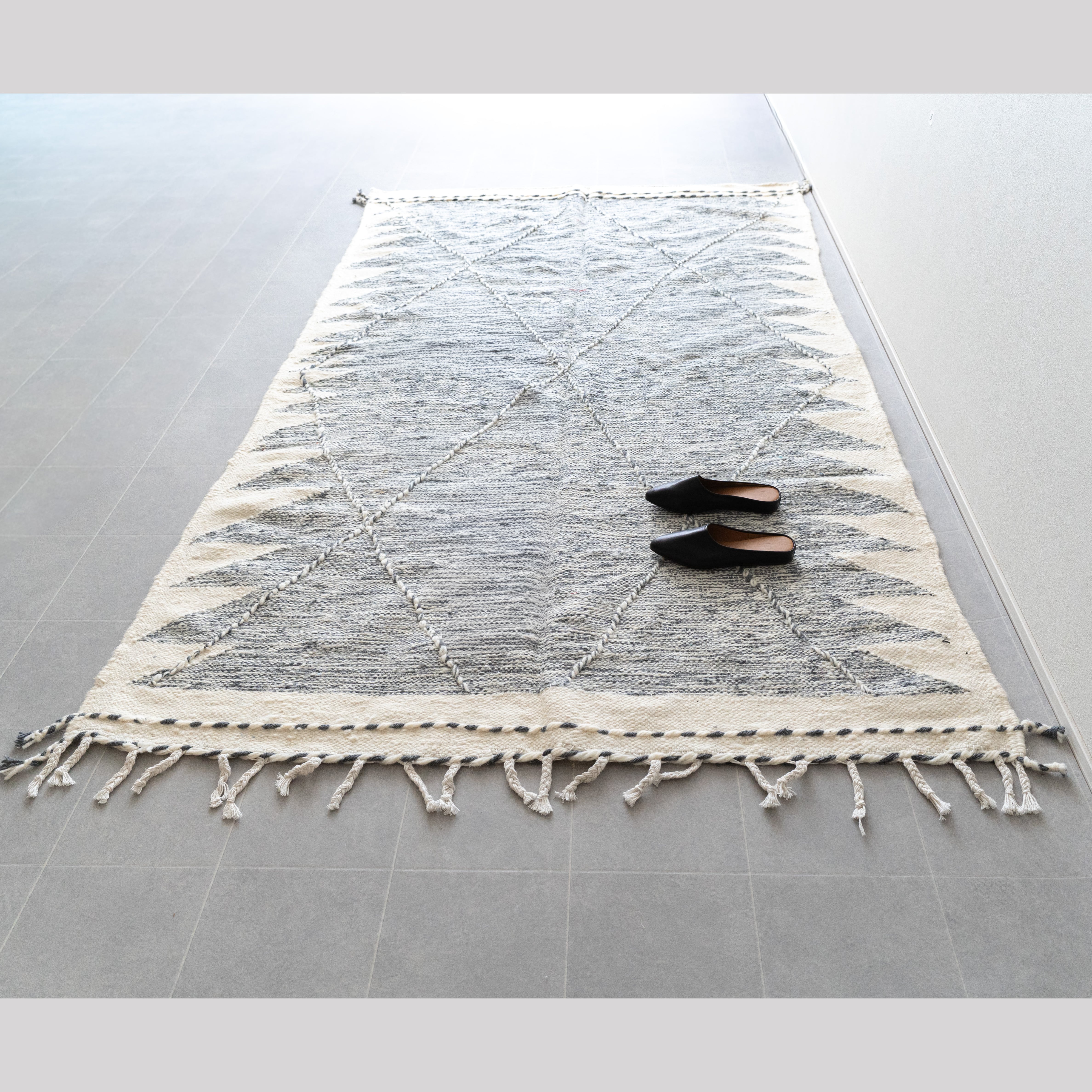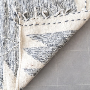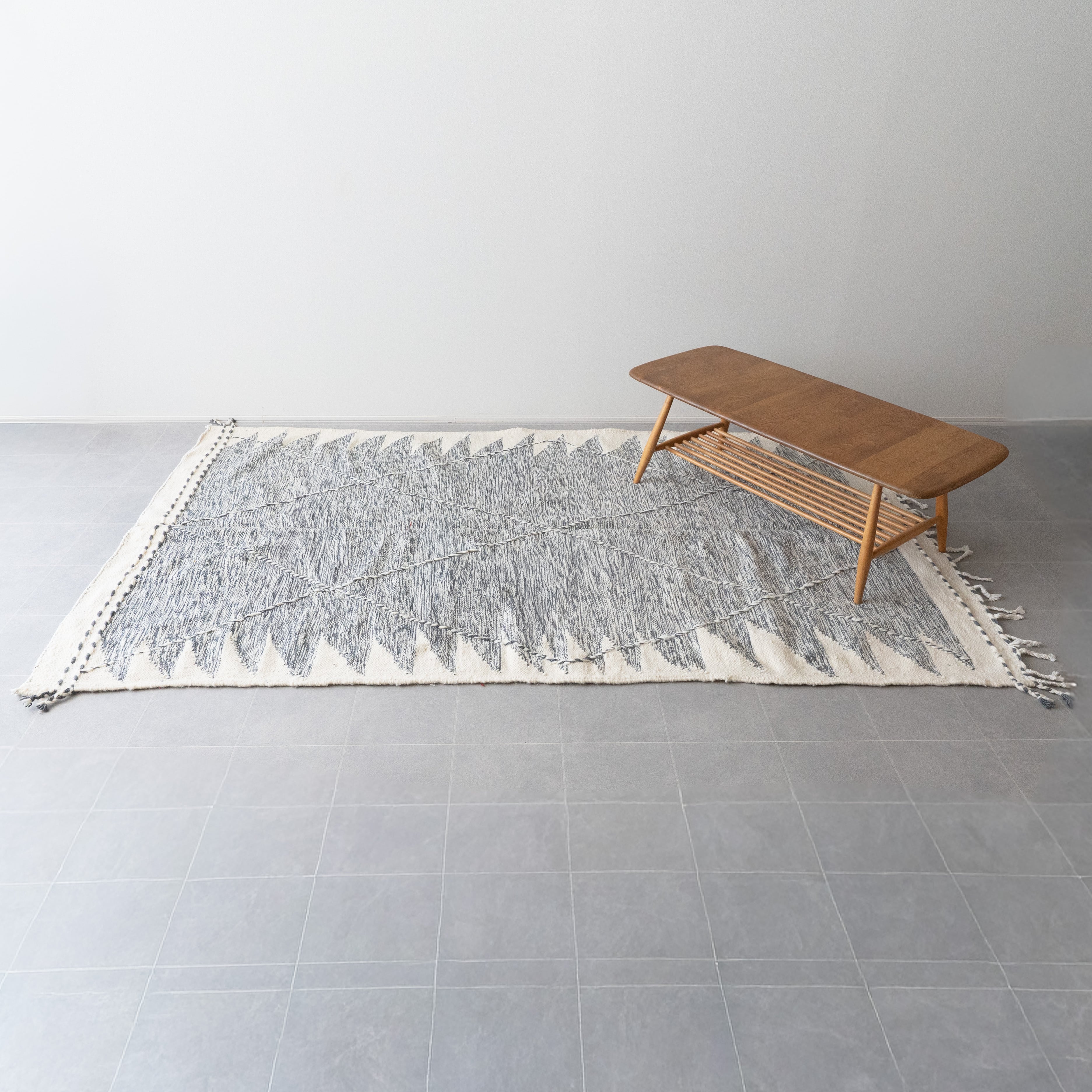 このラグの魅力は何と言ってもモダンなデザイン。モロッコの伝統的なキリムの平織りのテクニックを用いて、洗練されたお洒落な配色&デザインに仕上げています。