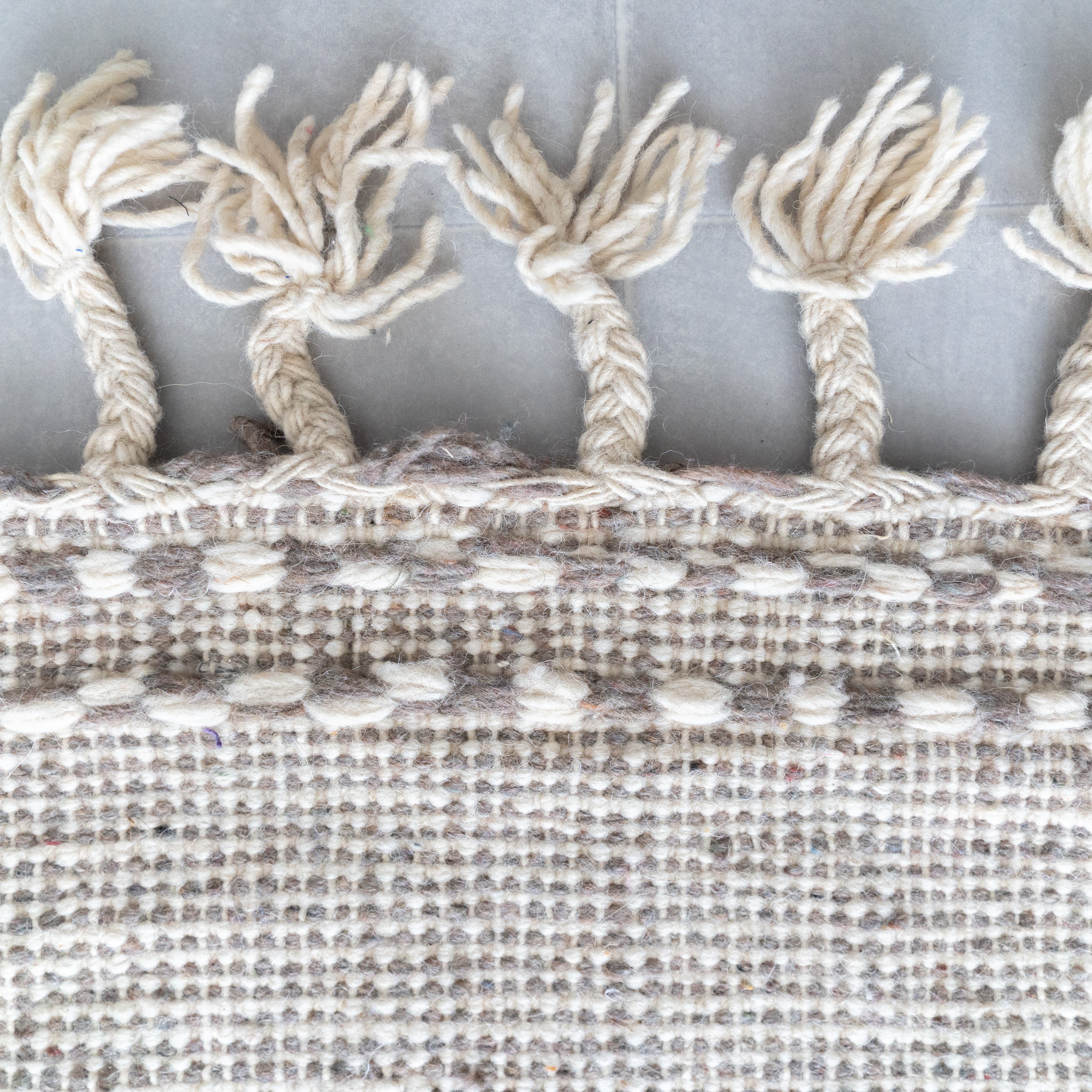 ブラウン寄りのオシャレなベージュ。千鳥格子のようなチェック柄がモダンな雰囲気を纏います。余分な装飾は省いたシックな雰囲気。丁寧な織りから紡がれたサイドに浮かぶ織り柄とサイドのタッセルがアクセントになっています。