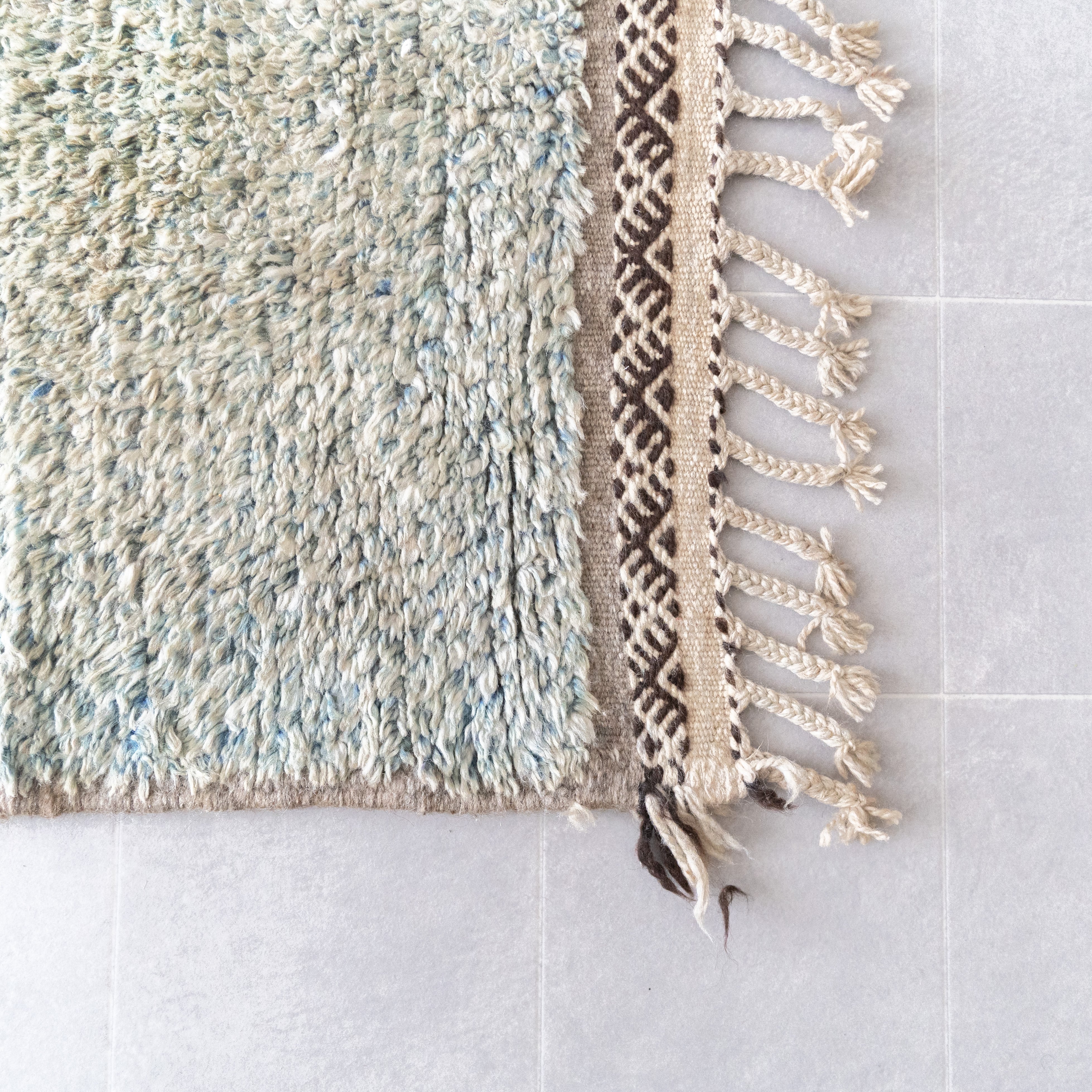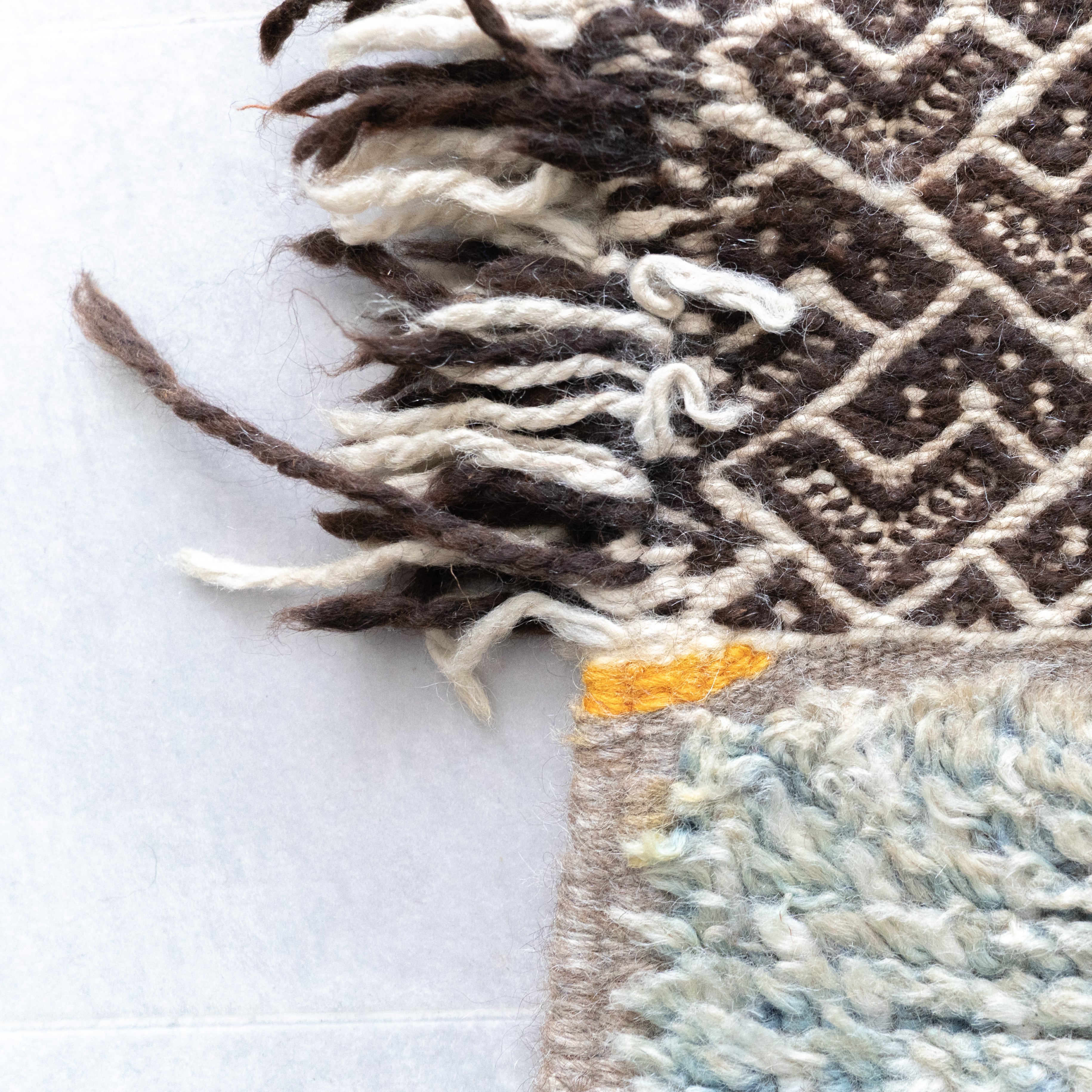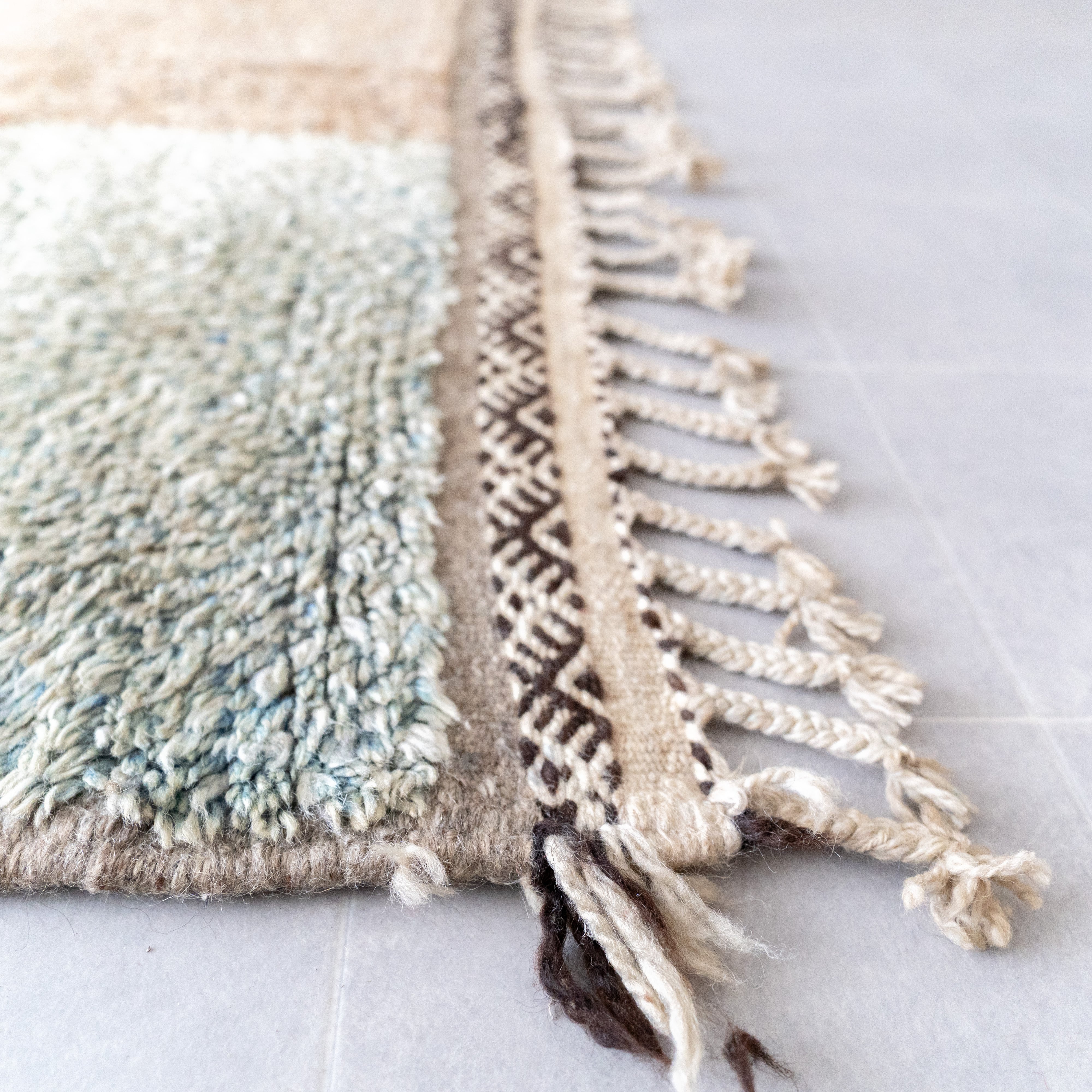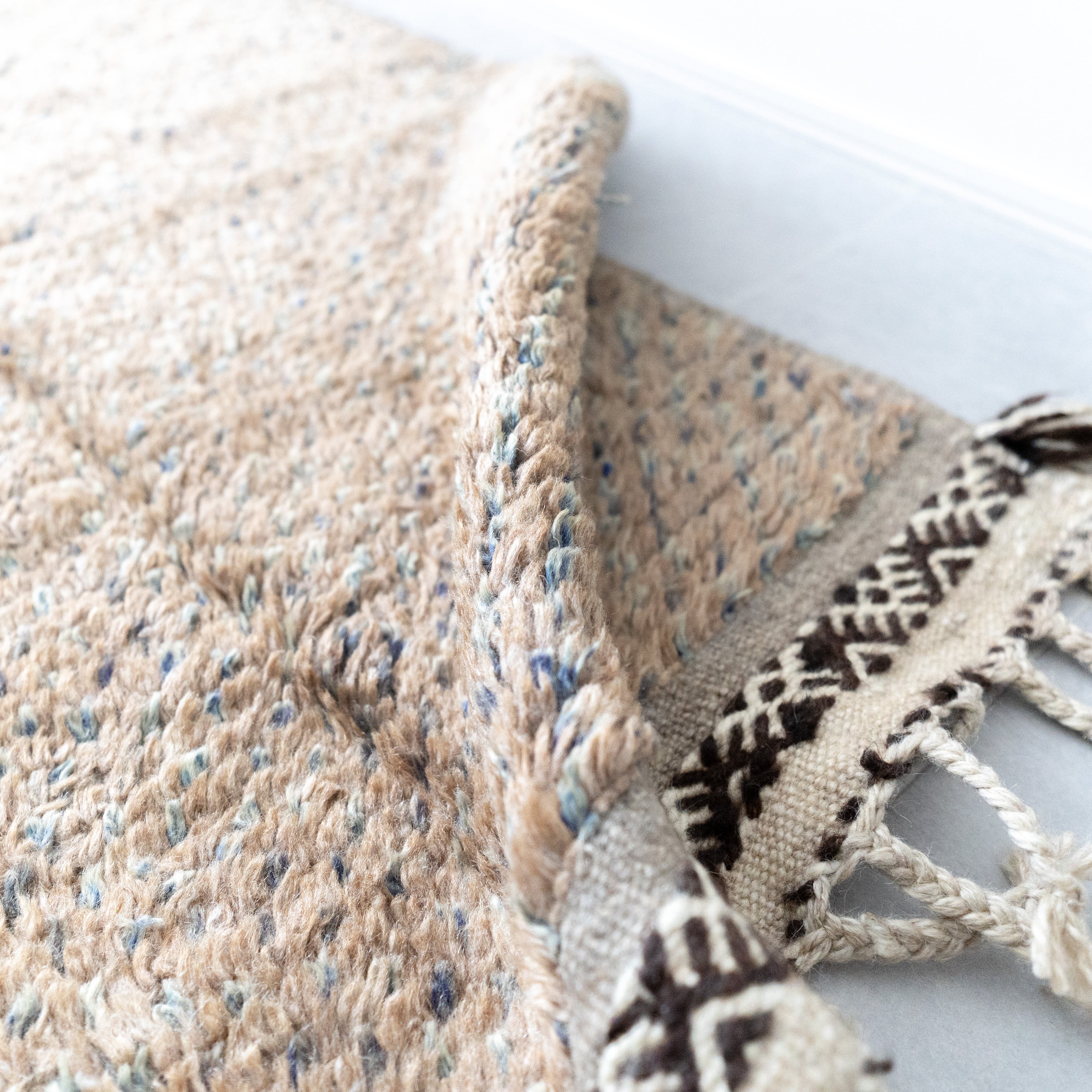 左サイドのフリンジが上品なアクセントに。右サイドはやや光沢のある毛足×絶妙カラー。半分はザナフィ織の幾何学模様を施し、左右4面で異なるデザインながらも調和の取れた美しい仕上がりで、全体的にモダンな存在感を放ちます。