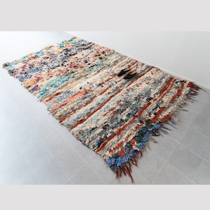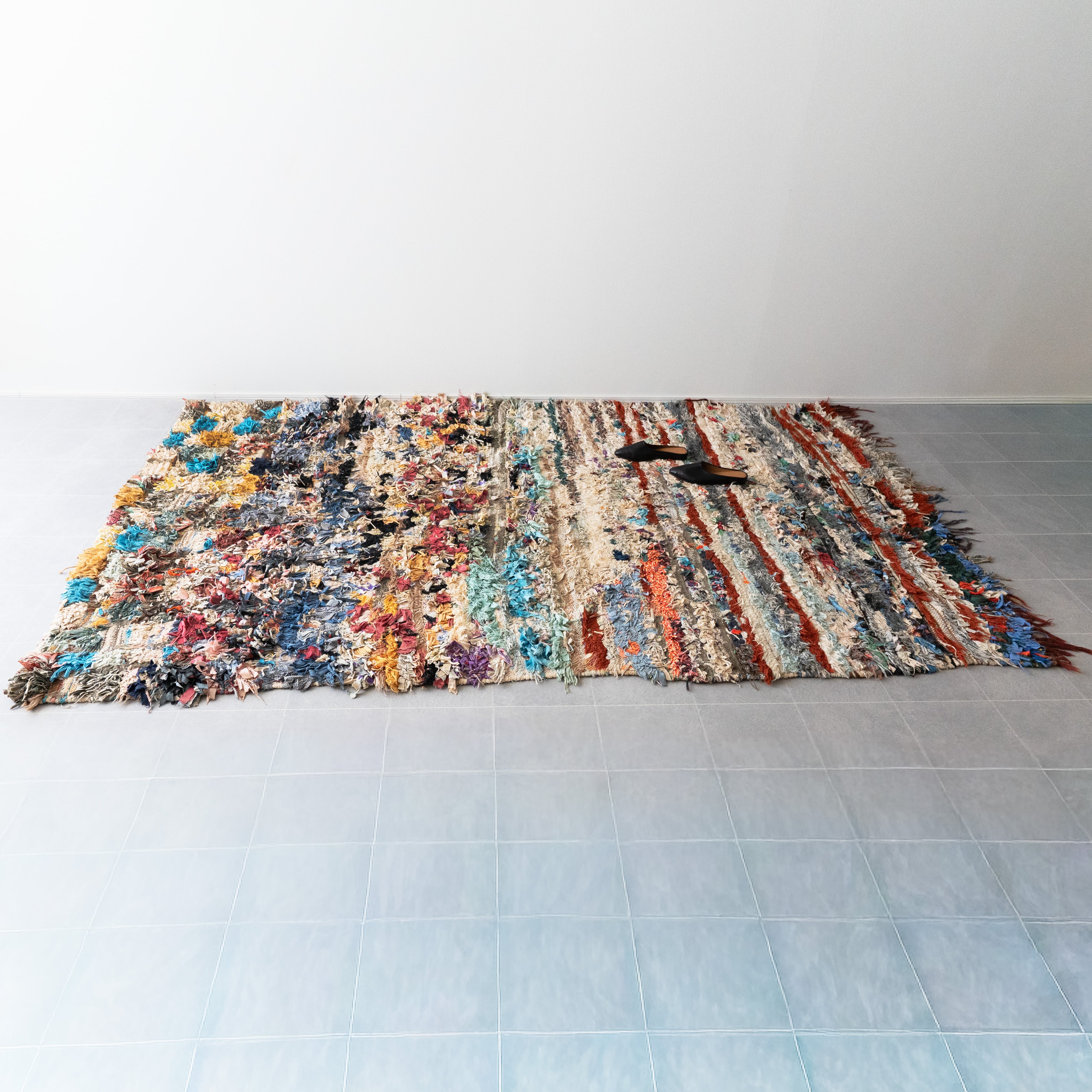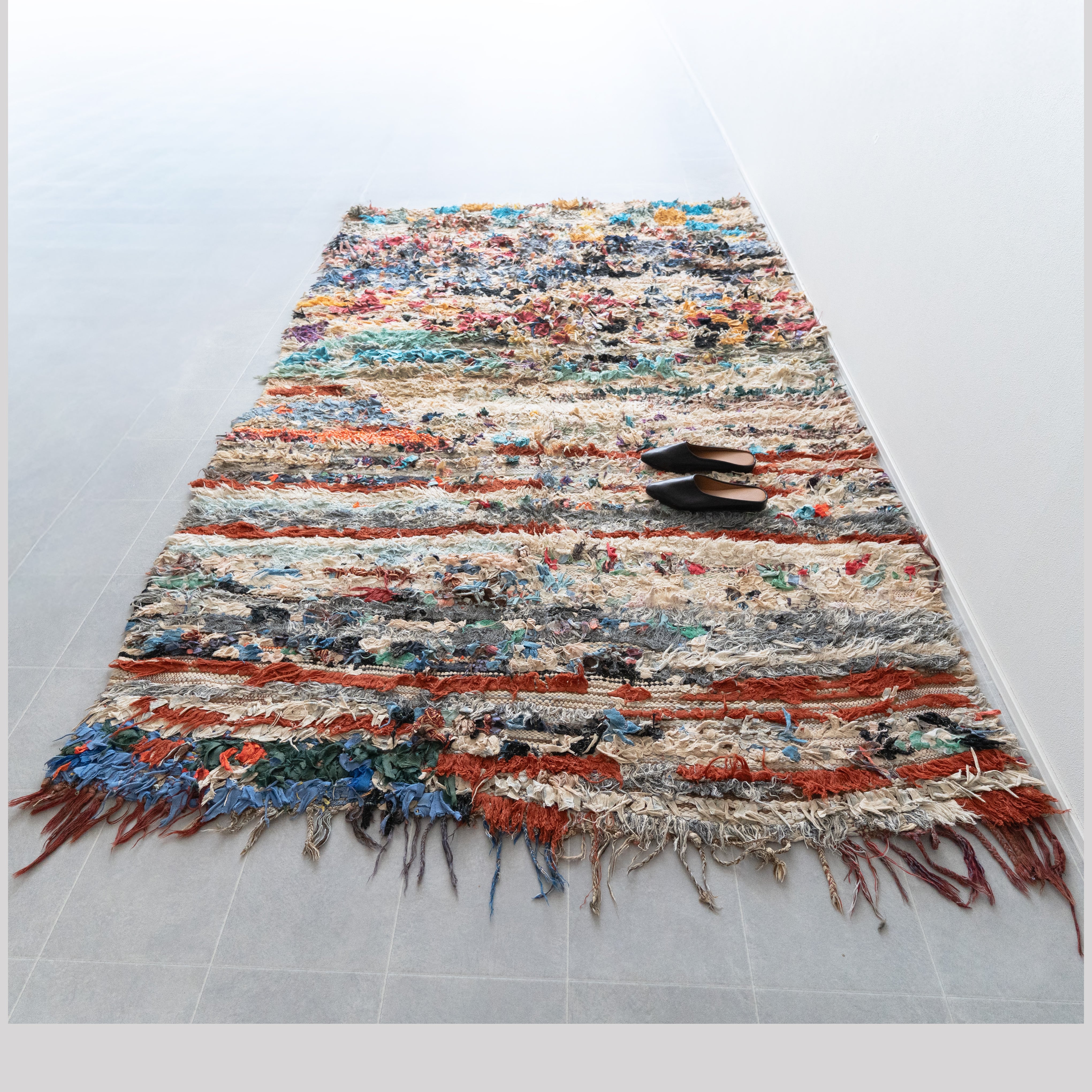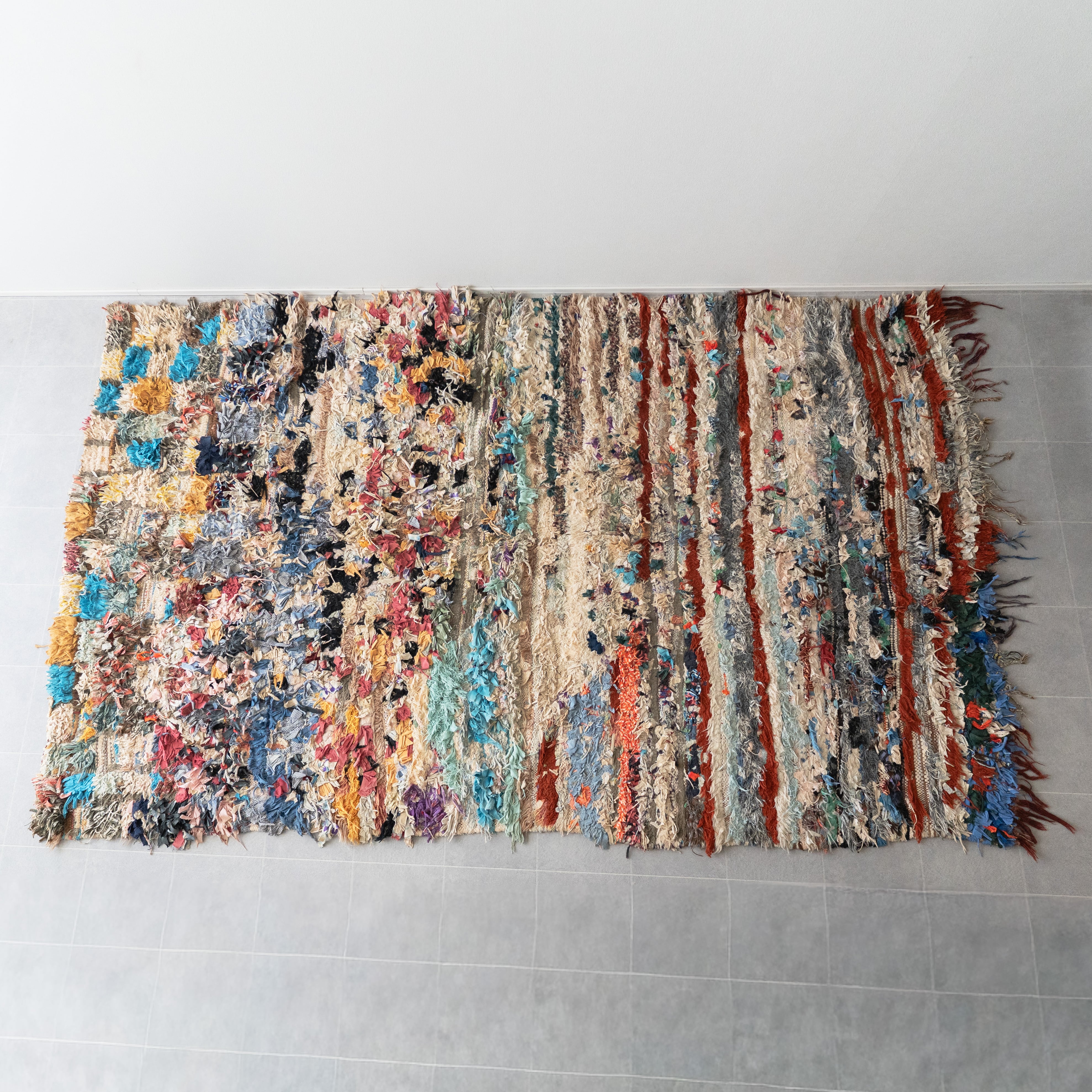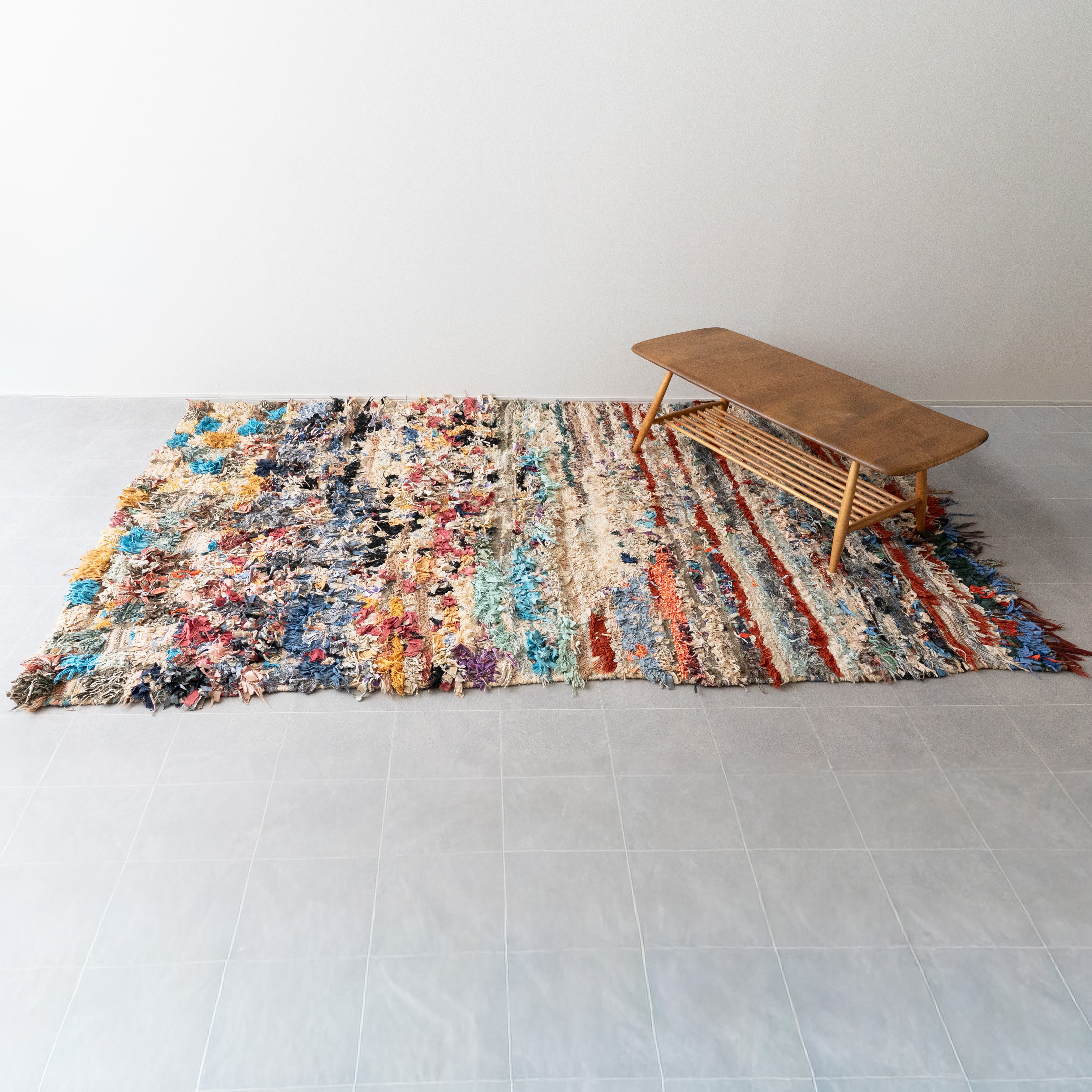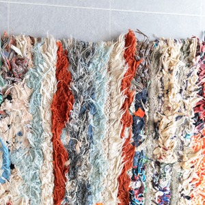 アトラス山脈をはじめ、モロッコ各地のベルベル村の女性達によって織られる絨毯、ボ・シャルウィット。素材は全て服の端切でできたリサイクル絨毯で、「シャルウィット」はベルベル語で端切れという意味です。遊牧生活から定住生活に変わったことで、羊を買う必要性がなくなったことから、リサイクルが得意なベルベルの女性たちは羊の毛の代わりに自分たちの着なくなった服を裂いて織り始めました。ウールのラグよりも歴史が浅いため、「家のために」「嫁入り道具として」織られた古いボ・シャルウィットは今では見つかりにくくなりました。