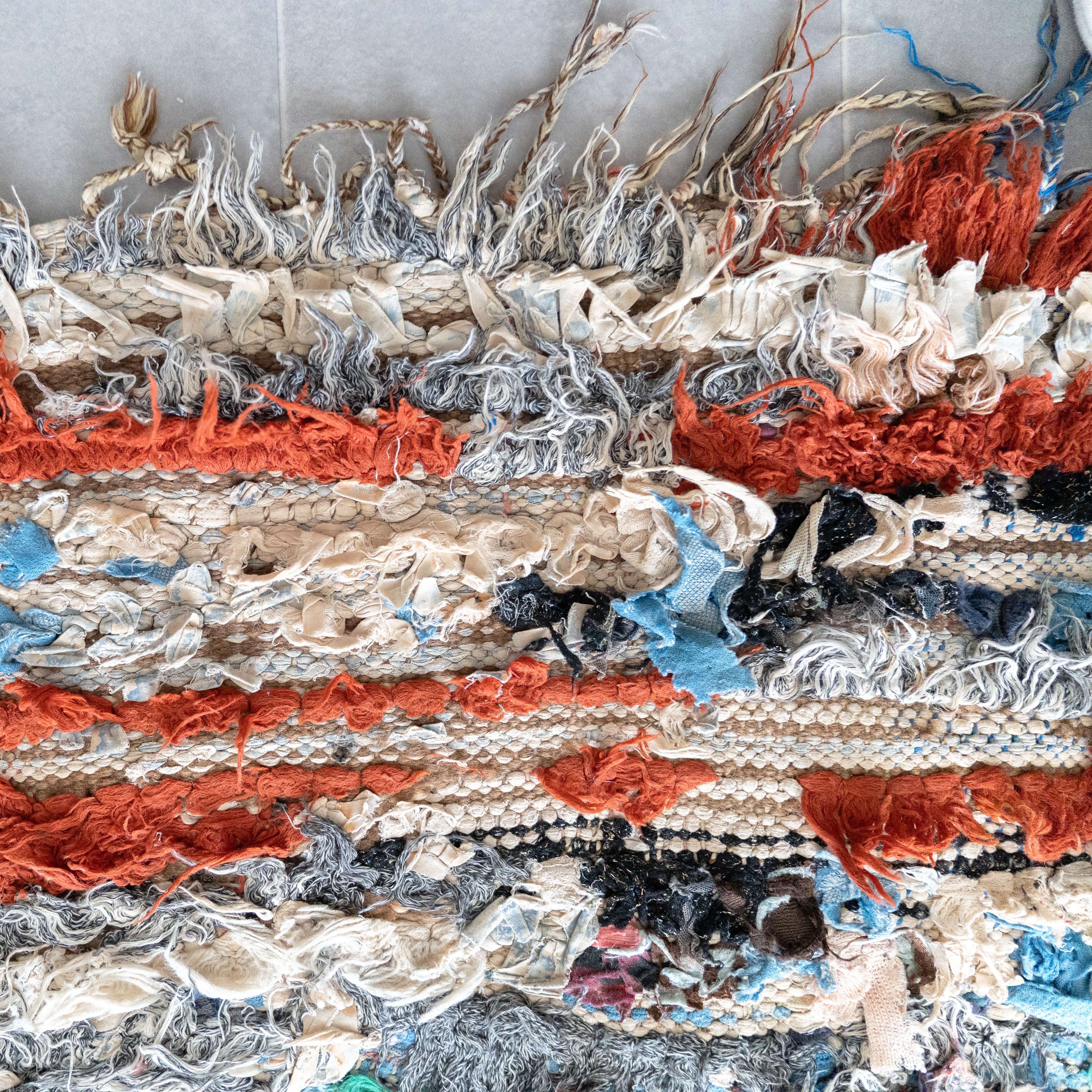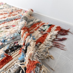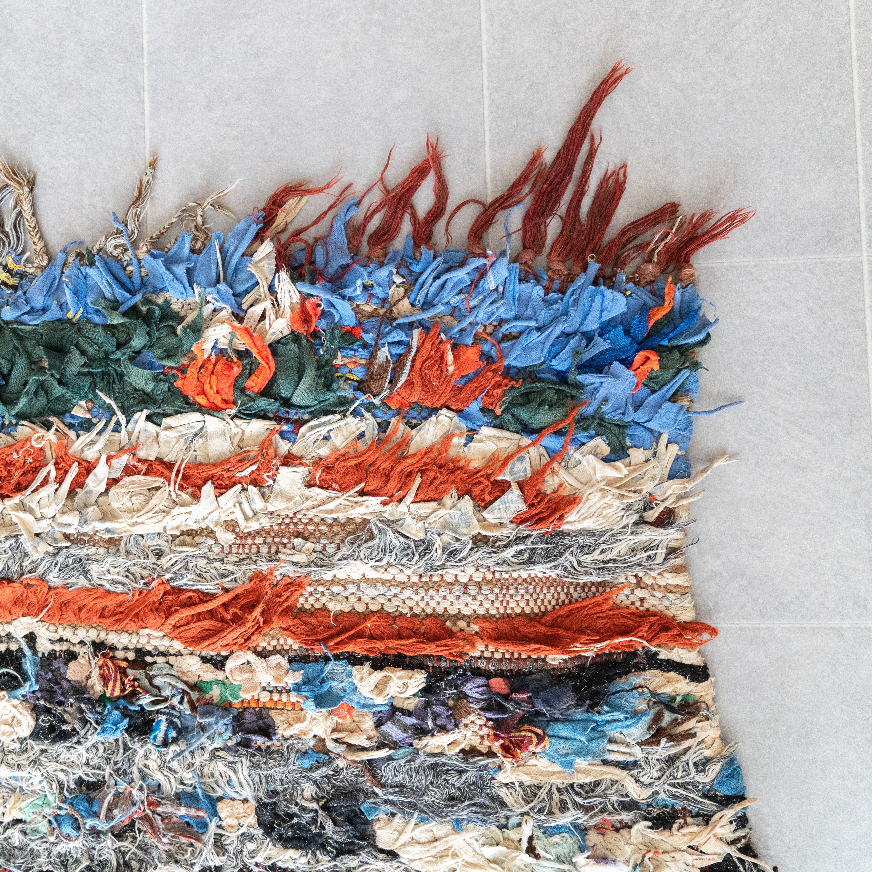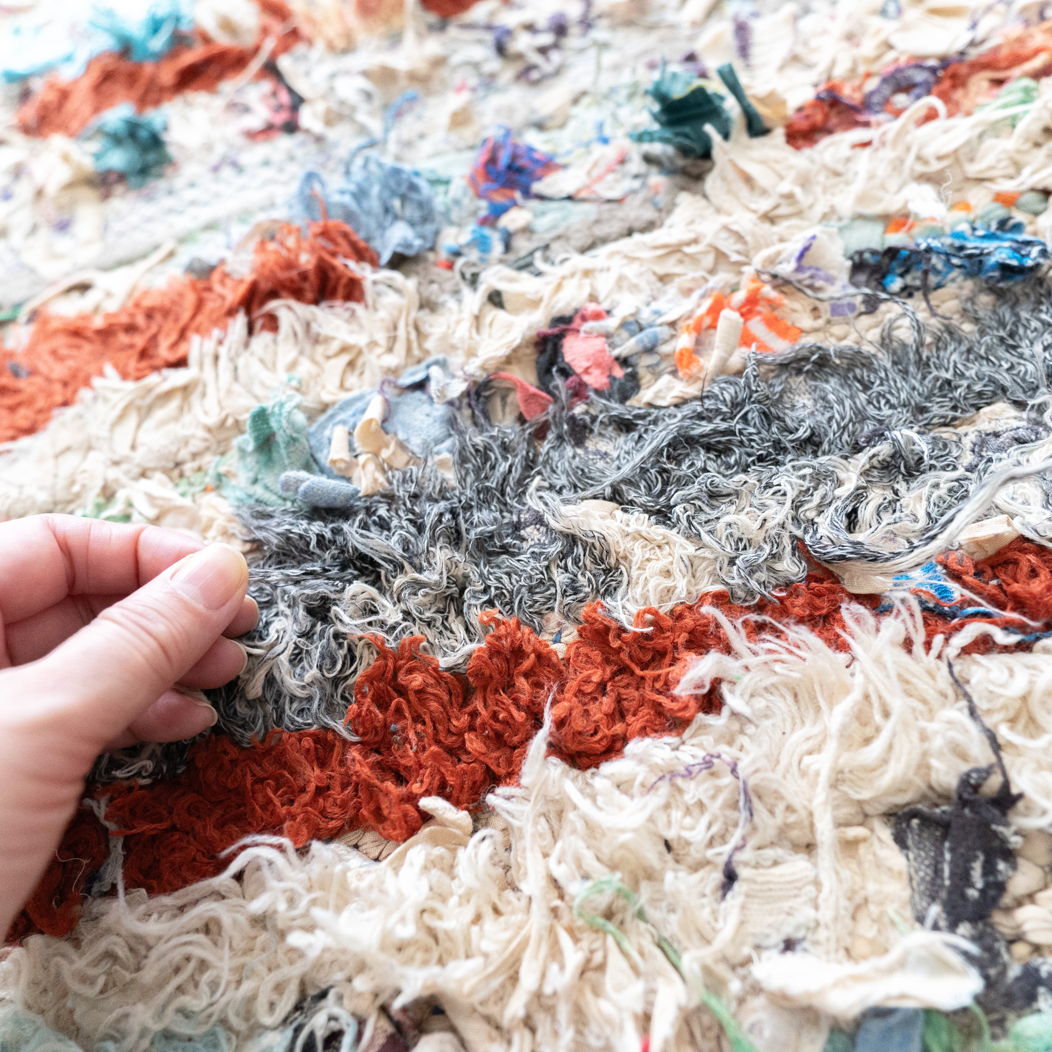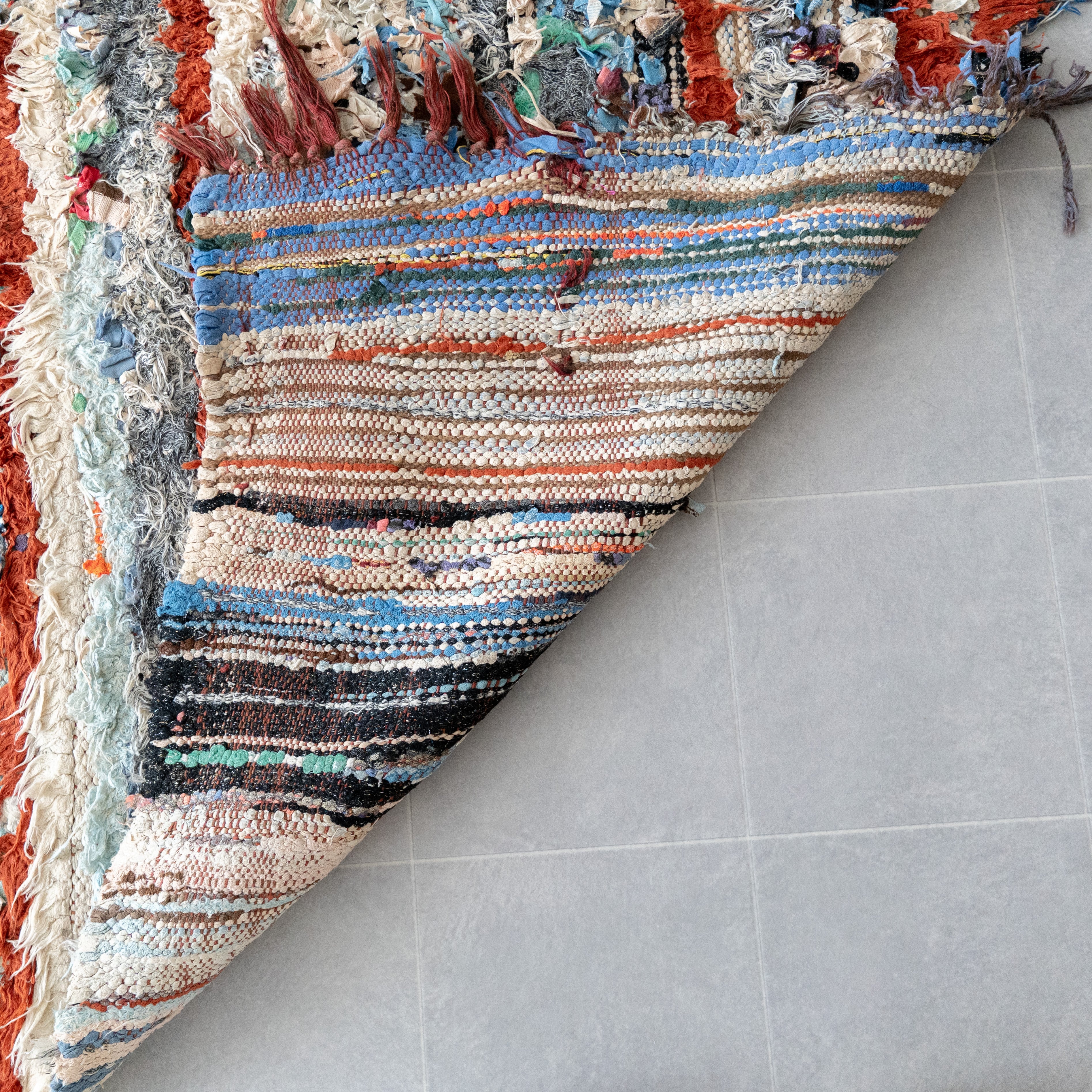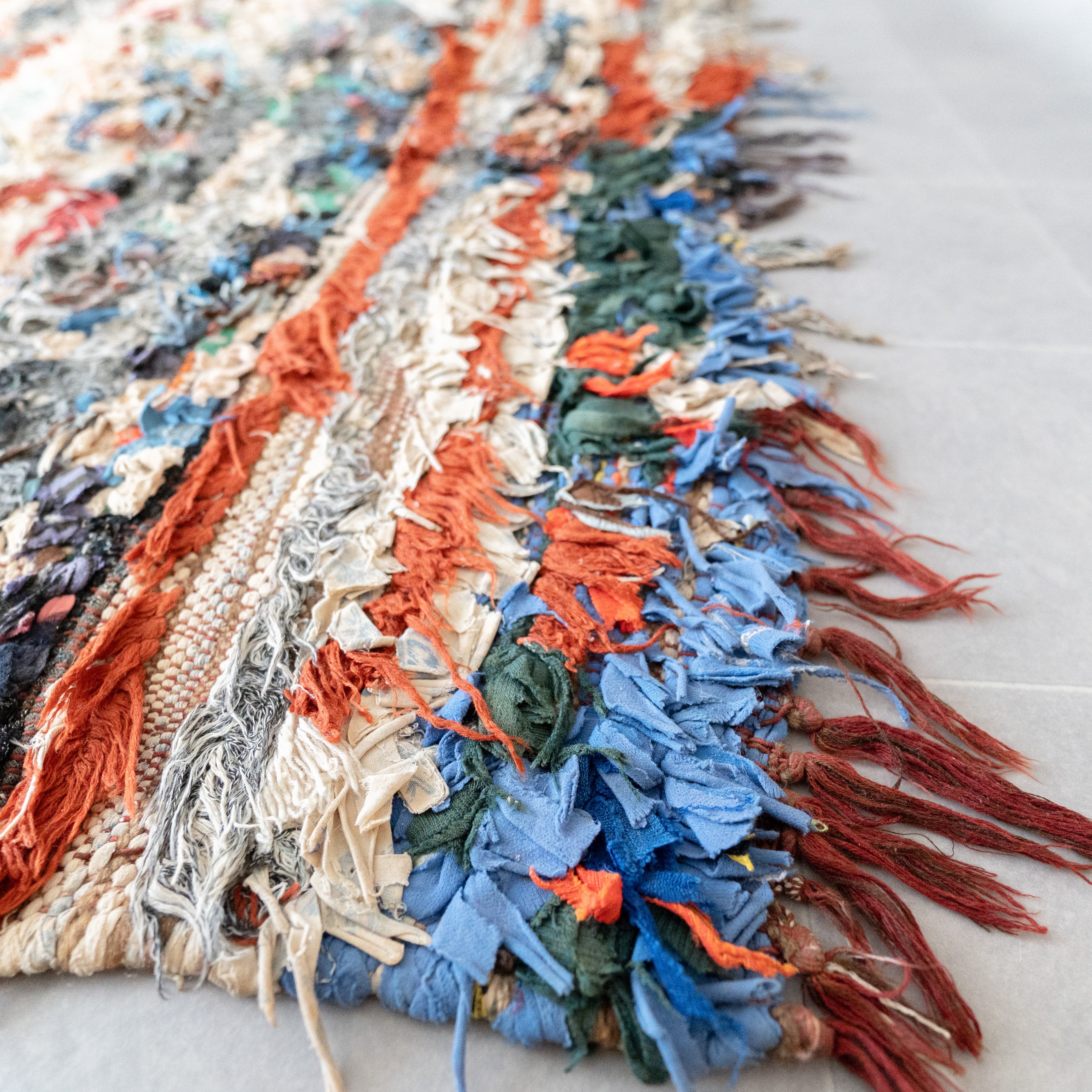 アトラス山脈をはじめ、モロッコ各地のベルベル村の女性達によって織られる絨毯、ボ・シャルウィット。素材は全て服の端切でできたリサイクル絨毯で、「シャルウィット」はベルベル語で端切れという意味です。遊牧生活から定住生活に変わったことで、羊を買う必要性がなくなったことから、リサイクルが得意なベルベルの女性たちは羊の毛の代わりに自分たちの着なくなった服を裂いて織り始めました。ウールのラグよりも歴史が浅いため、「家のために」「嫁入り道具として」織られた古いボ・シャルウィットは今では見つかりにくくなりました。