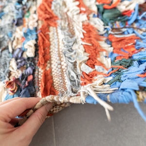 リビングのメインラグにぴったりな大判サイズ。多色使いですが主張しすぎないのでヴィンテージの木製家具と合わせていただくとポイントになって素敵。コットンメインの素材ですので通年でお楽しみいただけます。