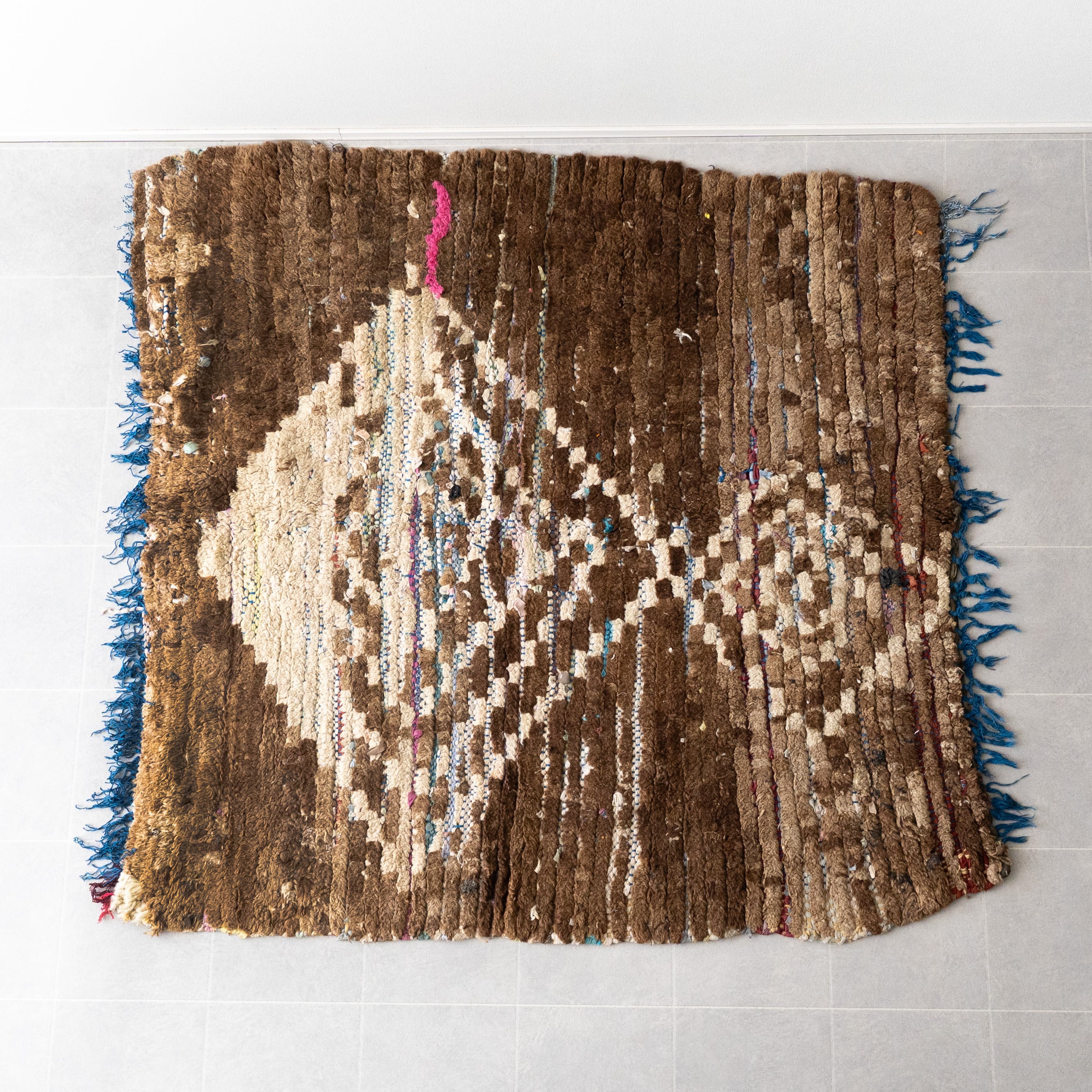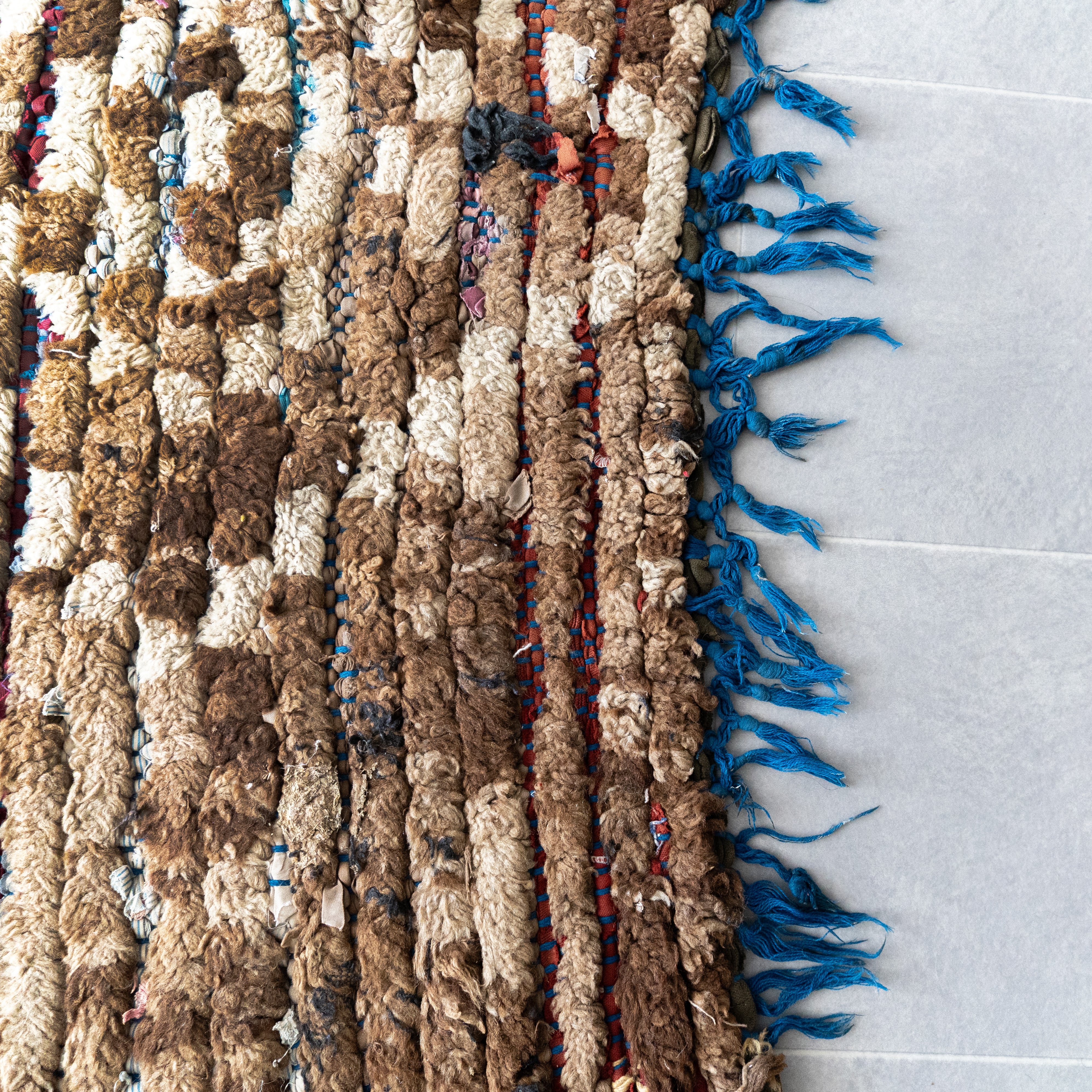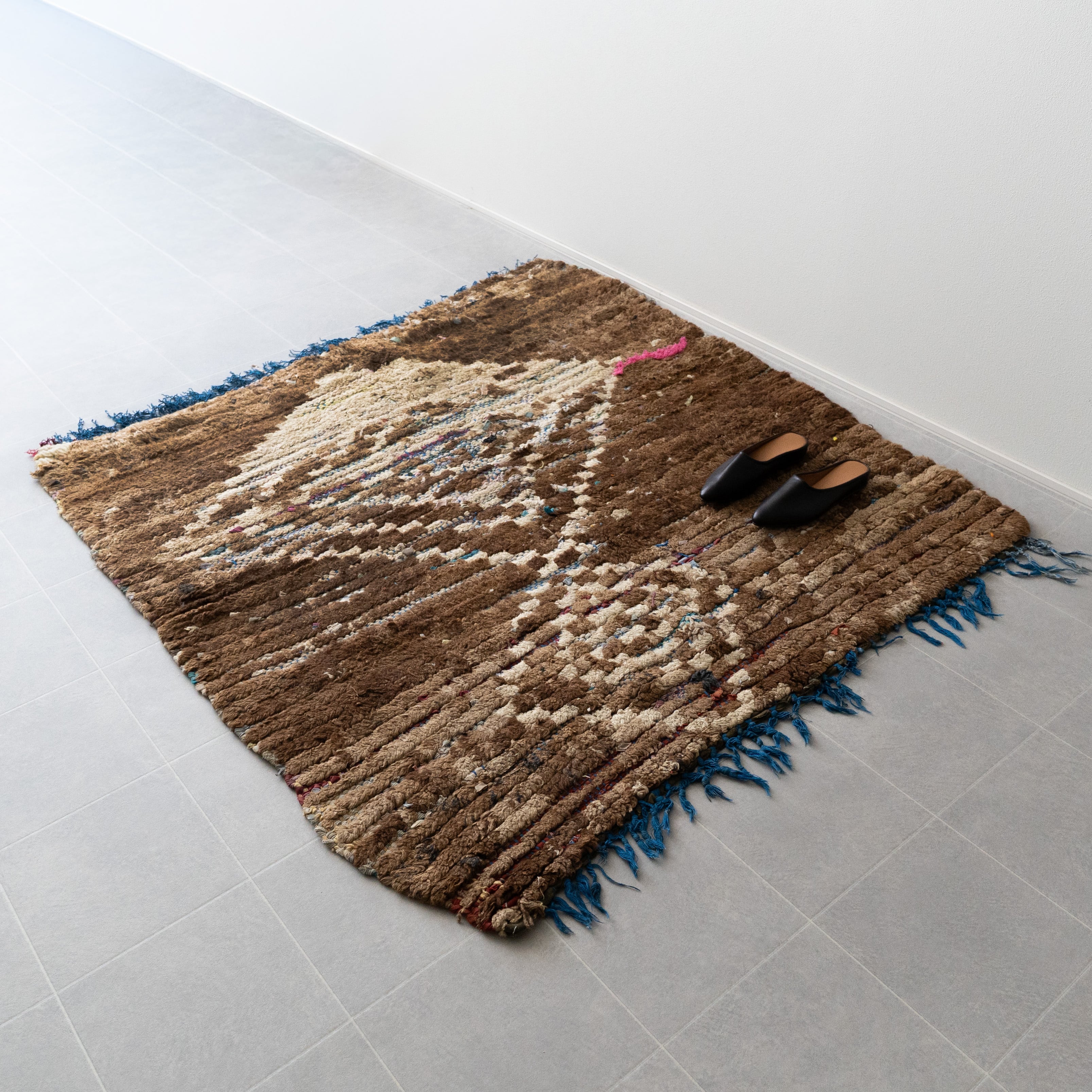 ブジャドの織りに部分的にボシャルウィットを混ぜたヴィンテージラグ。落ち着いたトーンのダークブラウンに格子模様がモダンな印象に仕上がっています。サイドに施したブルーのフリンジがお洒落なアクセントに。ブラウンのグラデーションとモコモコとした表面感が絶妙なバランスです。