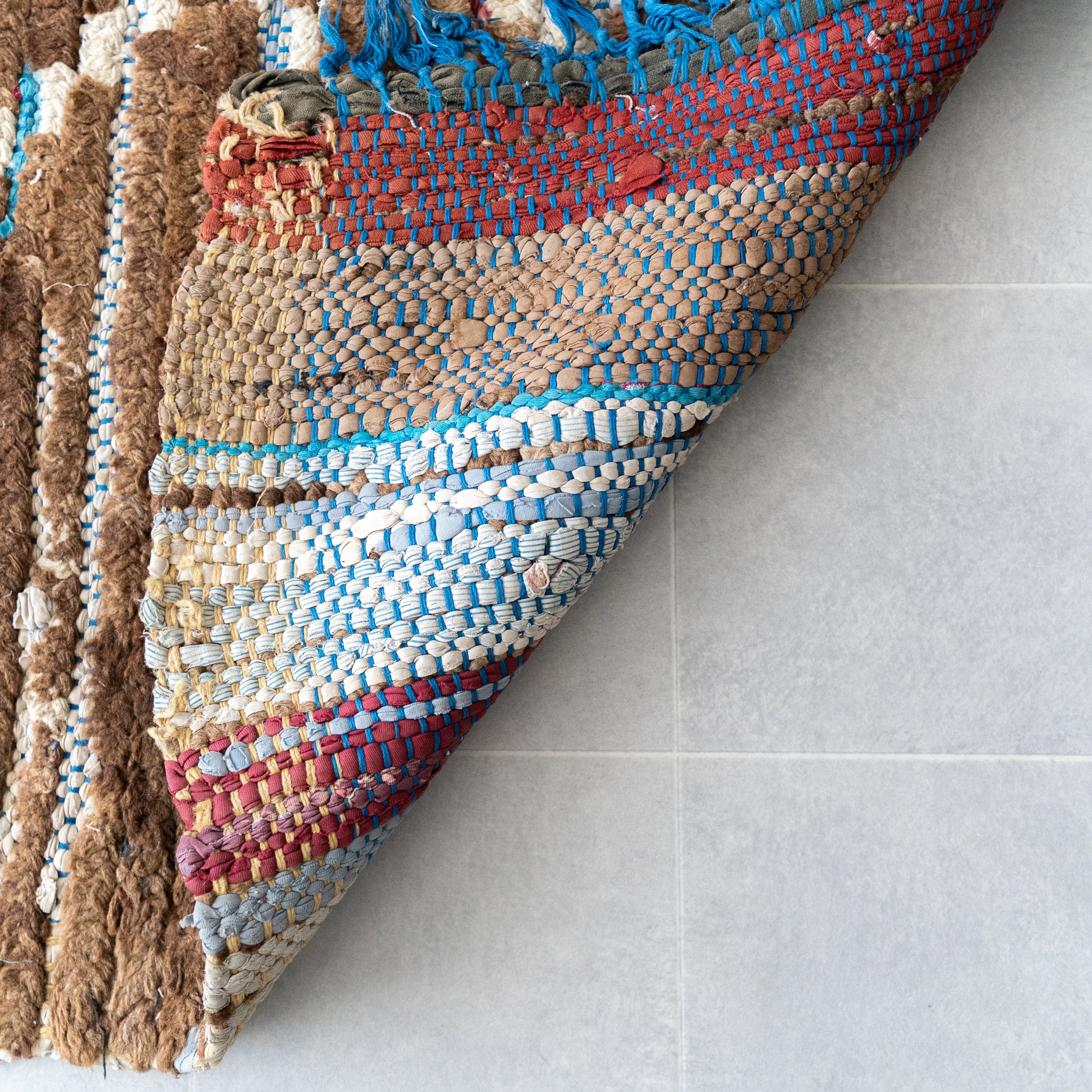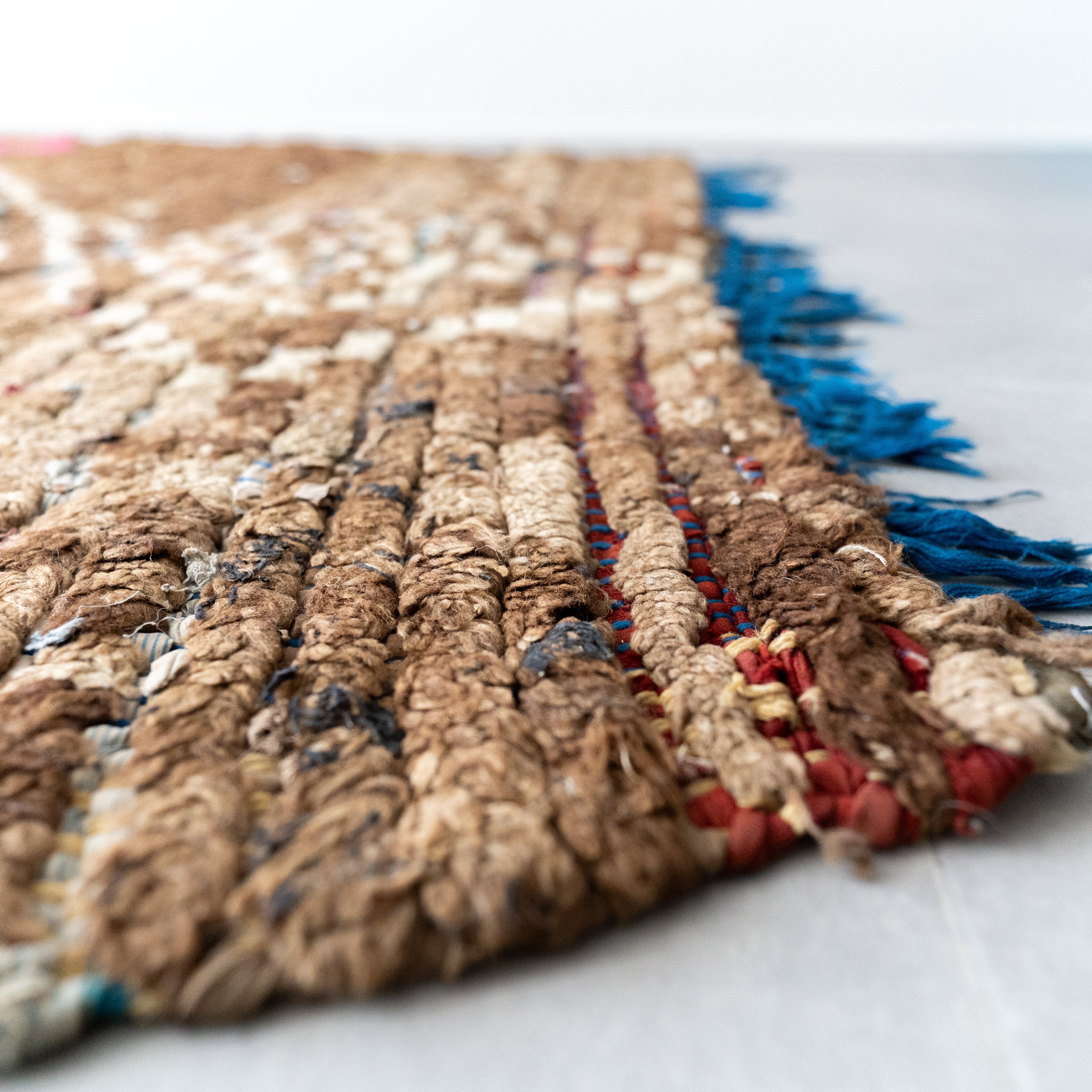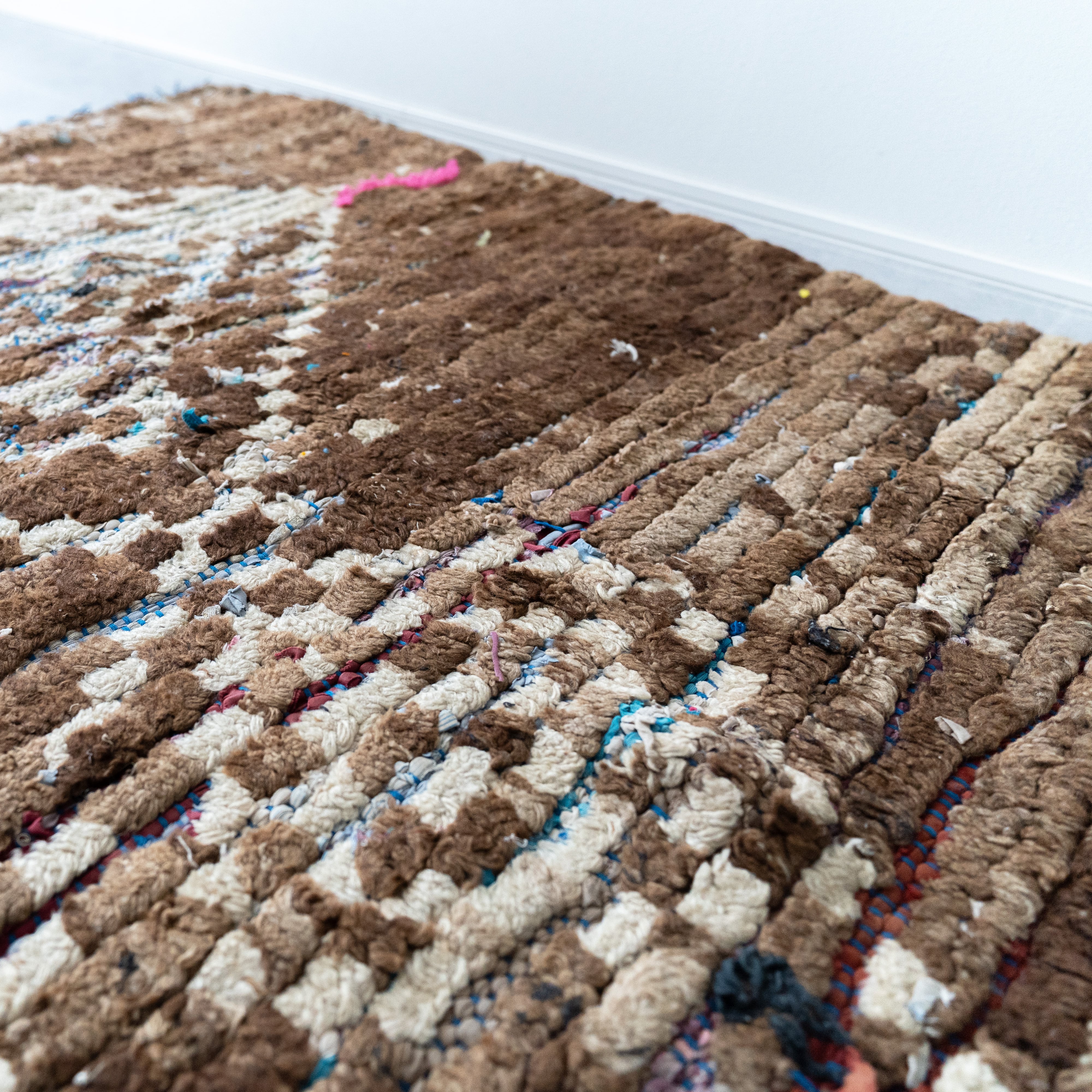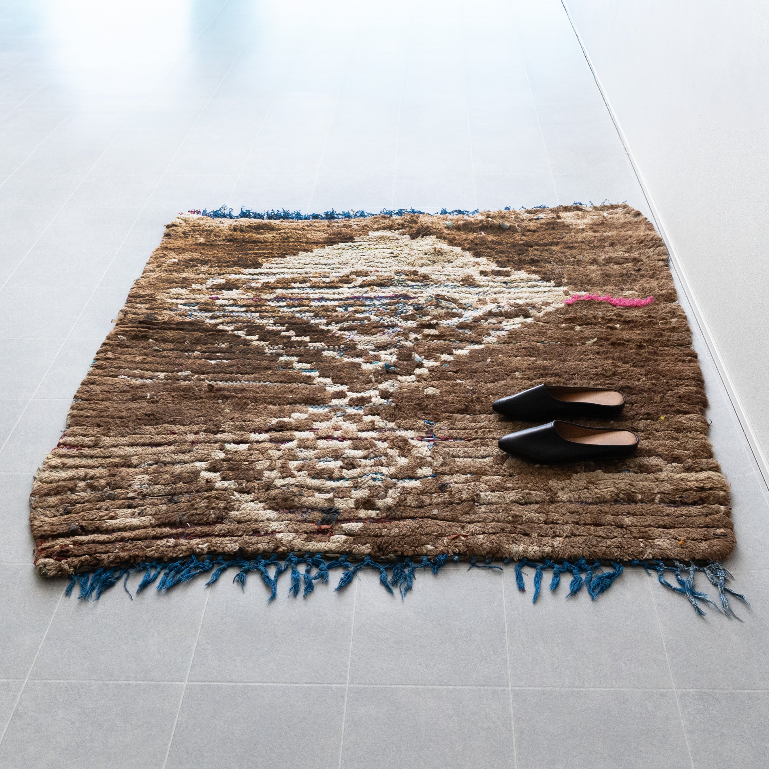 ブジャドの織りに部分的にボシャルウィットを混ぜたヴィンテージラグ。落ち着いたトーンのダークブラウンに格子模様がモダンな印象に仕上がっています。サイドに施したブルーのフリンジがお洒落なアクセントに。ブラウンのグラデーションとモコモコとした表面感が絶妙なバランスです。