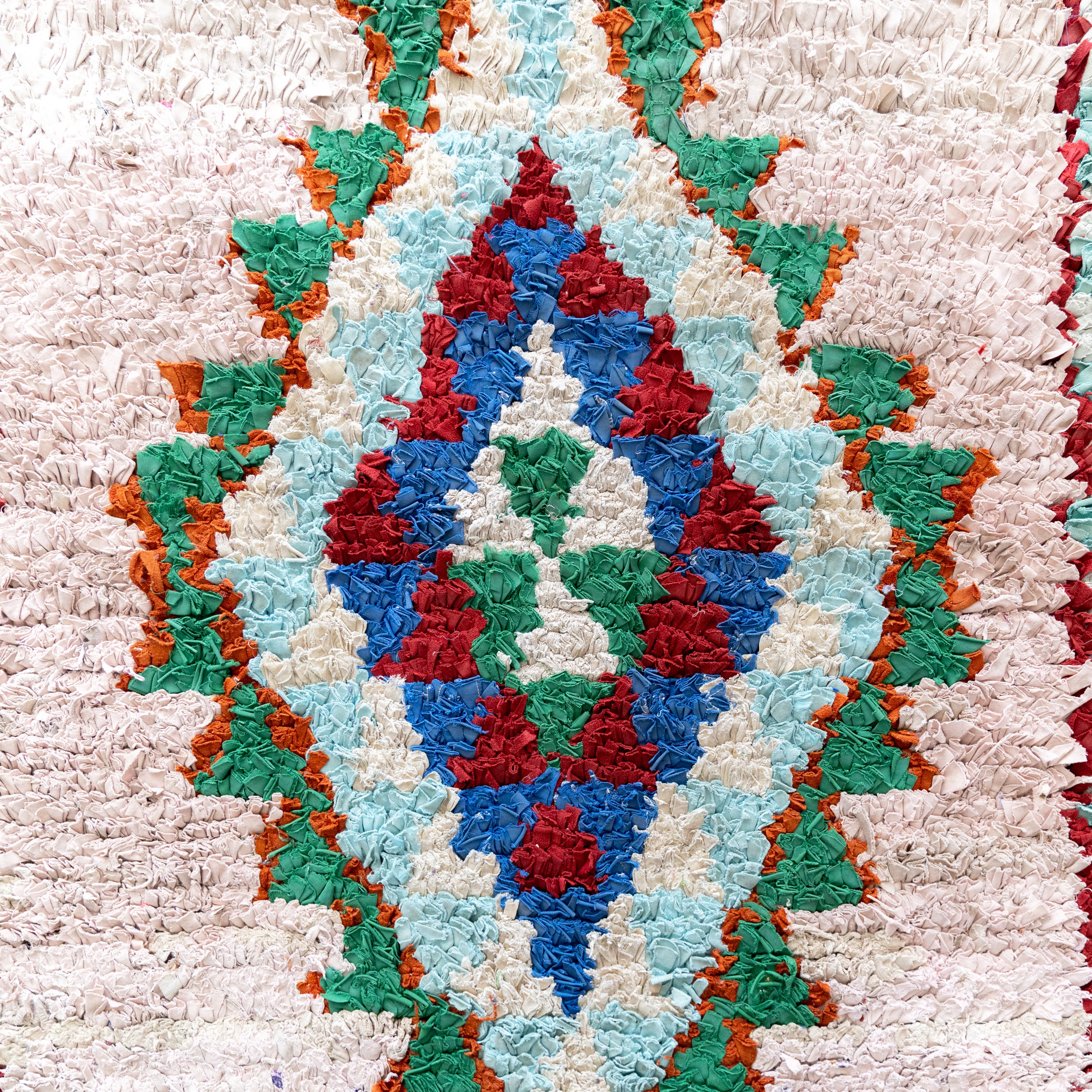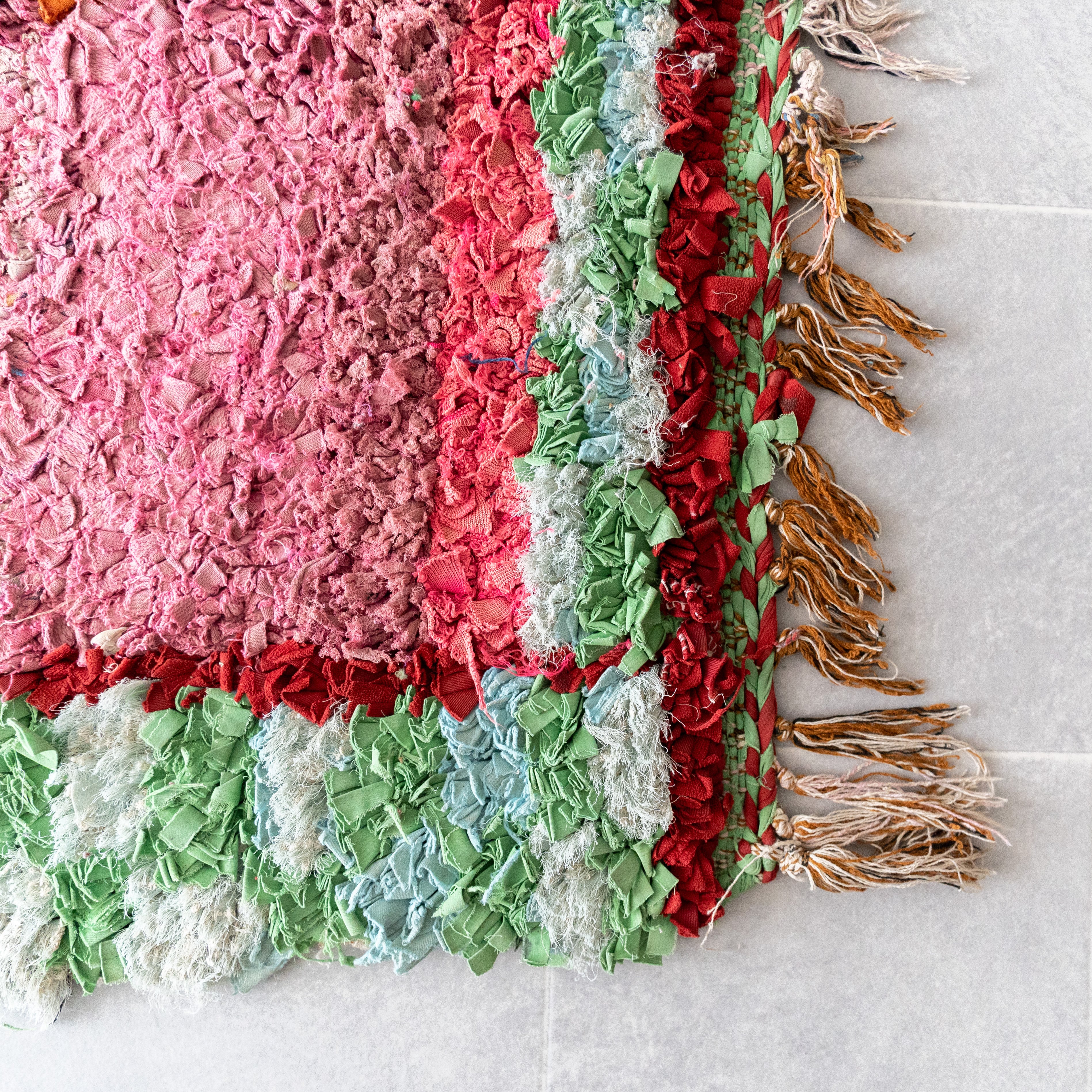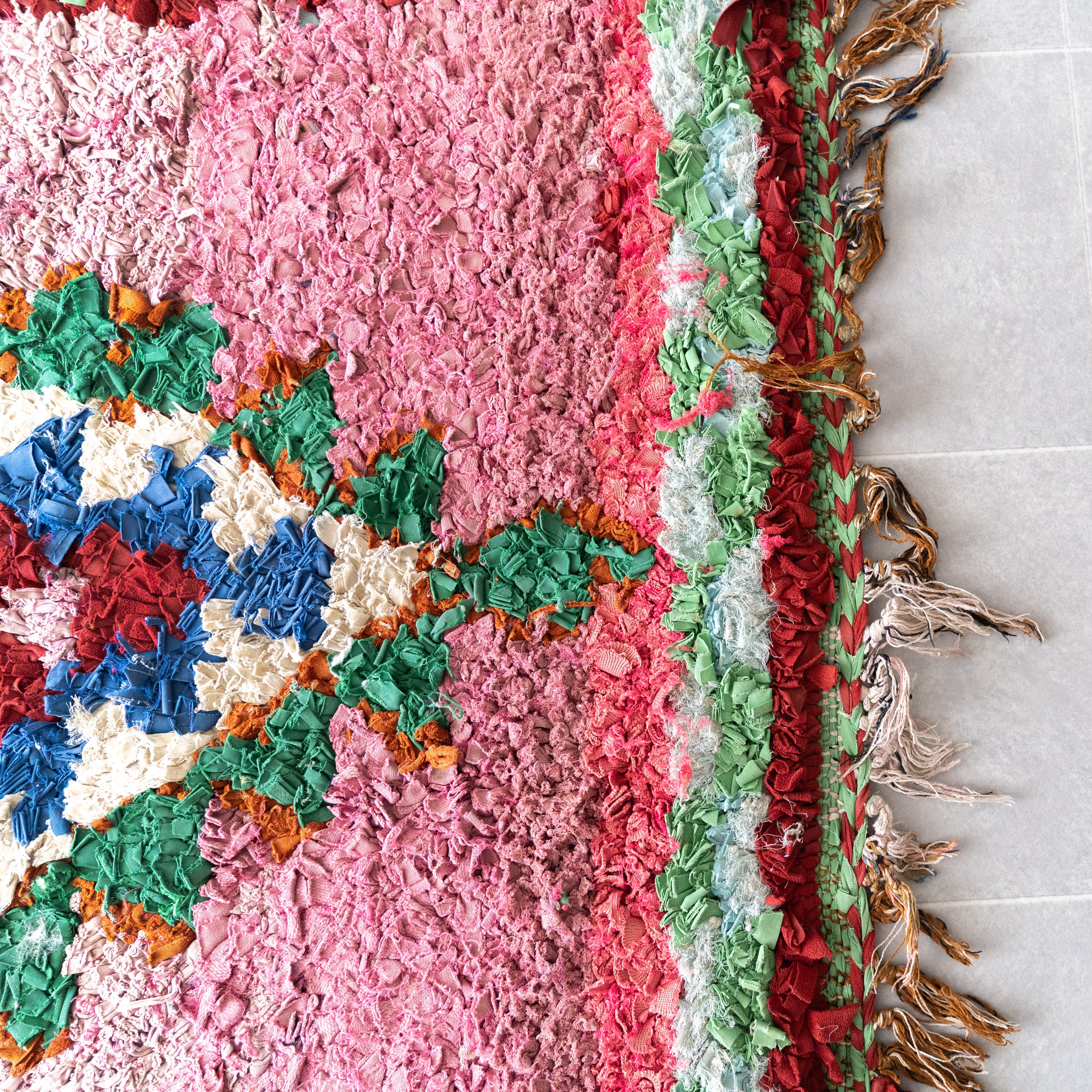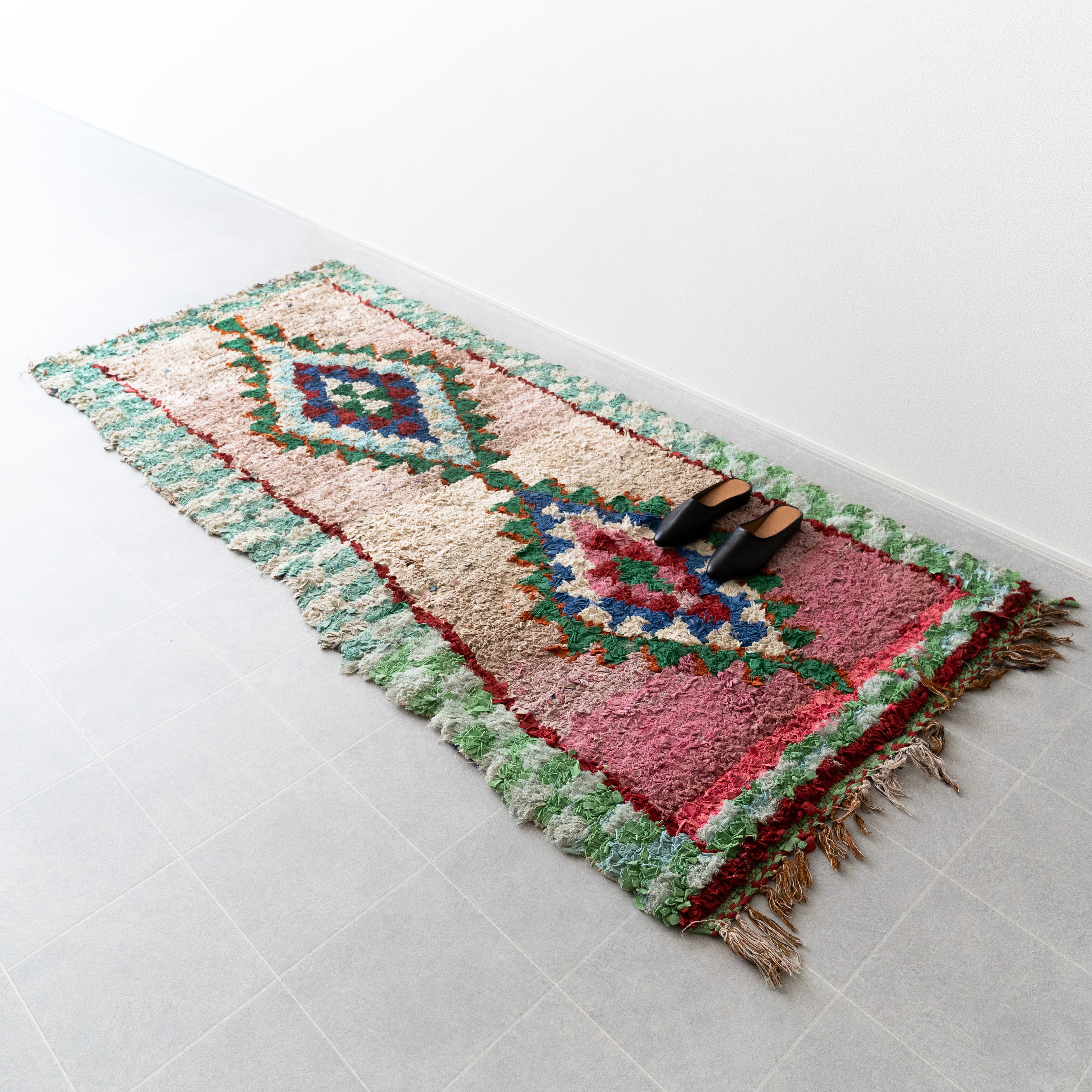 アトラス山脈をはじめ、モロッコ各地のベルベル村の女性達によって織られる絨毯、ボ・シャルウィット。素材は全て服の端切でできたリサイクル絨毯で、「シャルウィット」はベルベル語で端切れという意味です。遊牧生活から定住生活に変わったことで、羊を買う必要性がなくなったことから、リサイクルが得意なベルベルの女性たちは羊の毛の代わりに自分たちの着なくなった服を裂いて織り始めました。ウールのラグよりも歴史が浅いため、「家のために」「嫁入り道具として」織られた古いボ・シャルウィットは今では見つかりにくくなりました。