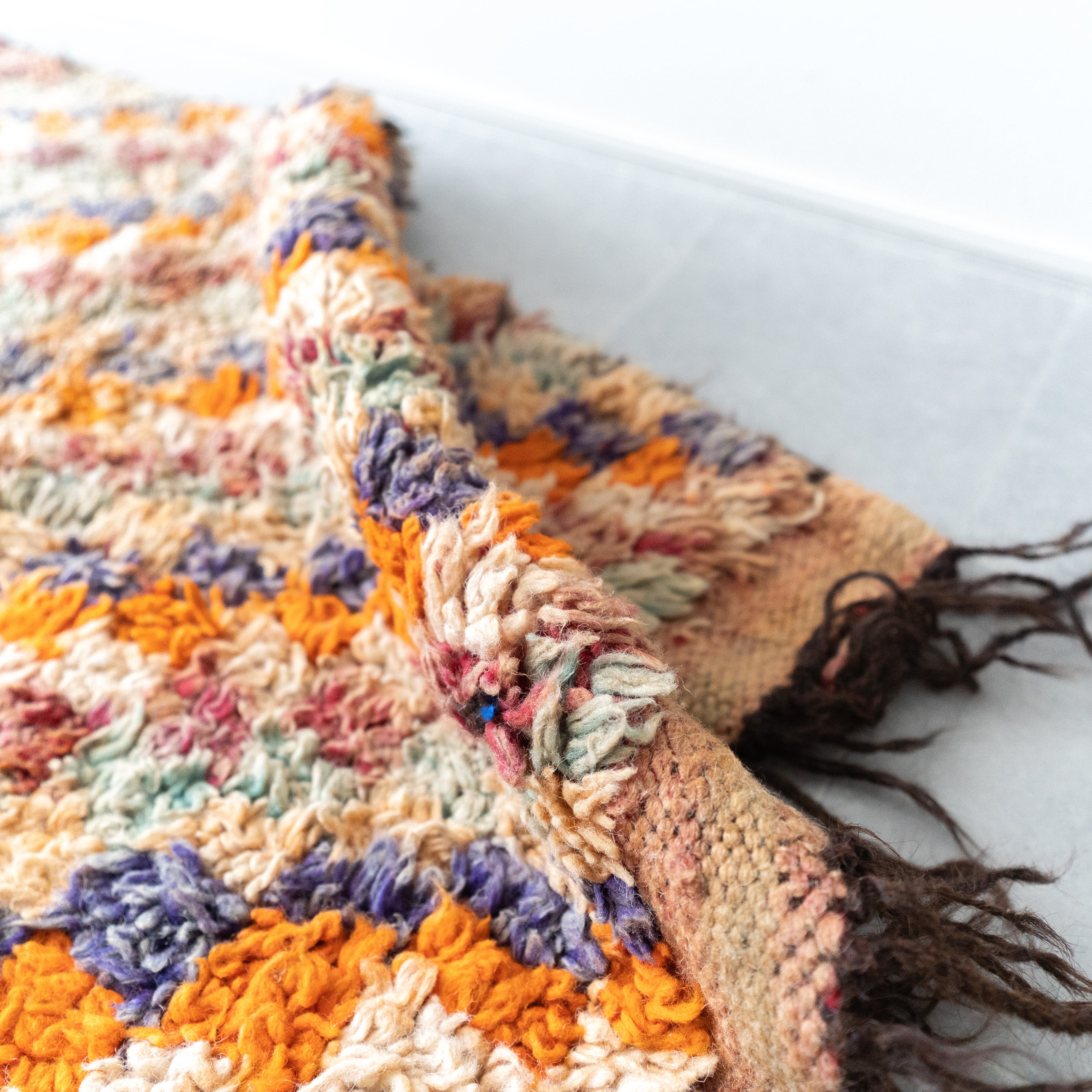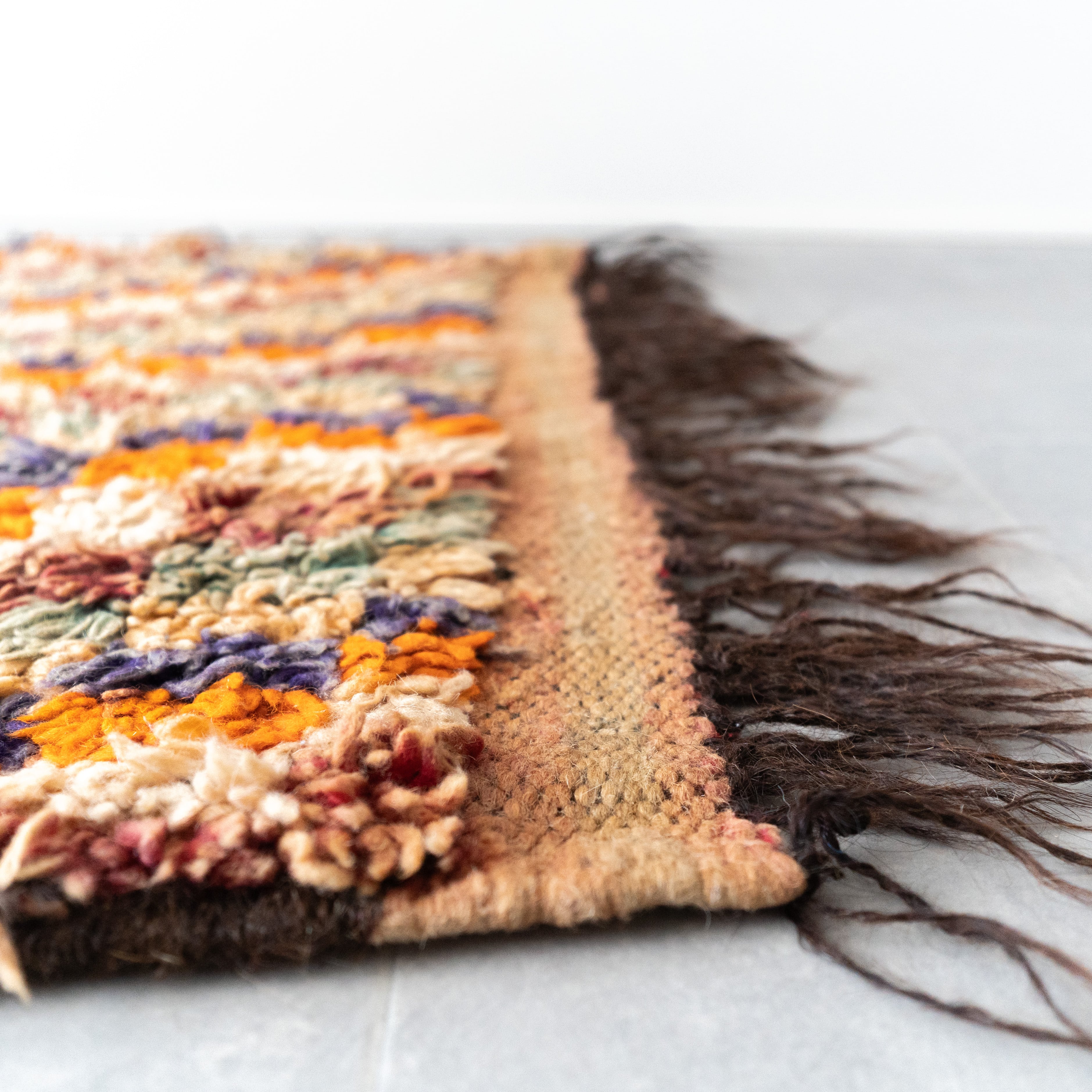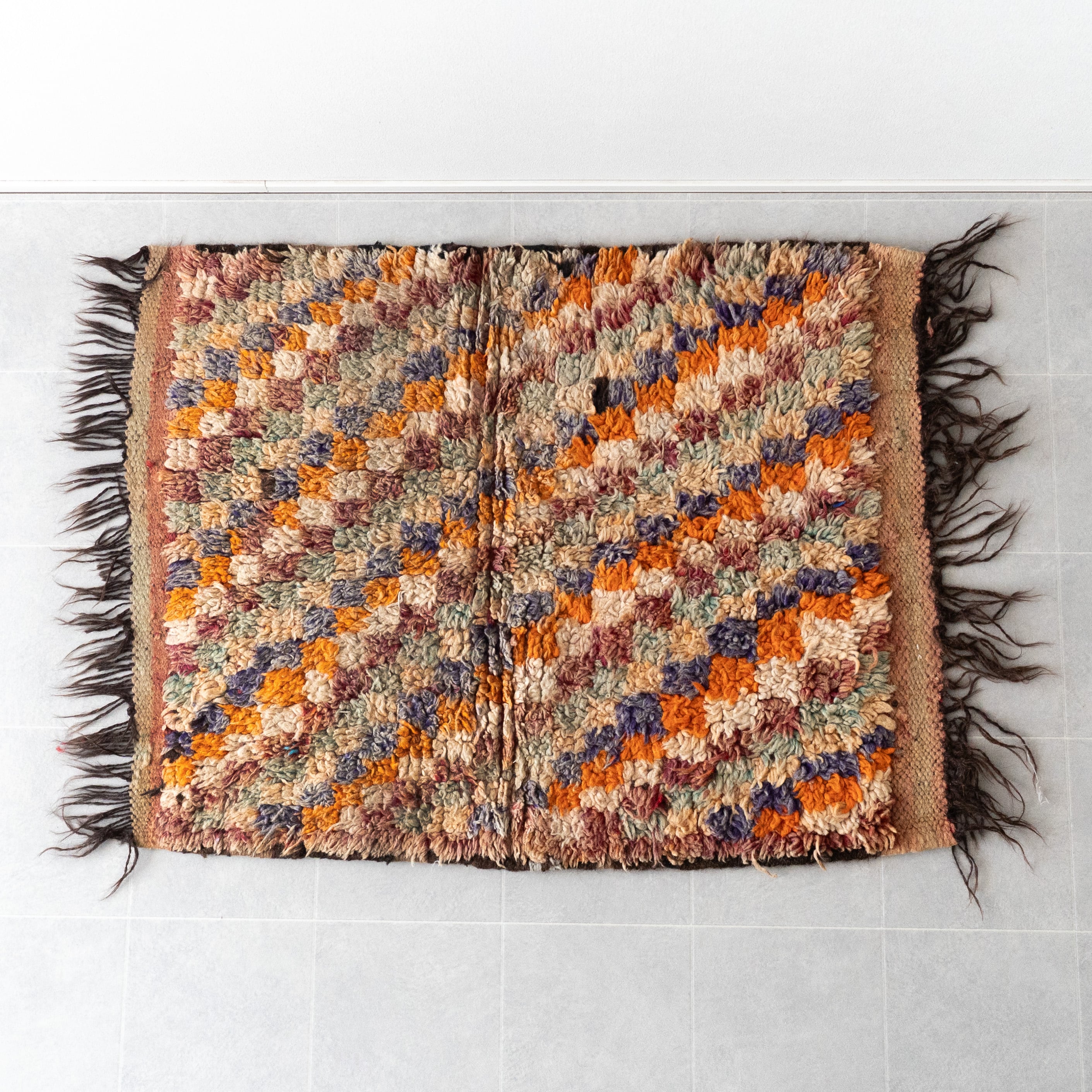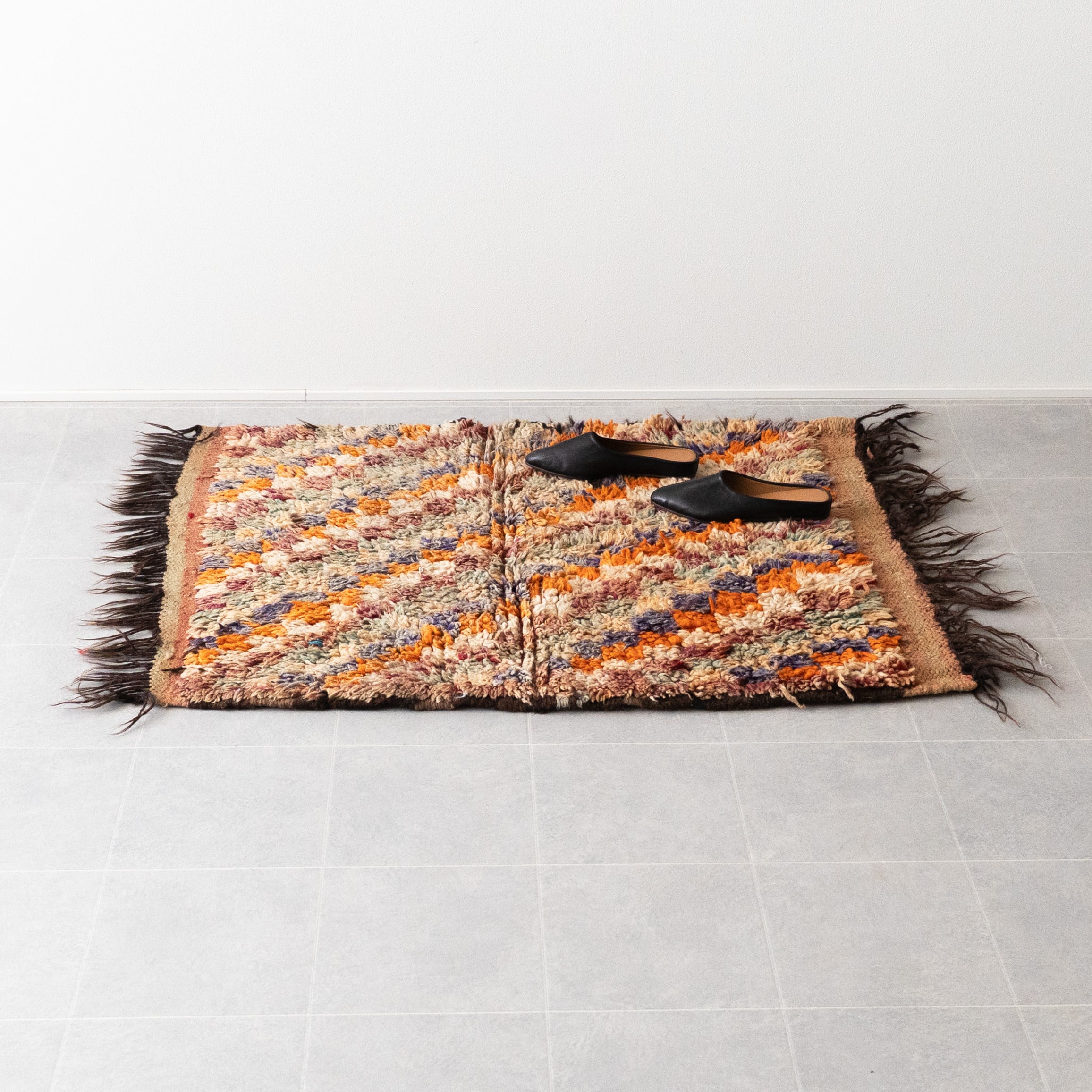 アジラルラグのヴィンテージ。落ち着いたトーンのオレンジを基調にモザイクタイルのように散りばめられたカラーがモダンな雰囲気のラグです。サイドのダークブラウンのフリンジが全体をキリリと引き締め。明るいカラーですが経年による褪色で落ち着いたトーンにまとまって大人な印象です。