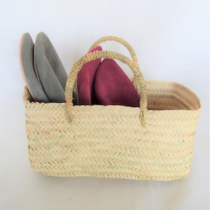 モロッコの職人の手によって一つ一つ丁寧に作られた「使いこむほどに味わいを増す」ヤシの葉のカゴ。可愛い横長のデザインにハンドルを付けたマルシェバッグです。
