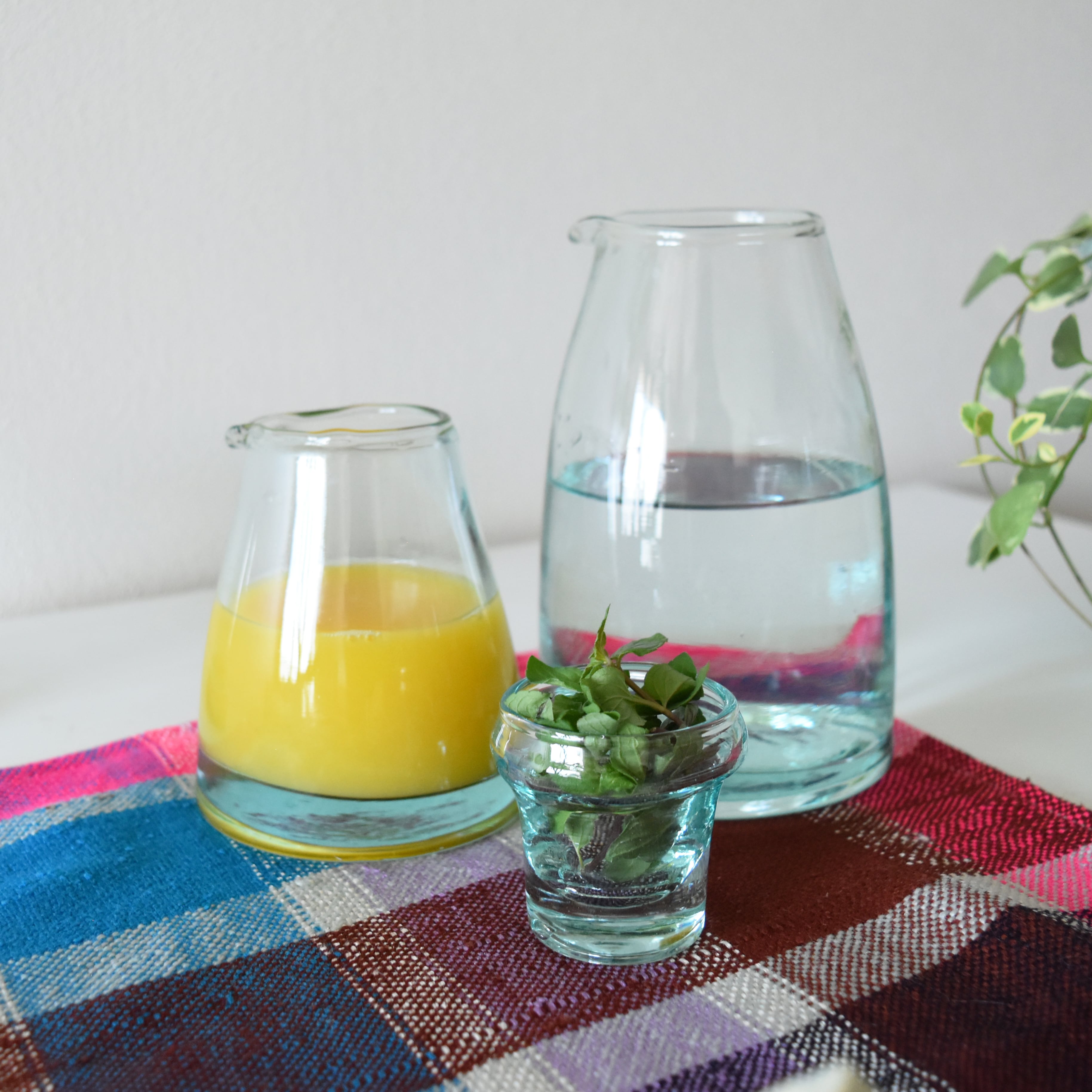 シンプルにウォーターカラフェとして。ミニグラスは蓋にして使っても良し、ミントやレモンなどを差してサーブしても素敵です。