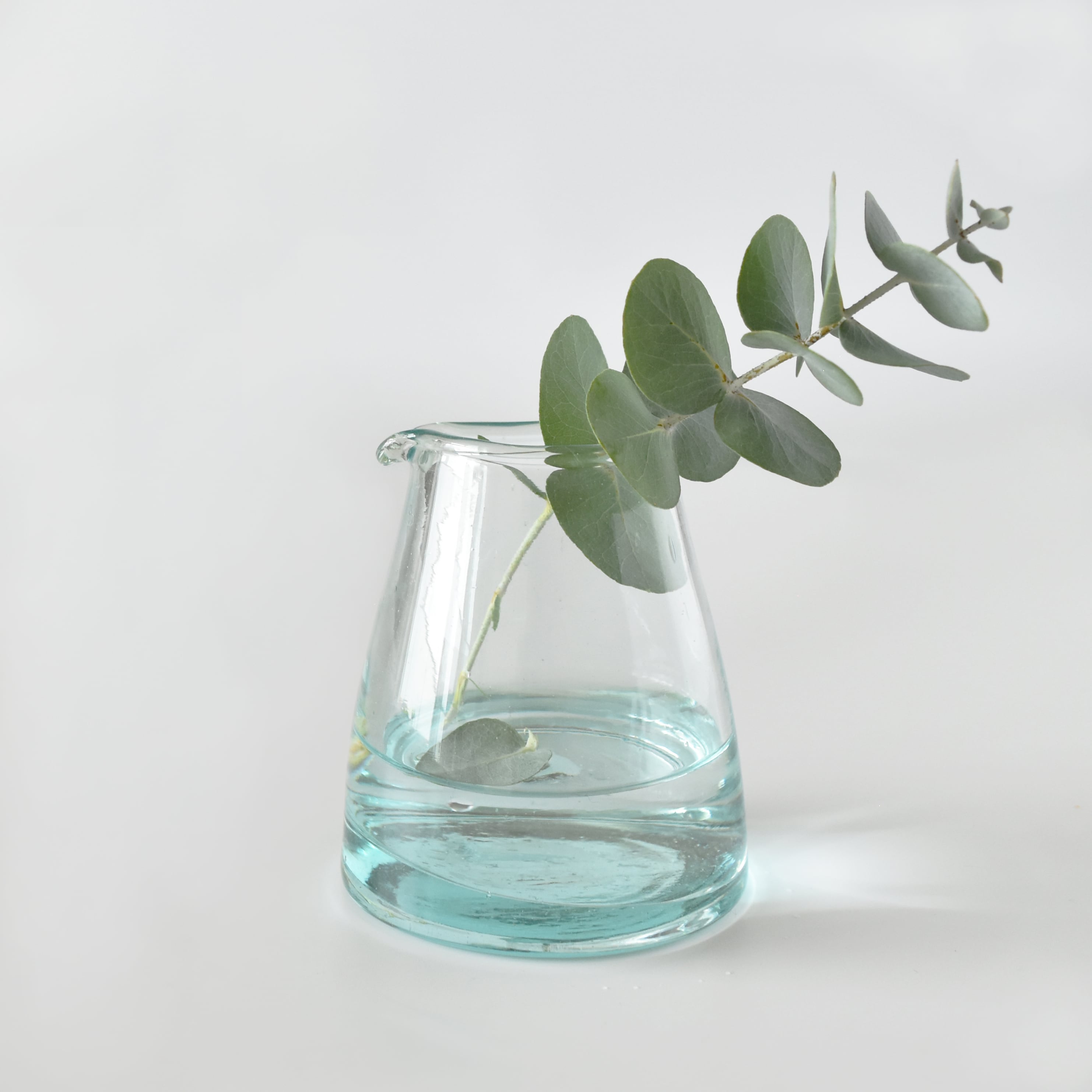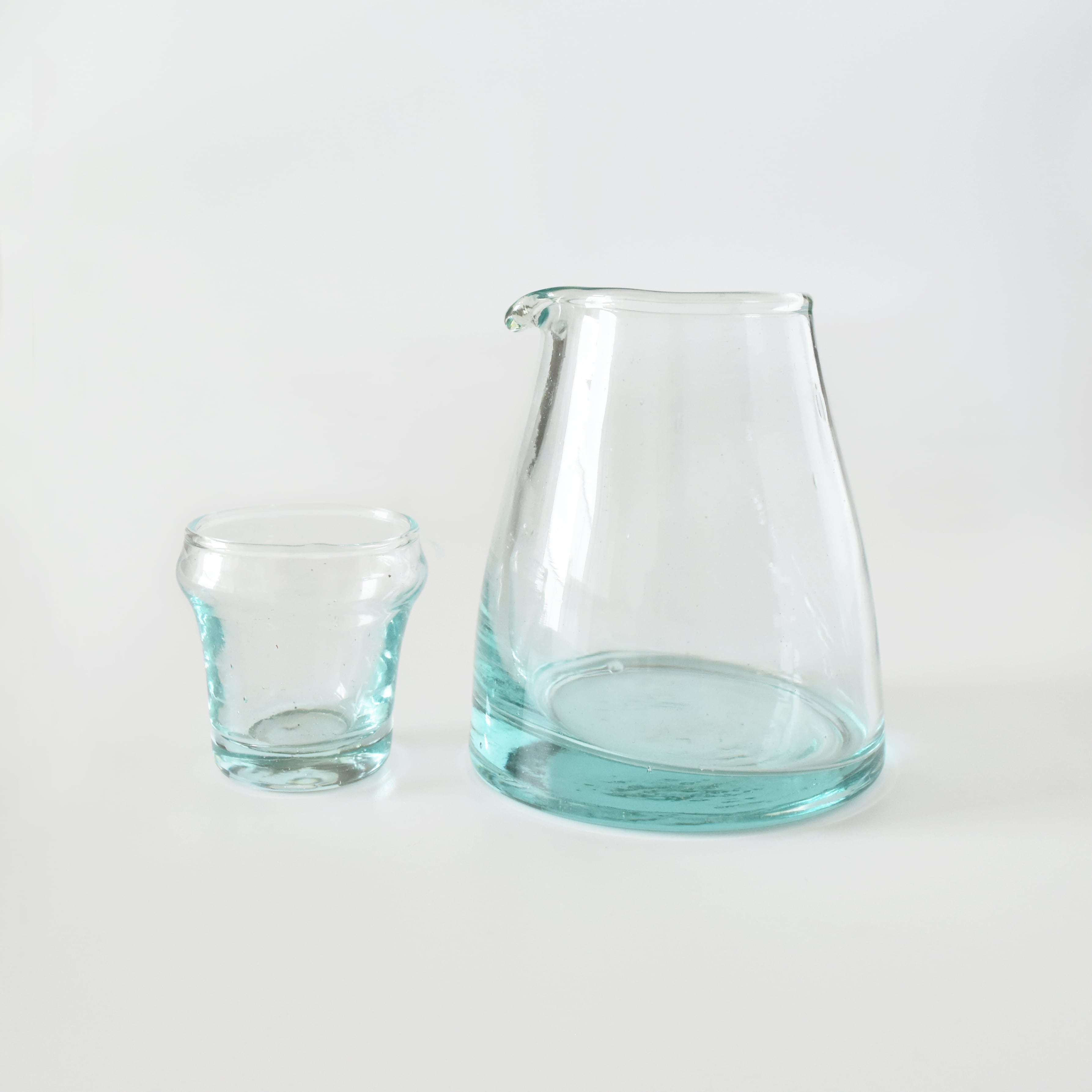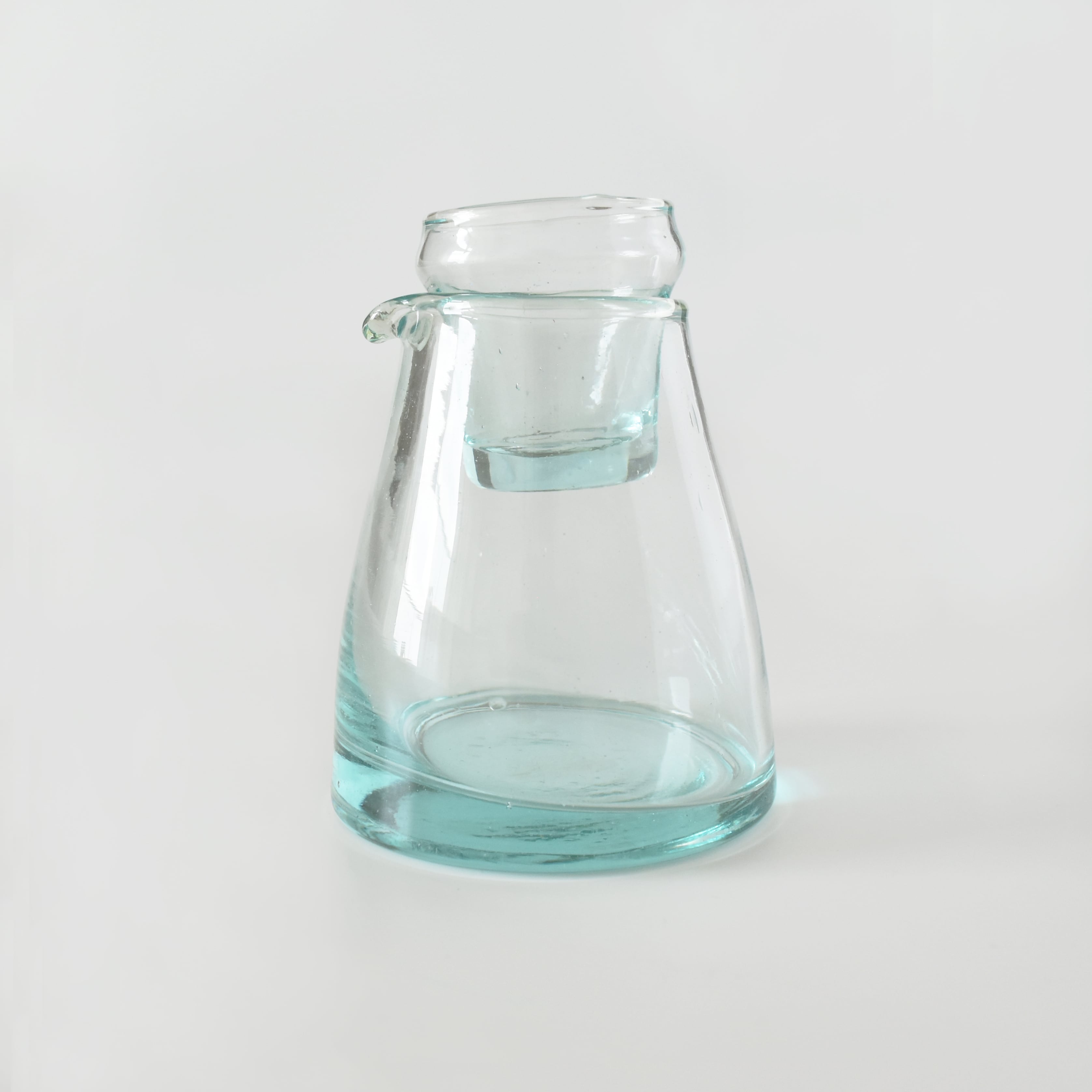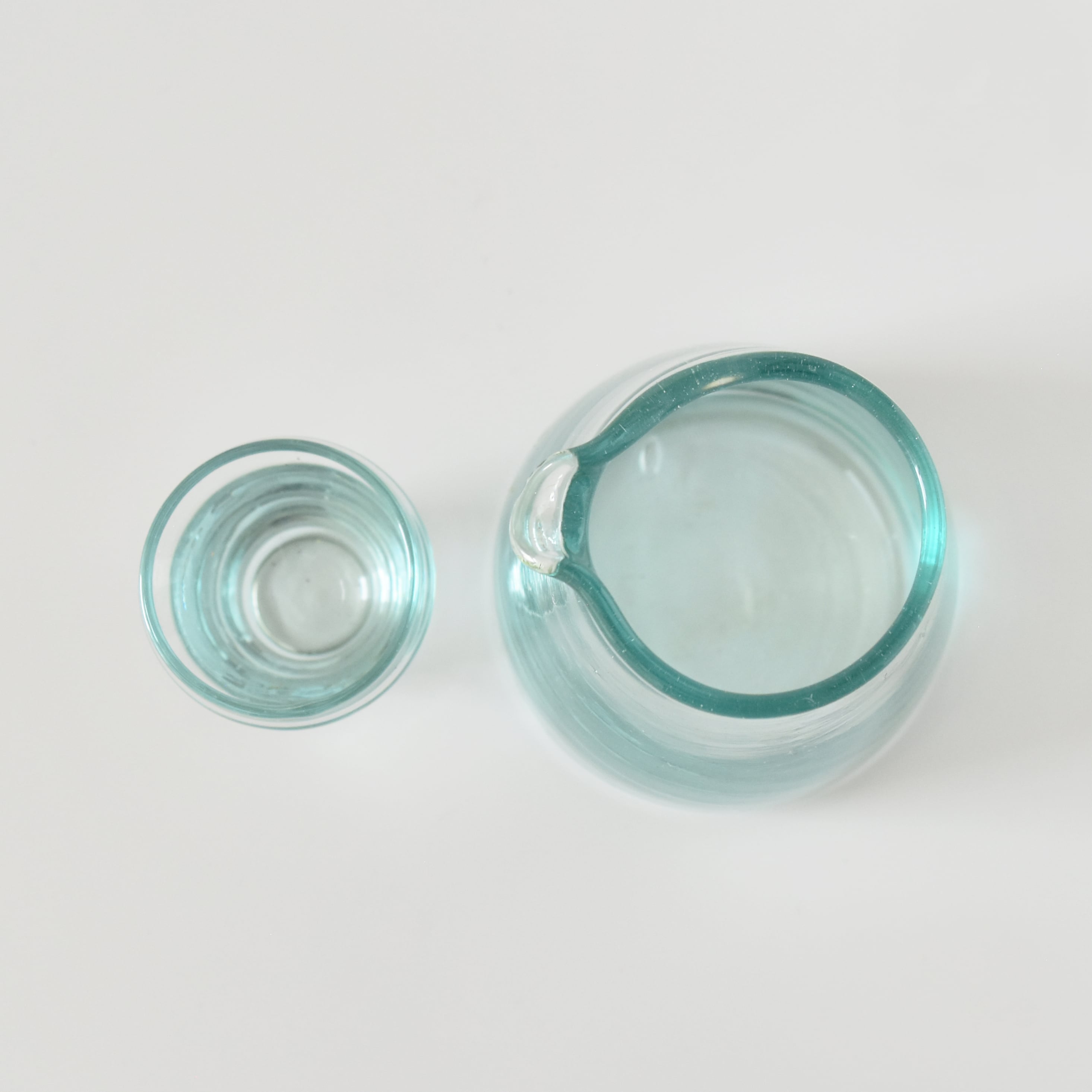 再生ガラスならではの爽やかなラムネ色に、とろりとした滑らかなな質感が特徴のグラス。ボトムがふくらむフォルムが可愛いカラフェです。蓋にもなるミニグラス付き。