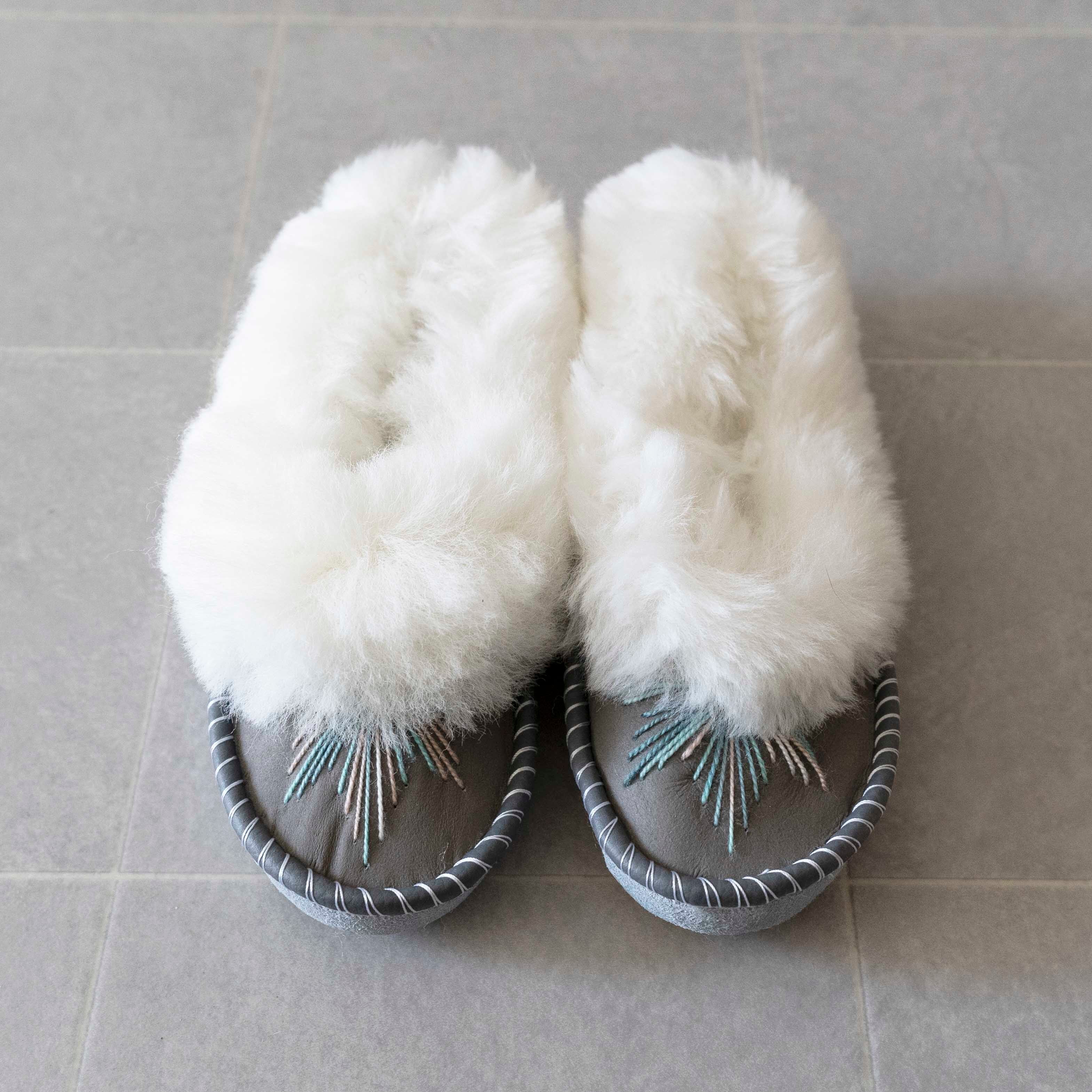 上質なイギリス産のムートン×スウェードに手刺繍が施されたルームシューズ。