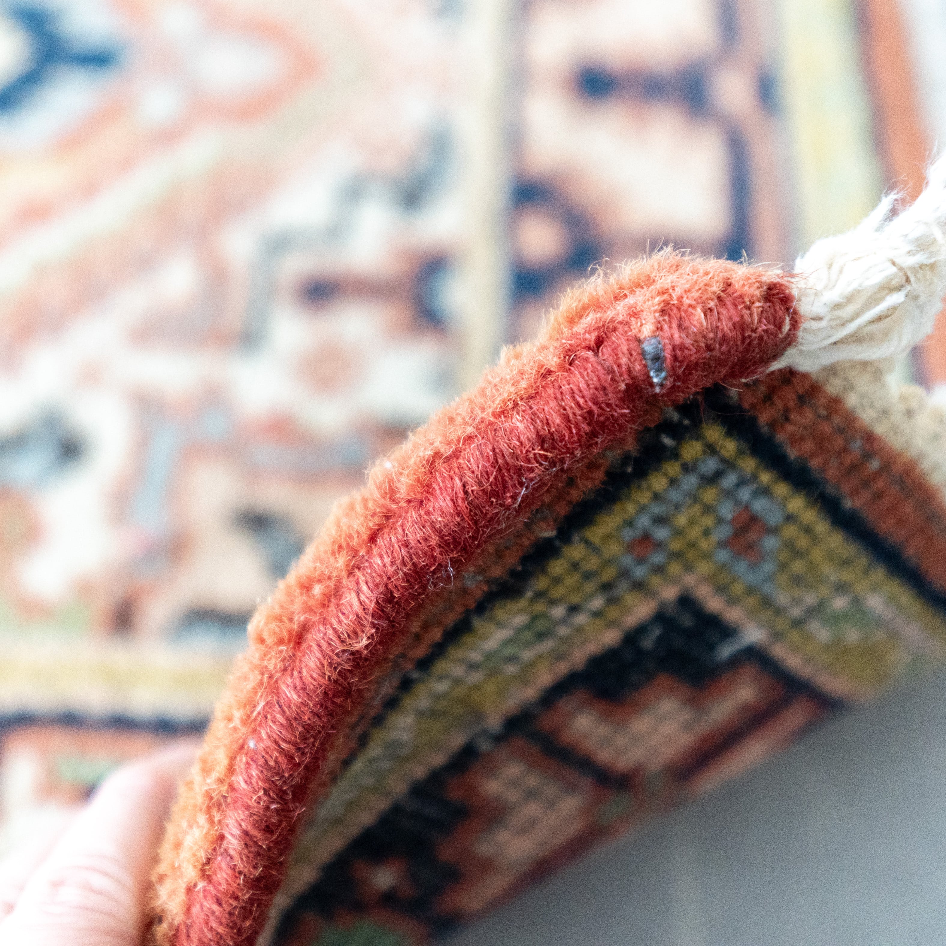 落ち着いたベージュトーンでまとめられたウールラグ。古典的な細やかな文様が全体に散りばめられた1枚です。多色使いですがヴィンテージならではの色褪せでモダンな雰囲気に仕上がっています。サイズ的に玄関やリビングのアクセントラグに。ベッドサイドに敷いても素敵です。