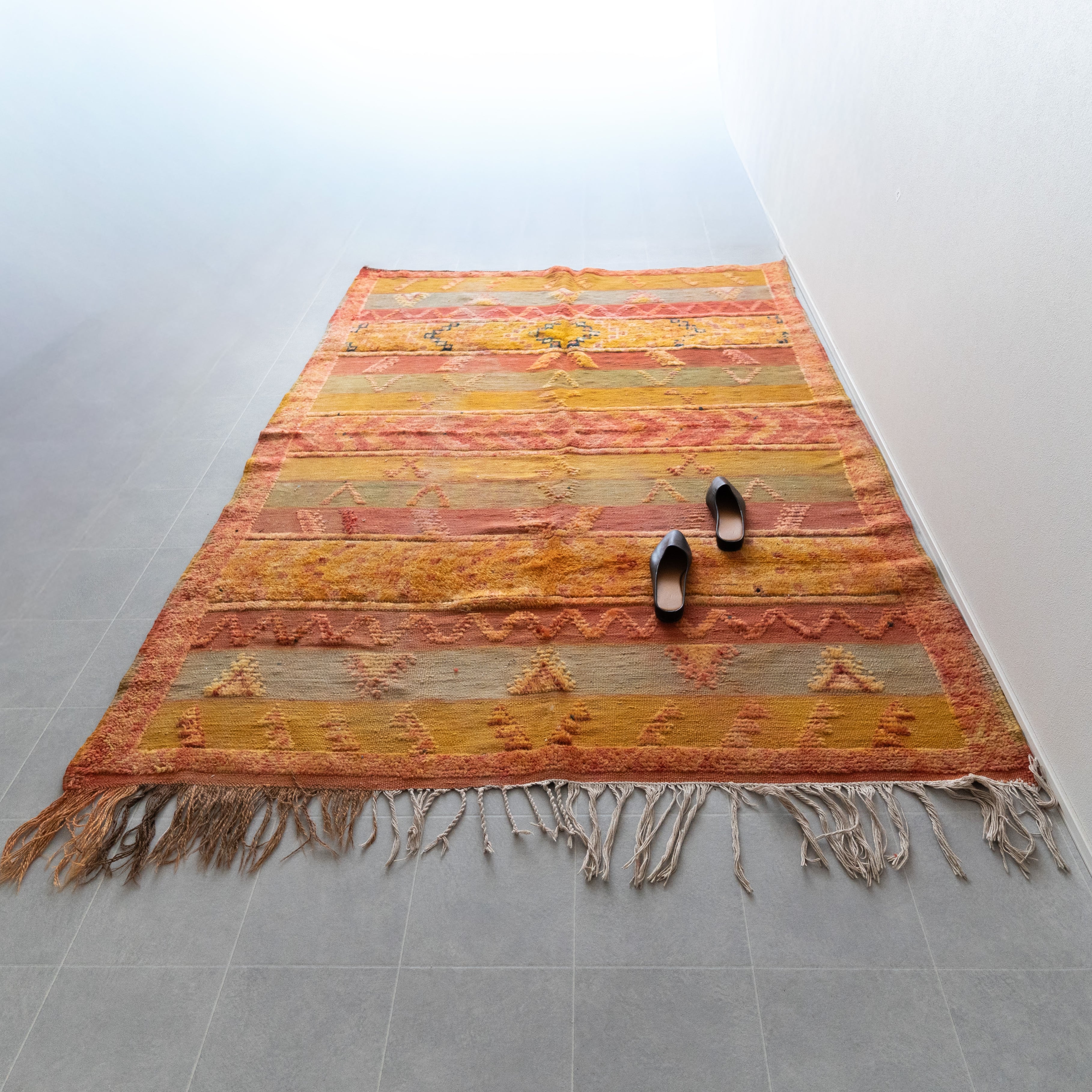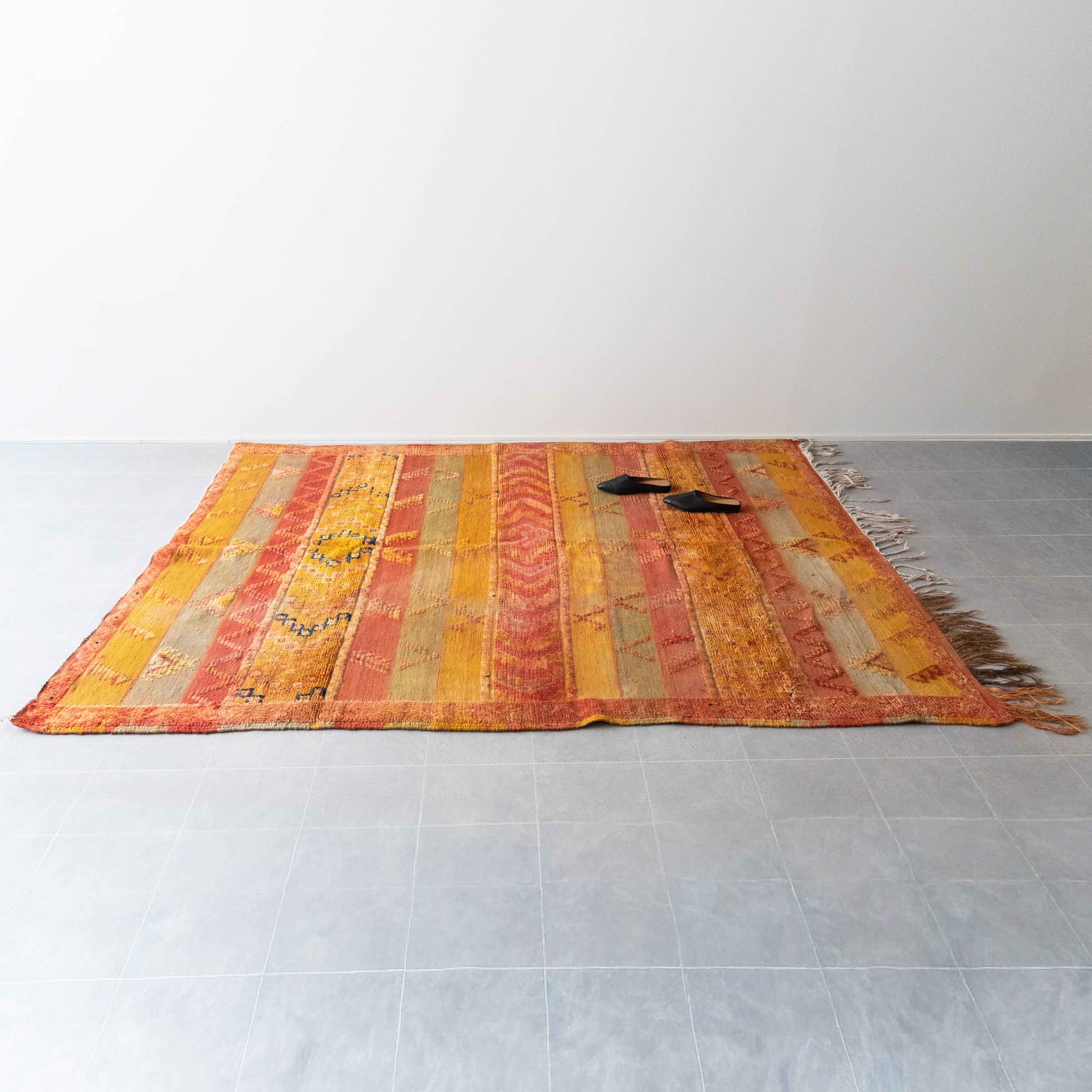 ブジャドとキリムの織りを混ぜたヴィンテージラグ。細かな刺繍が全体に入っているとても凝ったデザインです。イエローを基調とした配色ですが、経年による色褪せでトーンが強すぎず、綺麗な色に馴染んでいます。オークやチークといったヴィンテージ家具と合わせても綺麗な色味です。
