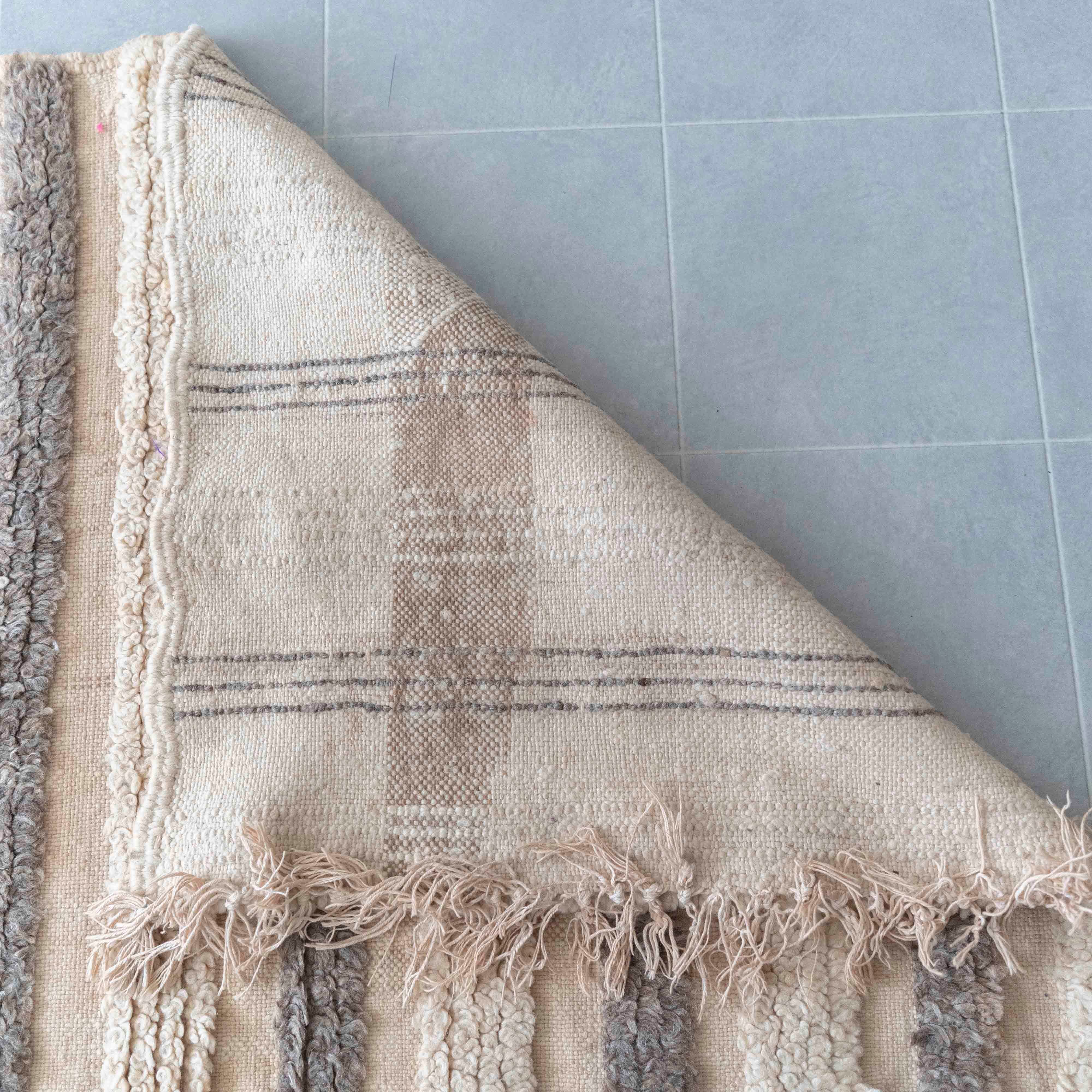ウールのヴィンテージラグ。ベージュを基調に、モコモコとした起毛したウールがデザインのアクセントになっています。シンプルで癖のないデザイン。玄関やリビングのアクセントラグに。木製ヴィンテージの家具と合わせると好バランスです。