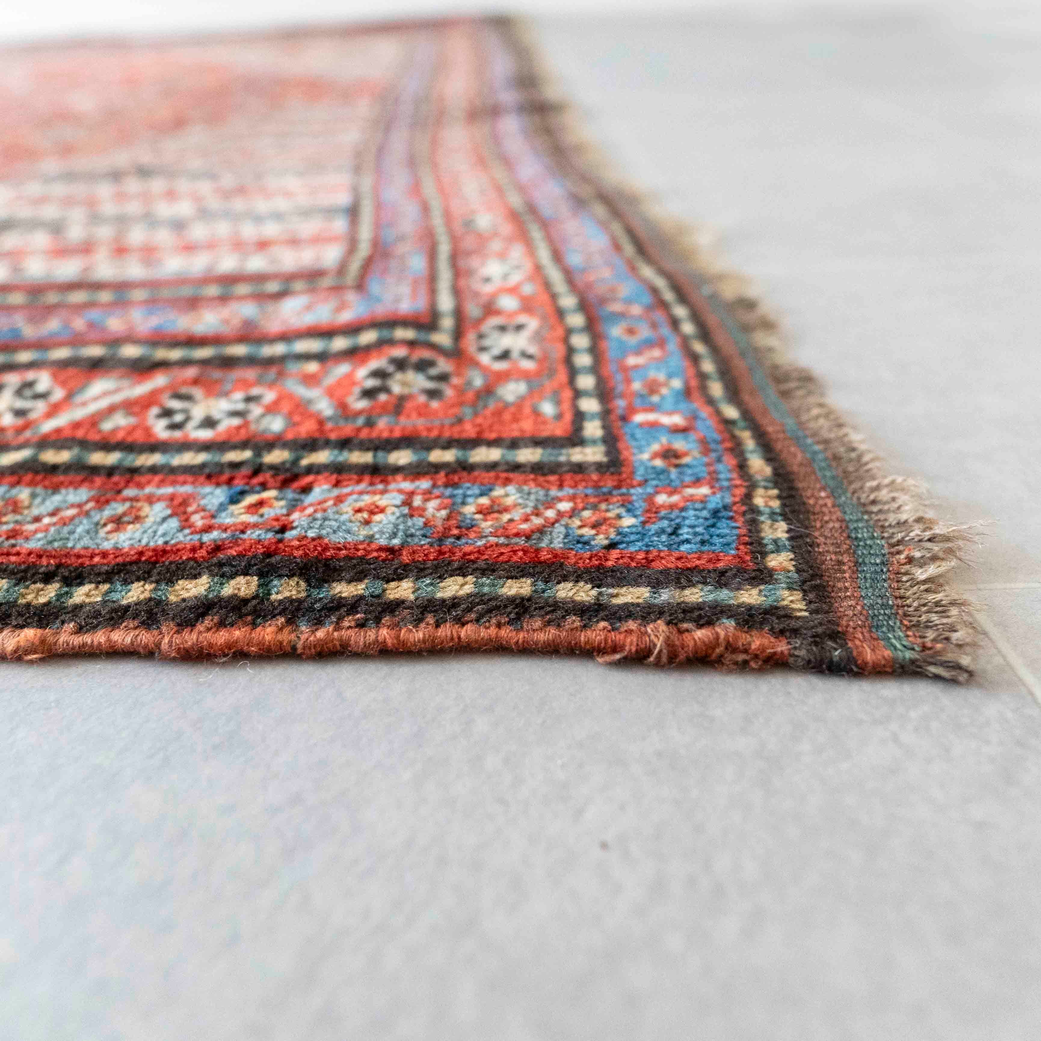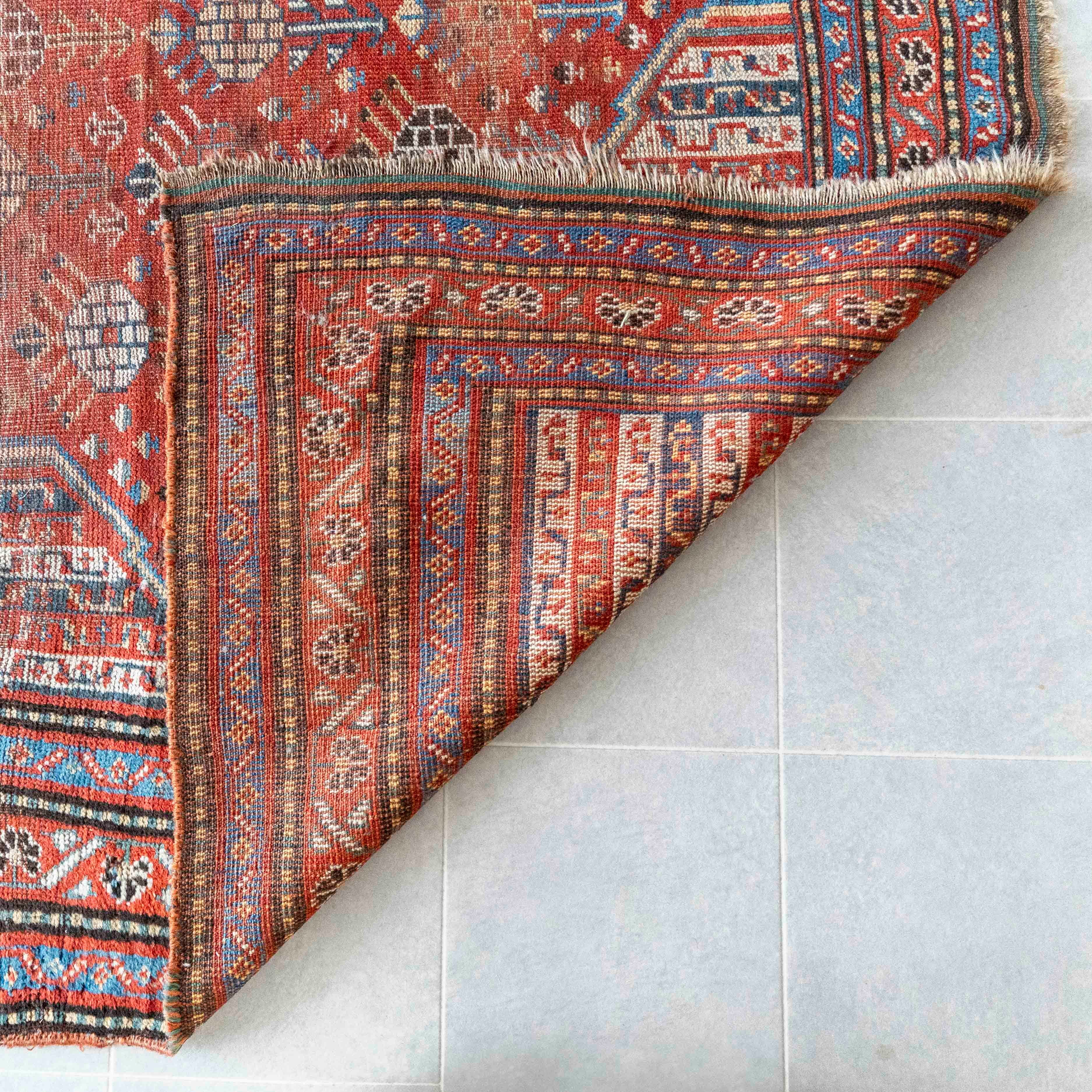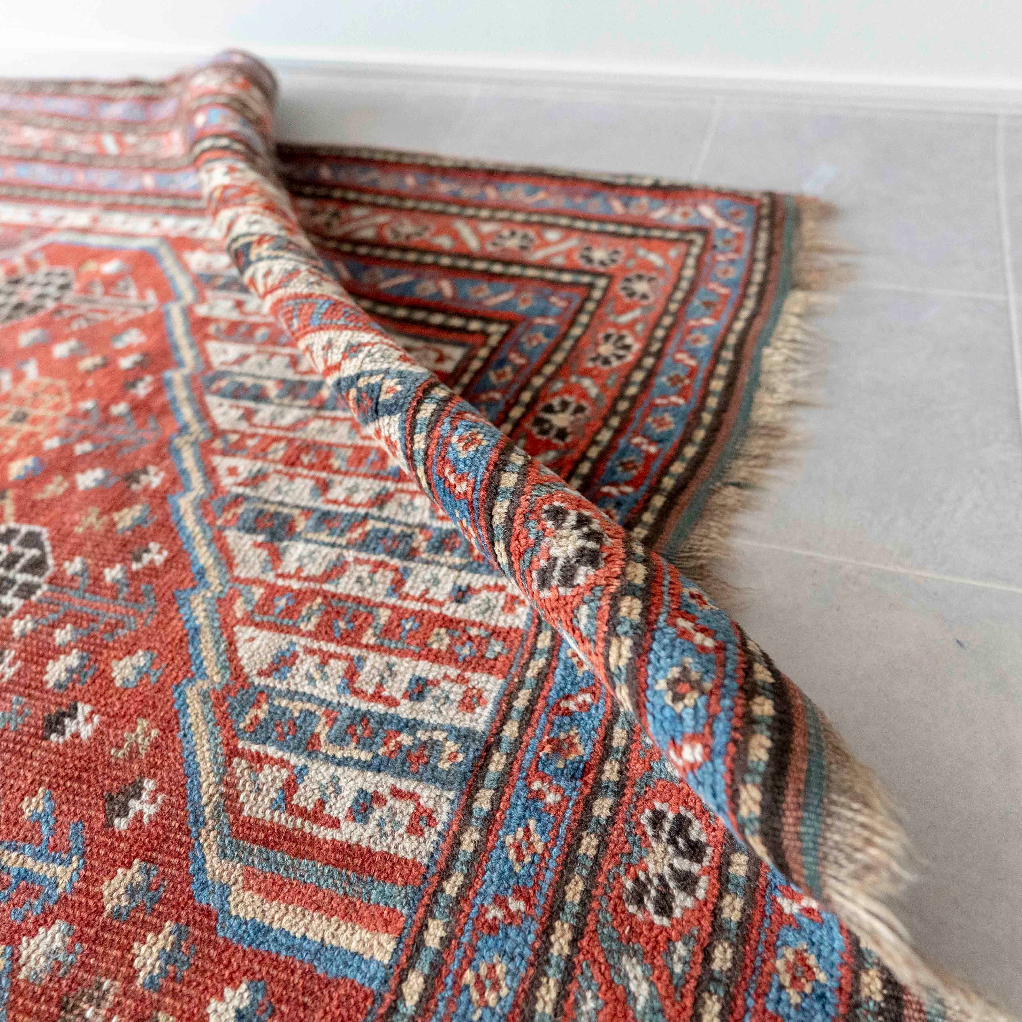 シックな朱赤に繊細なモチーフが散りばめられた1枚。チロリアンテープのような柄と配色が可愛らしくじっくりと眺めていたくなるようなラグです。経年による色褪せ、色馴染みによって朱赤が強く出すぎず、全体に綺麗に馴染んでバランスの良い仕上がり。